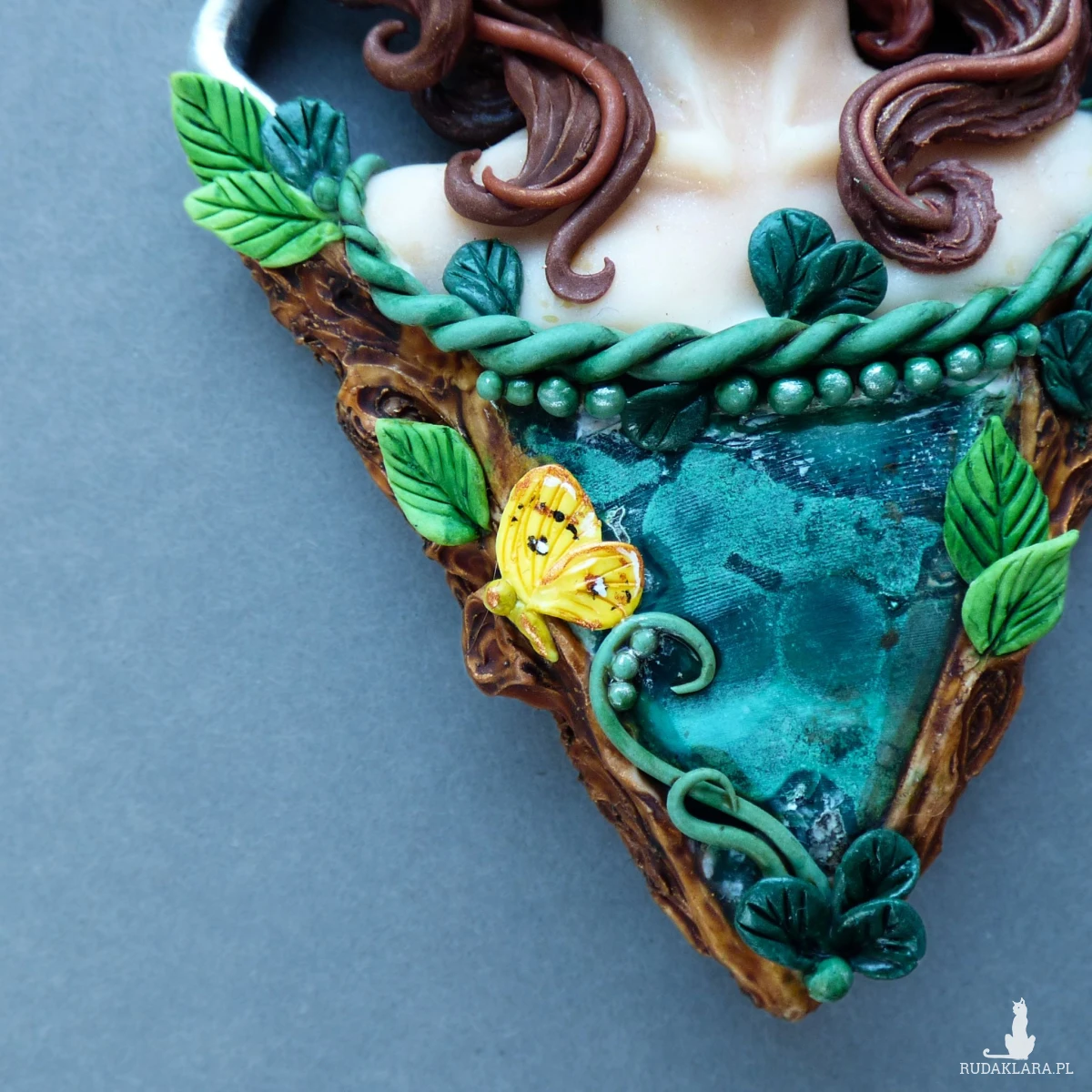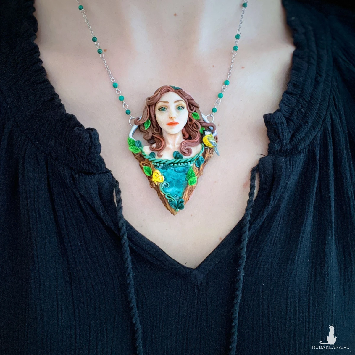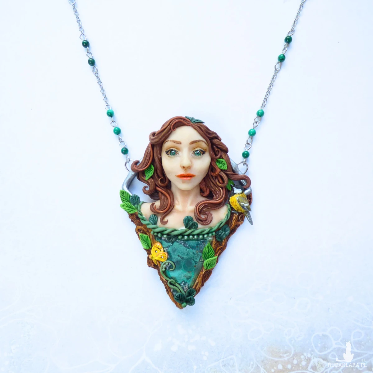 Baśniowy naszyjnik z malachitem, wykonany ręcznie z glinki polimerowej. Centralnym elementem kompozycji jest kobieca twarz otoczona motywami leśnymi. Towarzyszy jej również mała sikorka bogatka oraz motyl latolistek cytrynek. Całość dopełnia plaster surowego malachitu o pięknej, głębokiej zieleni i naturalnym rysunku. Dodatkowo w łańcuszek, na którym zawieszony jest naszyjnik, wplecione zostały kulki malachitu.