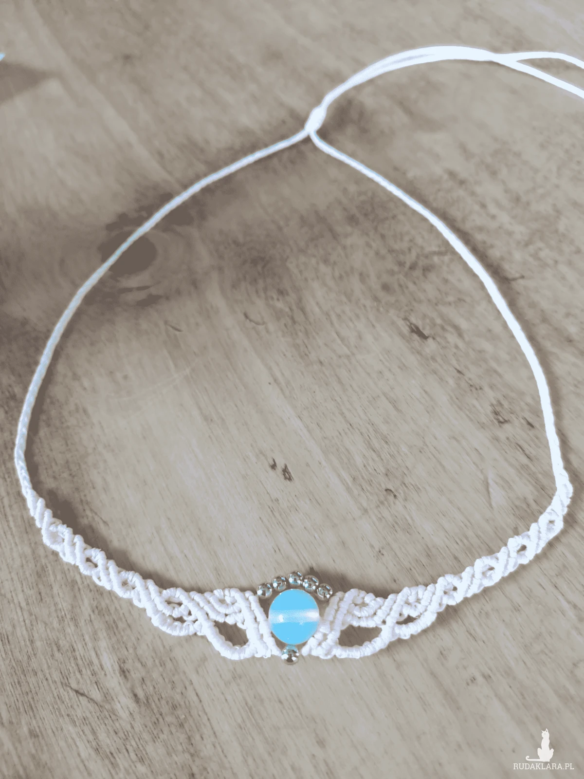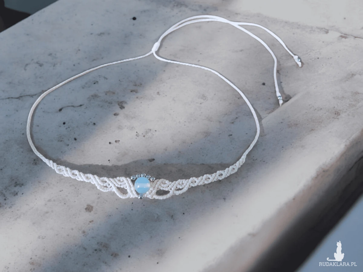 Delikatny naszyjnik w kolorze pudrowego różu wykonany techniką mikro makramy z kamieniem naturalnym Opalem, wykończony Stalą Nierdzewną na zapięcie regulowane. Woskowany poliestrowy sznurek jest wytrzymały i odporny na działanie wody.