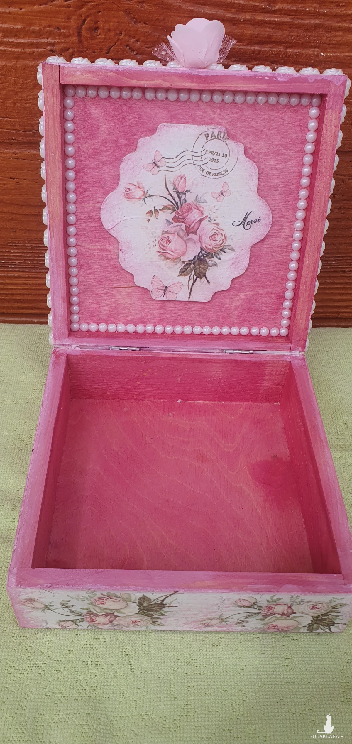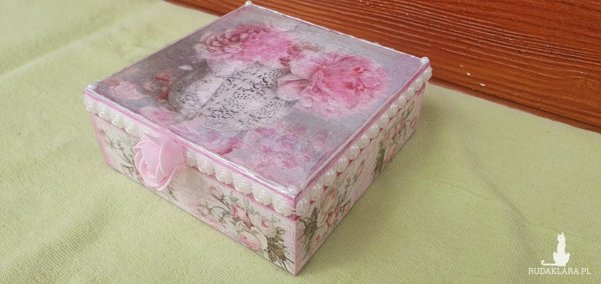 Wykonana metodą decoupage z wielką dbałością o szczegóły