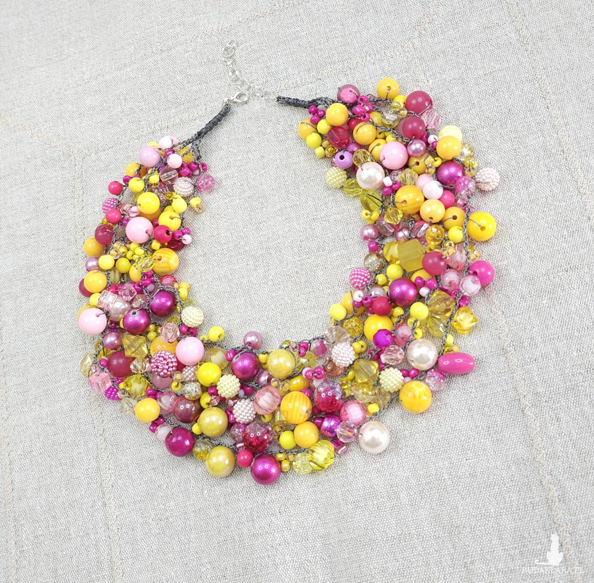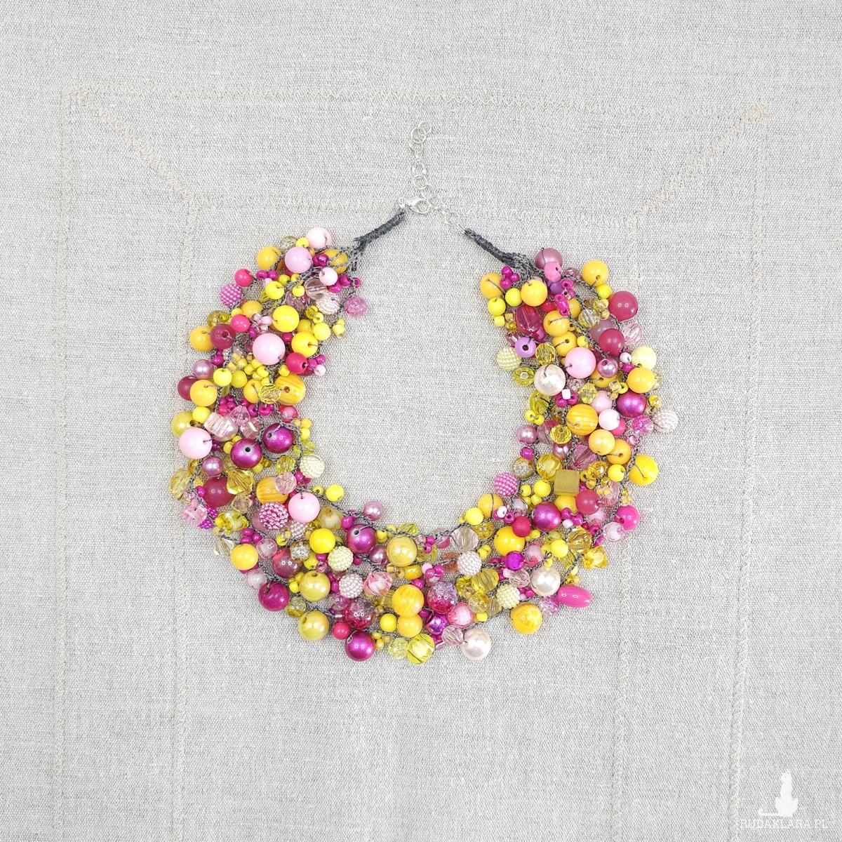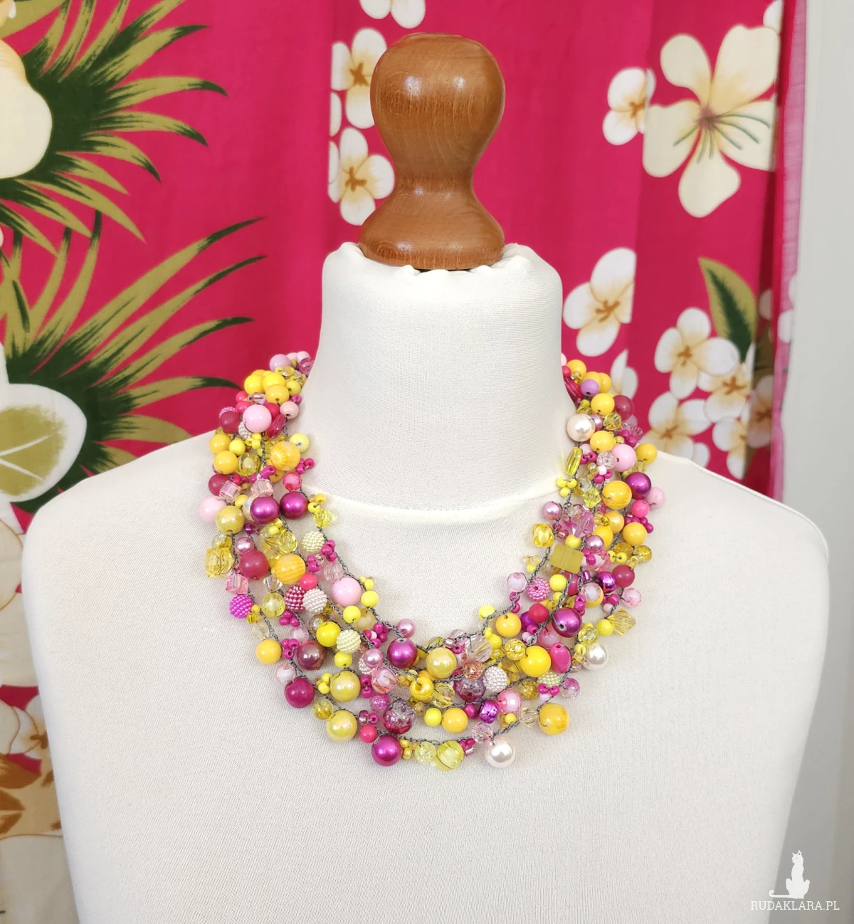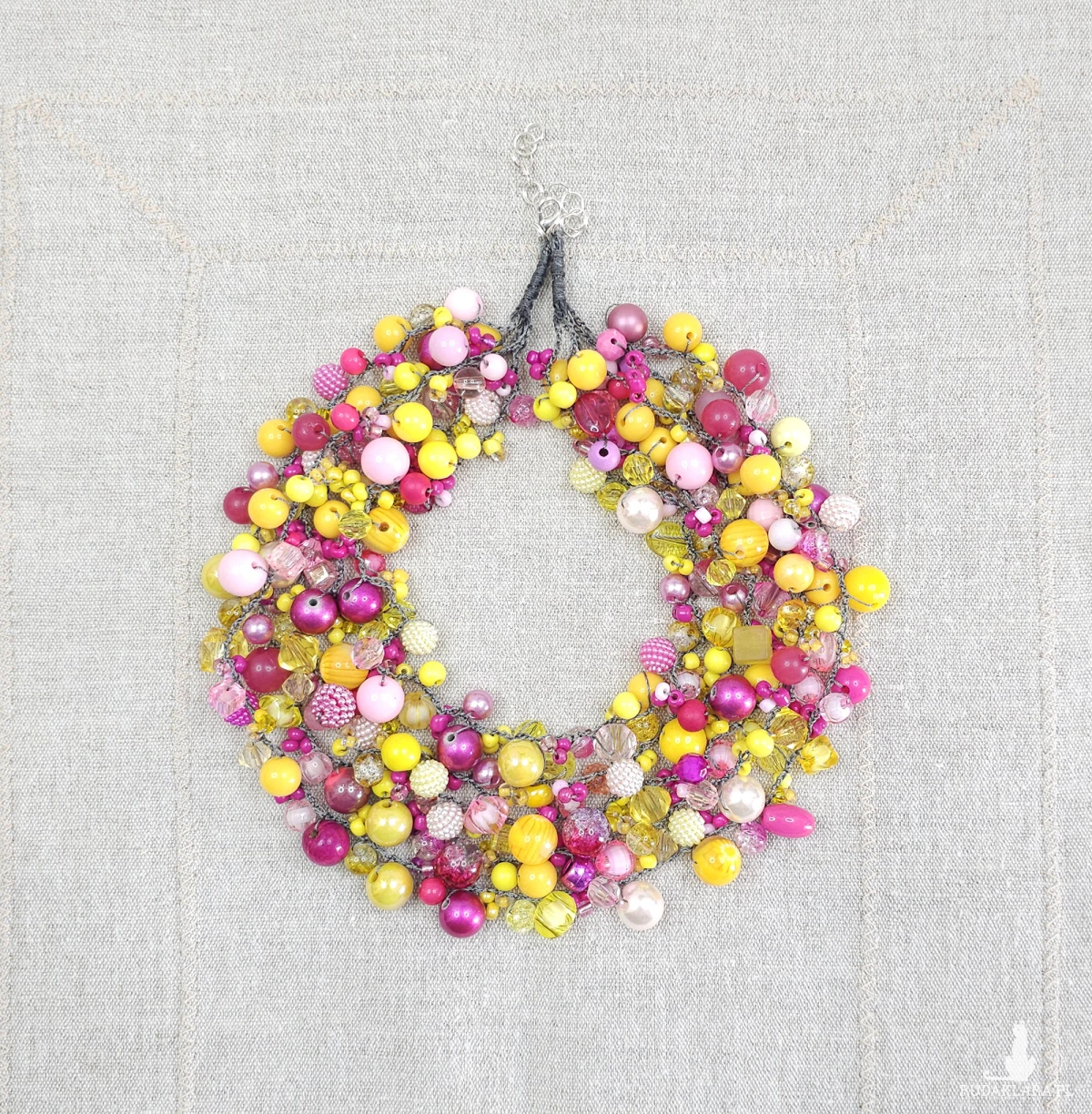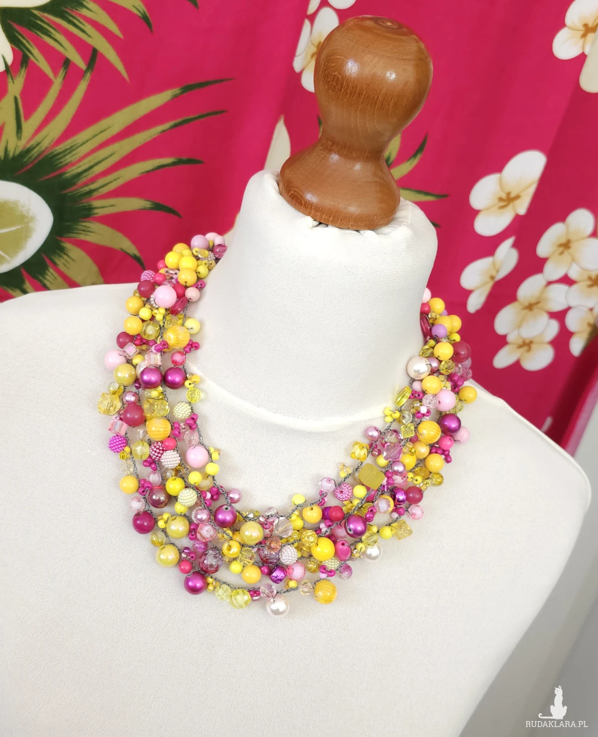 Ręcznie wykonany, bogaty naszyjnik typu "kolia" o gęstym splocie. Kompozycja składa się z koralików akrylowych i szklanych w różnych odcieniach żółci, fuksji oraz pudrowego różu.