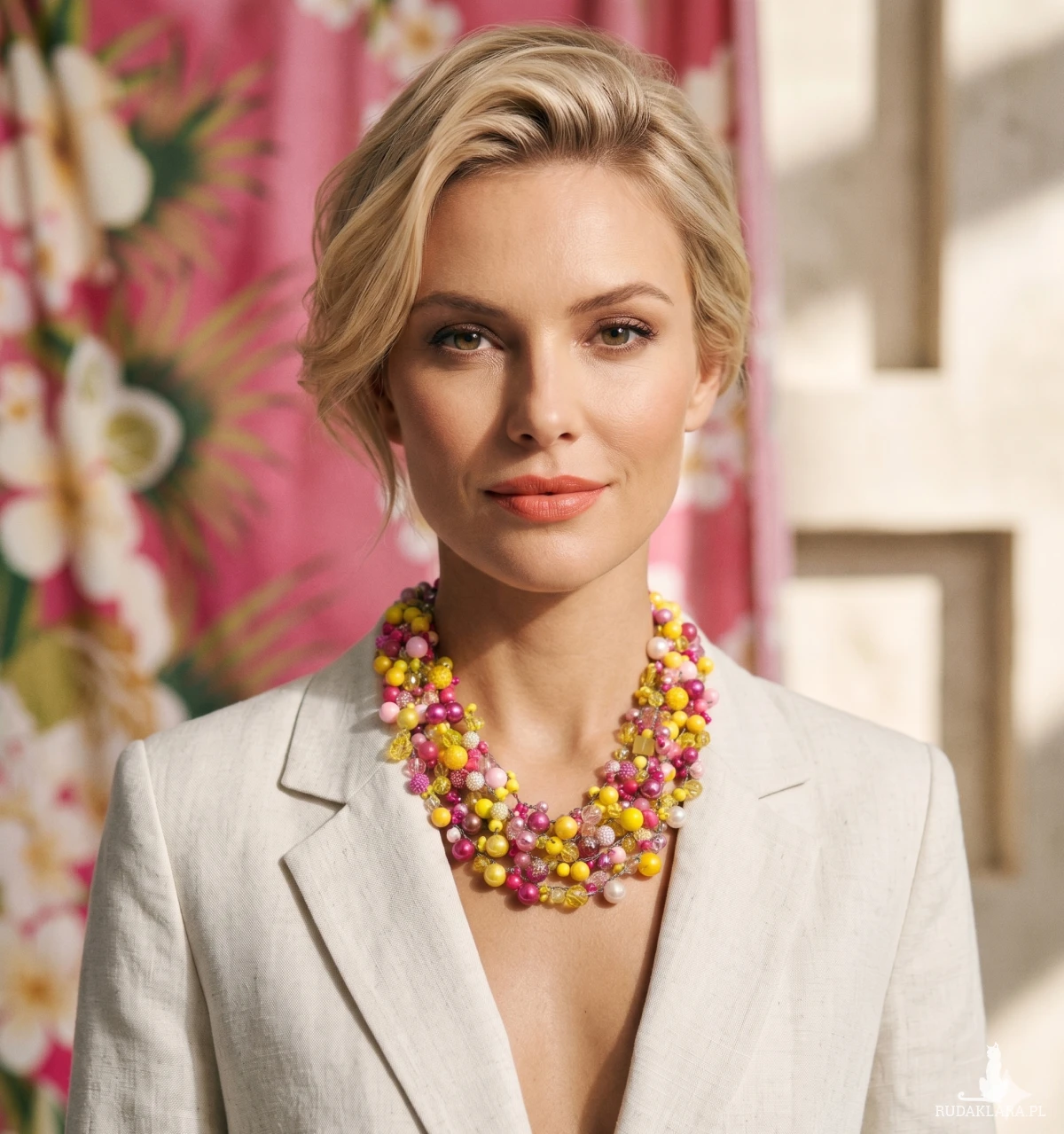 7062 różowy, żółty naszyjnik statement, kolia, korale