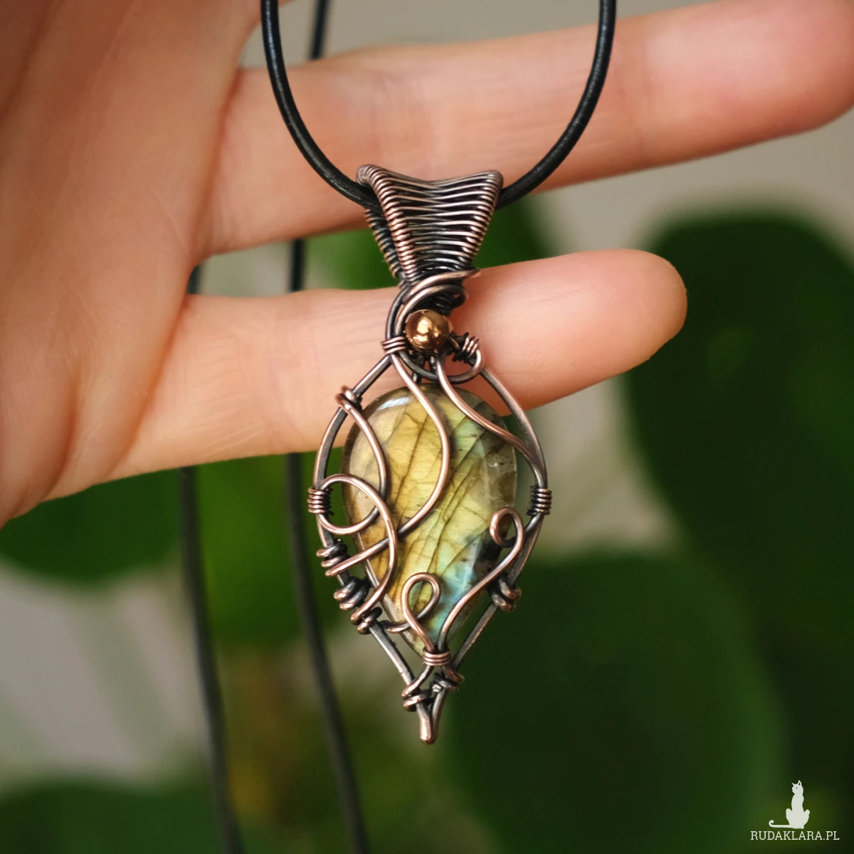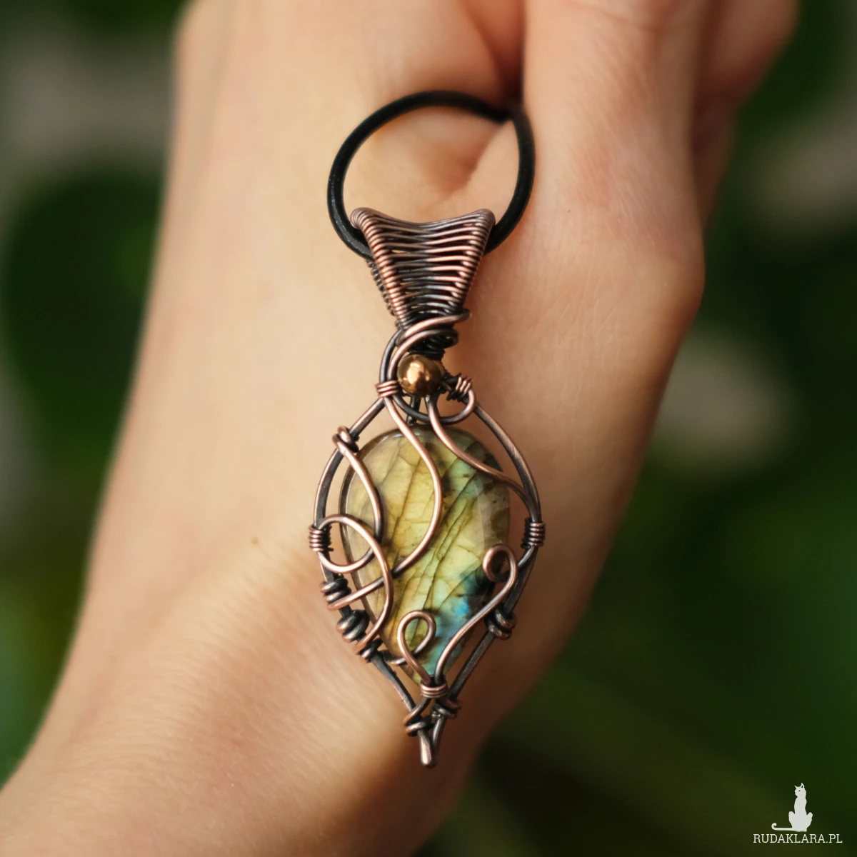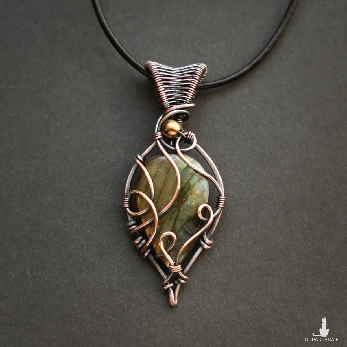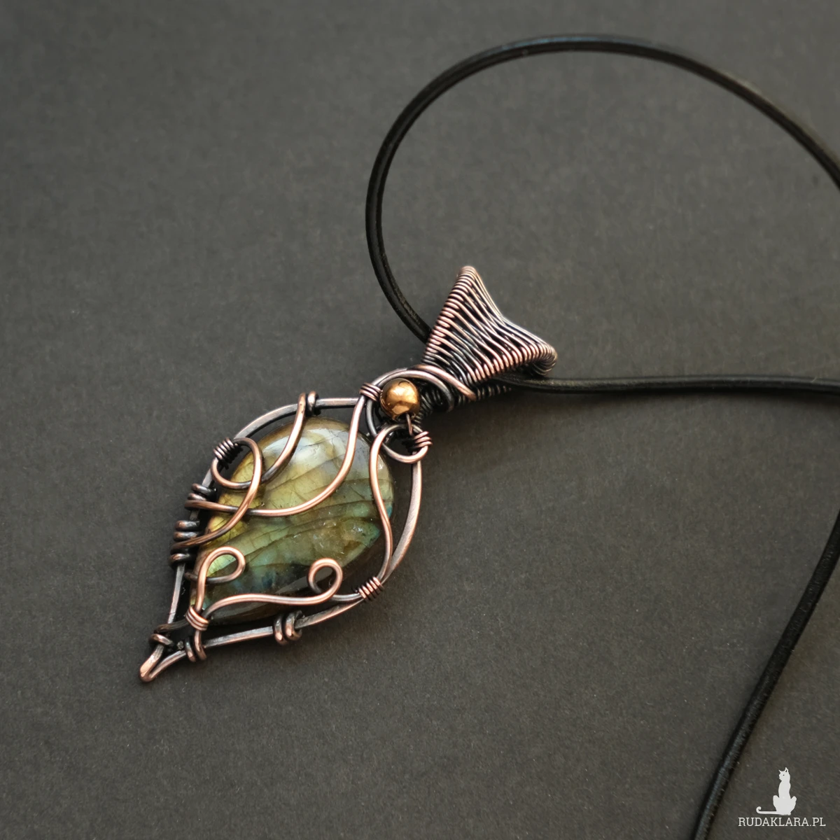 Piękny miedziany wisiorek w elfickim stylu z kamieniem labradorytu. Labradoryt to wyjątkowy kamień, który kochają kobiety. Użyty w oprawie kamień iryzuje w kolorze żółci z domieszką błękitu.