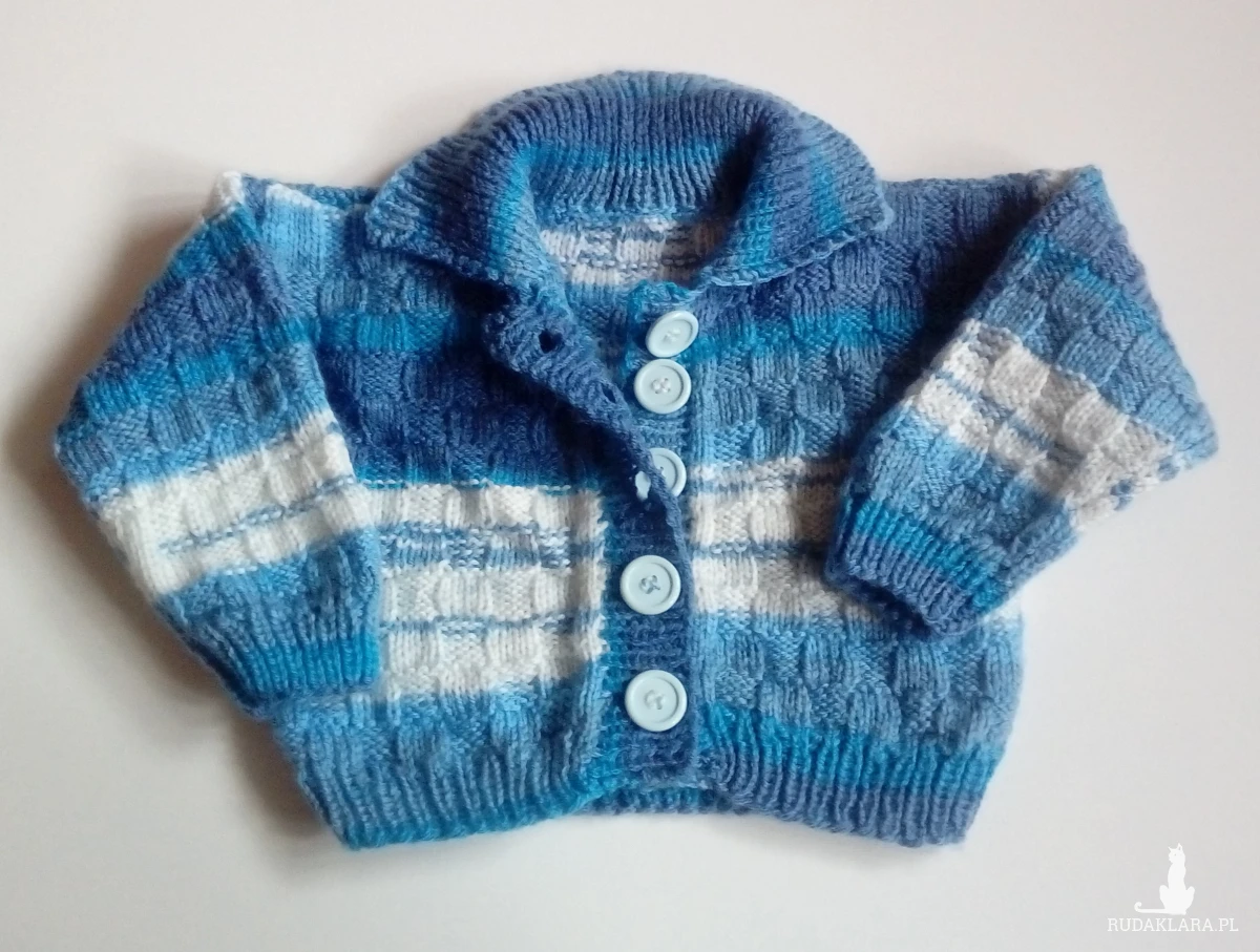 Sweterek wykonany ręcznie na drutach z delikatnej włóczki akrylowej.