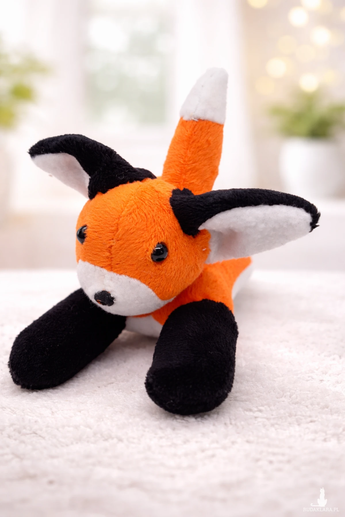 Wykonany przeze mnie mały leżący lisek. Długość z ogonkiem około 20 cm, wysokość ok. 10 cm.