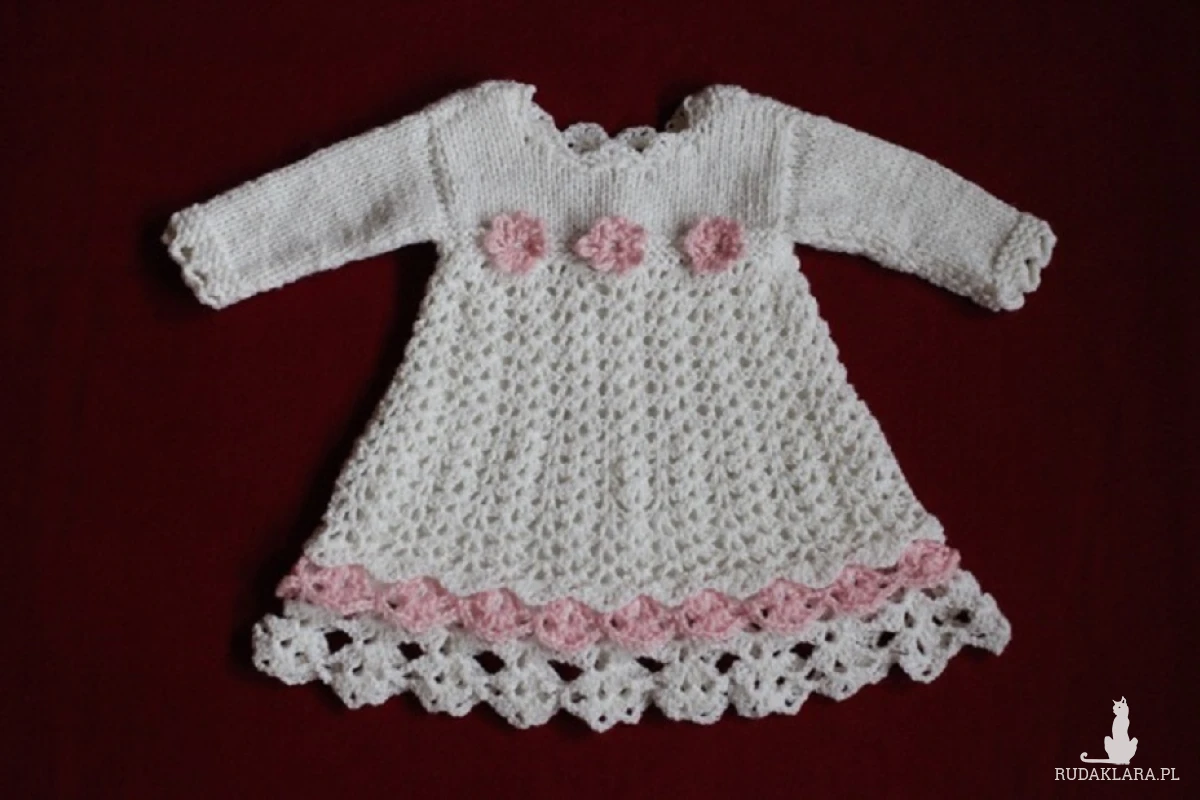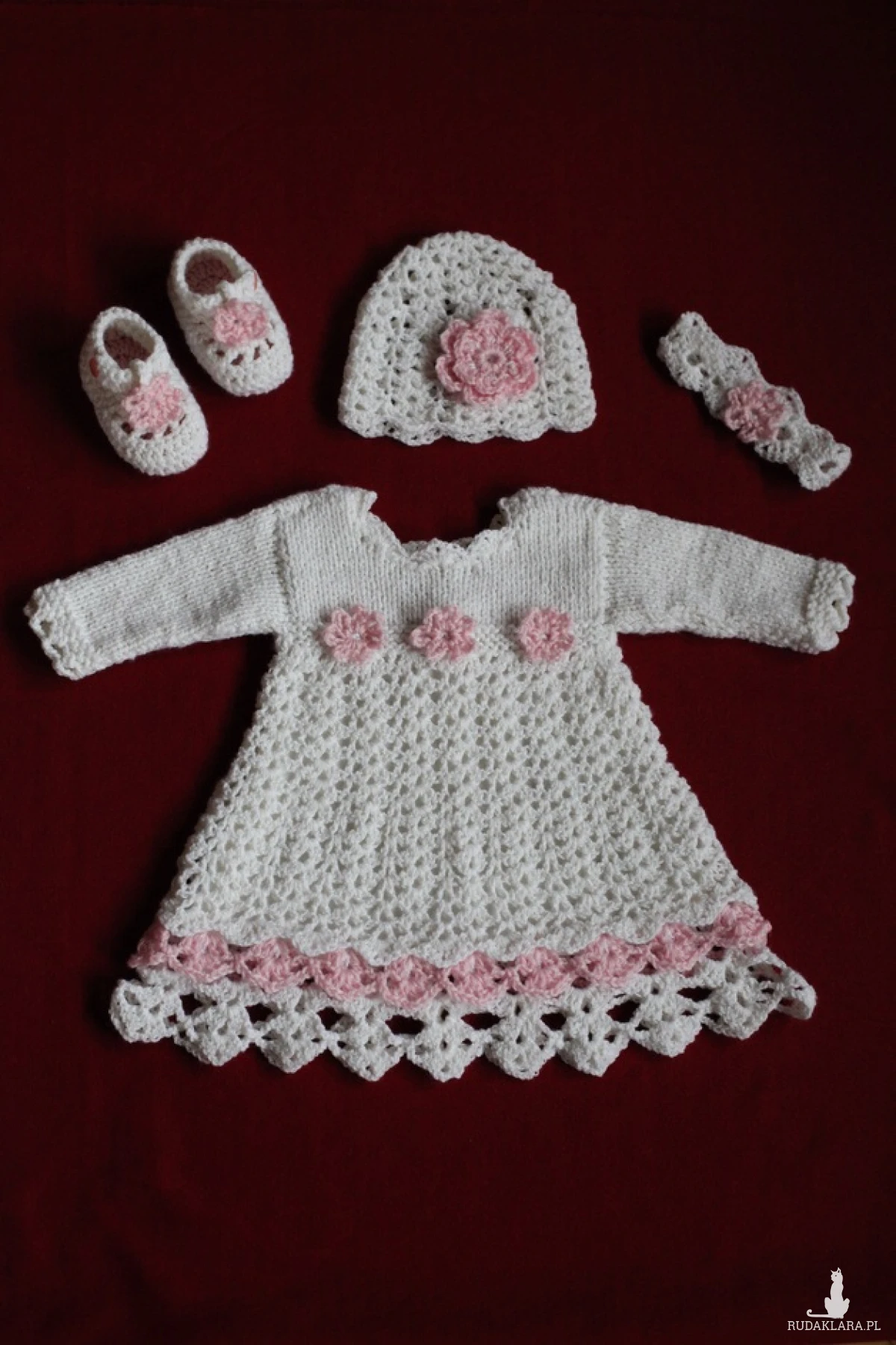 Na komplet składa się: sukienka, czapeczka, opaska, buciki.