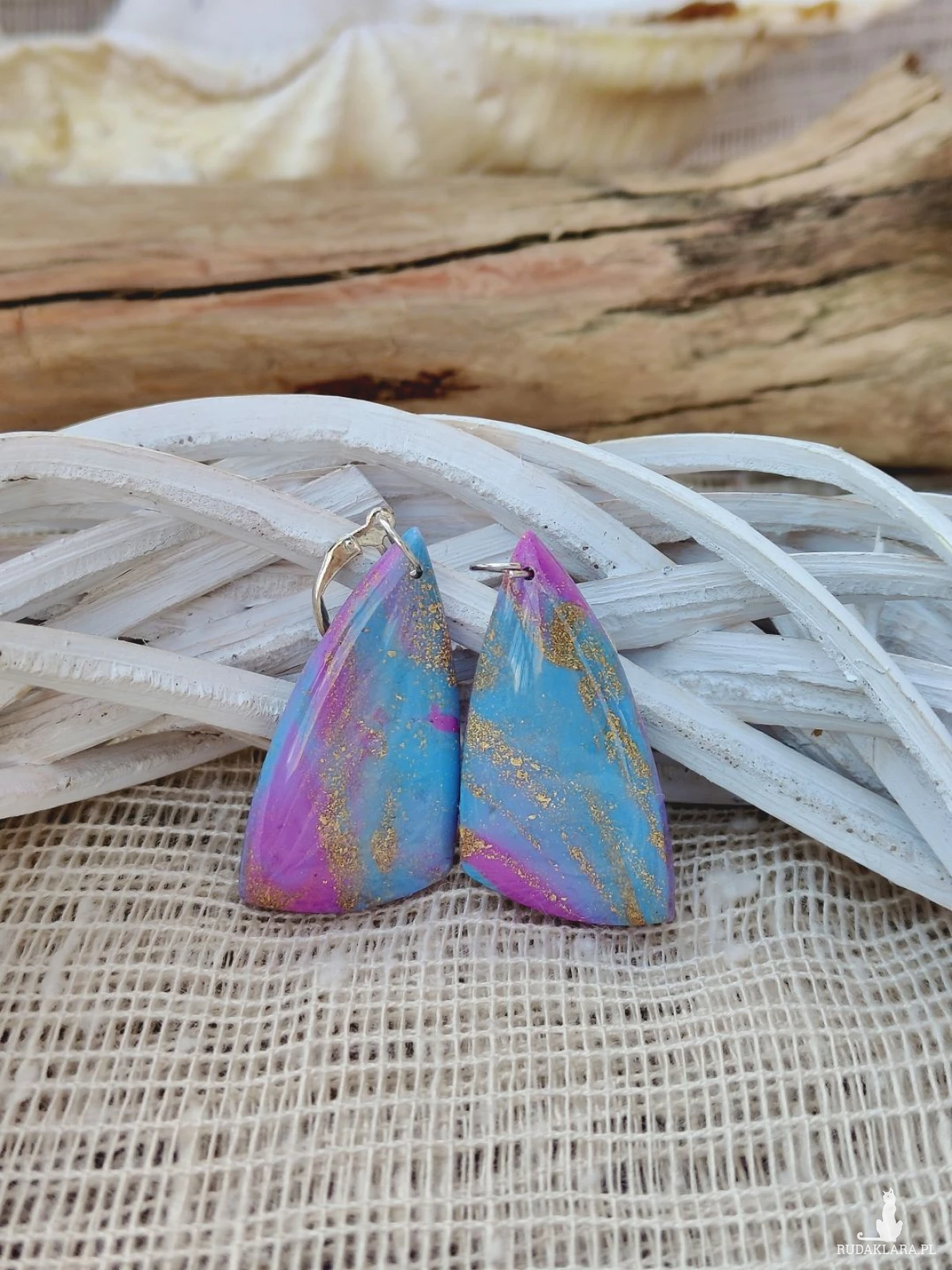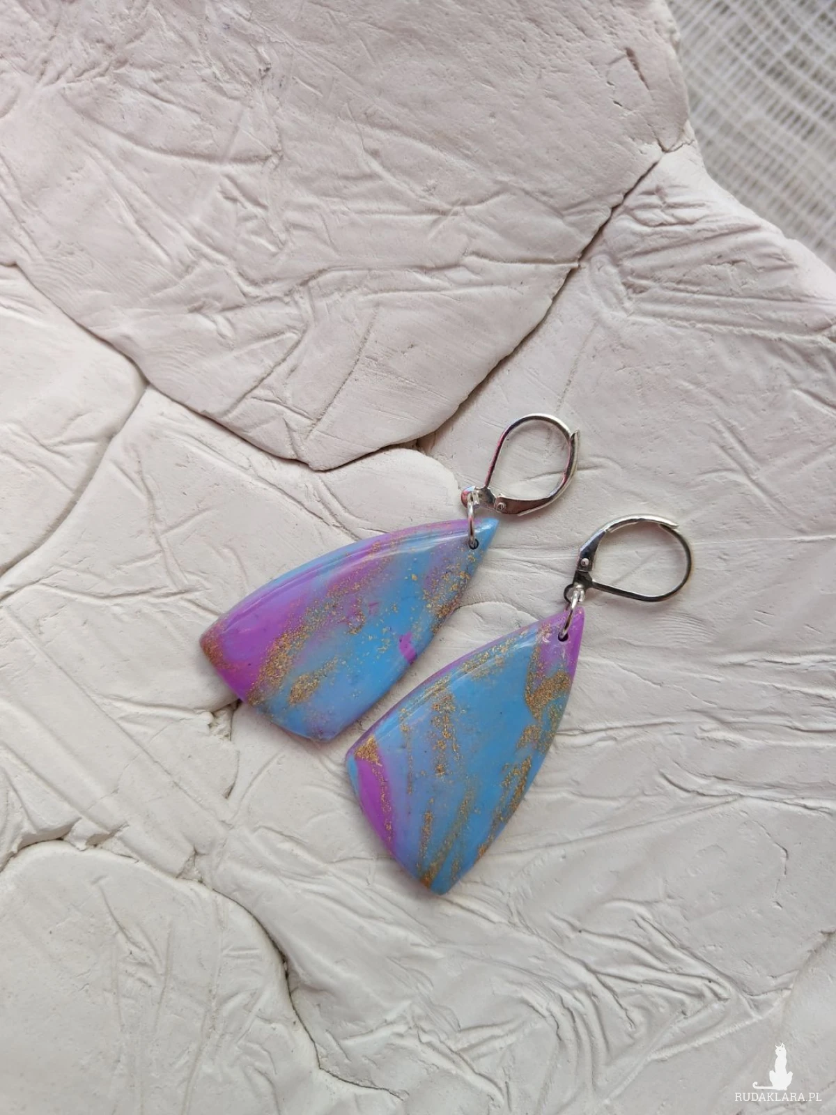 Zachwycające, ręcznie wykonane kolczyki z glinki polimerowej, które przyciągają spojrzenia swoją subtelną grą kolorów. Połączenie delikatnego błękitu z odcieniami różu i fioletu, przełamane złotymi akcentami, tworzy efekt inspirowany zorzą polarną. Całość została pokryta warstwą żywicy, nadającą im wyjątkowy połysk i głębię. Lekkie i wygodne, idealnie dopełnią zarówno codzienne stylizacje, jak i bardziej eleganckie zestawy.