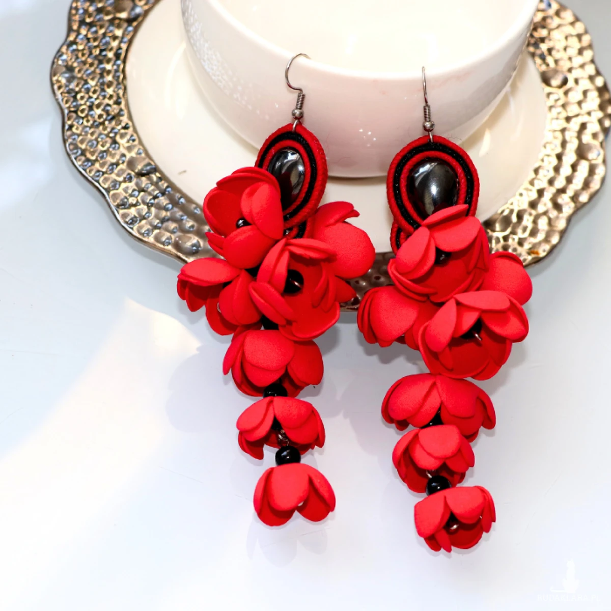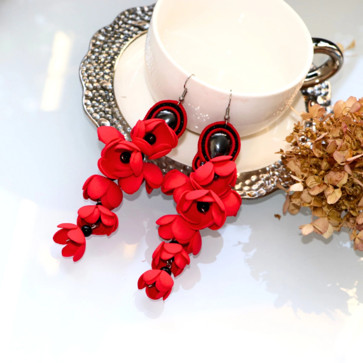 Te długie kolczyki kwiatowe to mistrzowskie połączenie tradycyjnego haftu sutasz oraz ręcznie formowanych kwiatów z pianki (foamiranu). Intensywna czerwień została przełamana głęboką czernią kryształów i koralików, tworząc kompozycję obok której nie da się przejść obojętnie.