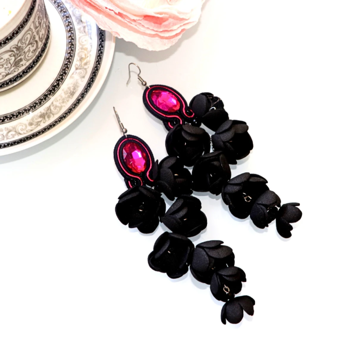 Te długie kolczyki kwiatowe to mistrzowskie zestawienie eleganckiego haftu sutasz oraz lekkich jak piórko kwiatów z pianki (foamiranu). Dominująca czerń stanowi idealne tło dla dużych kryształów w kolorze soczystej fuksji, które wieńczą górę kolczyków i nadają im niesamowitego blasku.