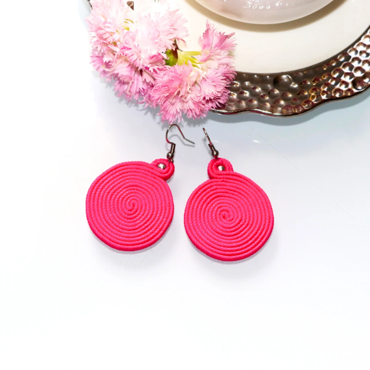 Te wyraziste kolczyki w kształcie kół zostały wykonane ręcznie pracochłonną techniką haftu sutasz. Sznurek w kolorze intensywnego różu (fuksji) został zwinięty w precyzyjną, hipnotyzującą spiralę o skręconej strukturze "twisted". Dzięki temu kolczyki zyskują piękną teksturę, która wspaniale współgra ze światłem.
