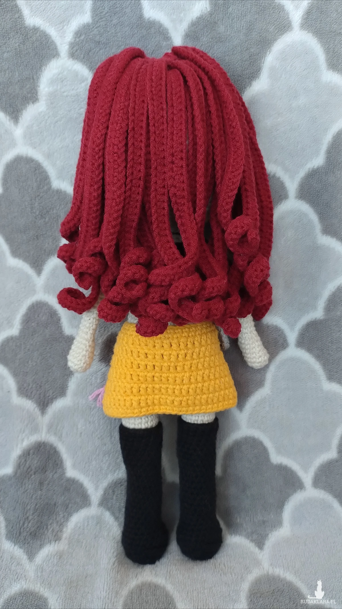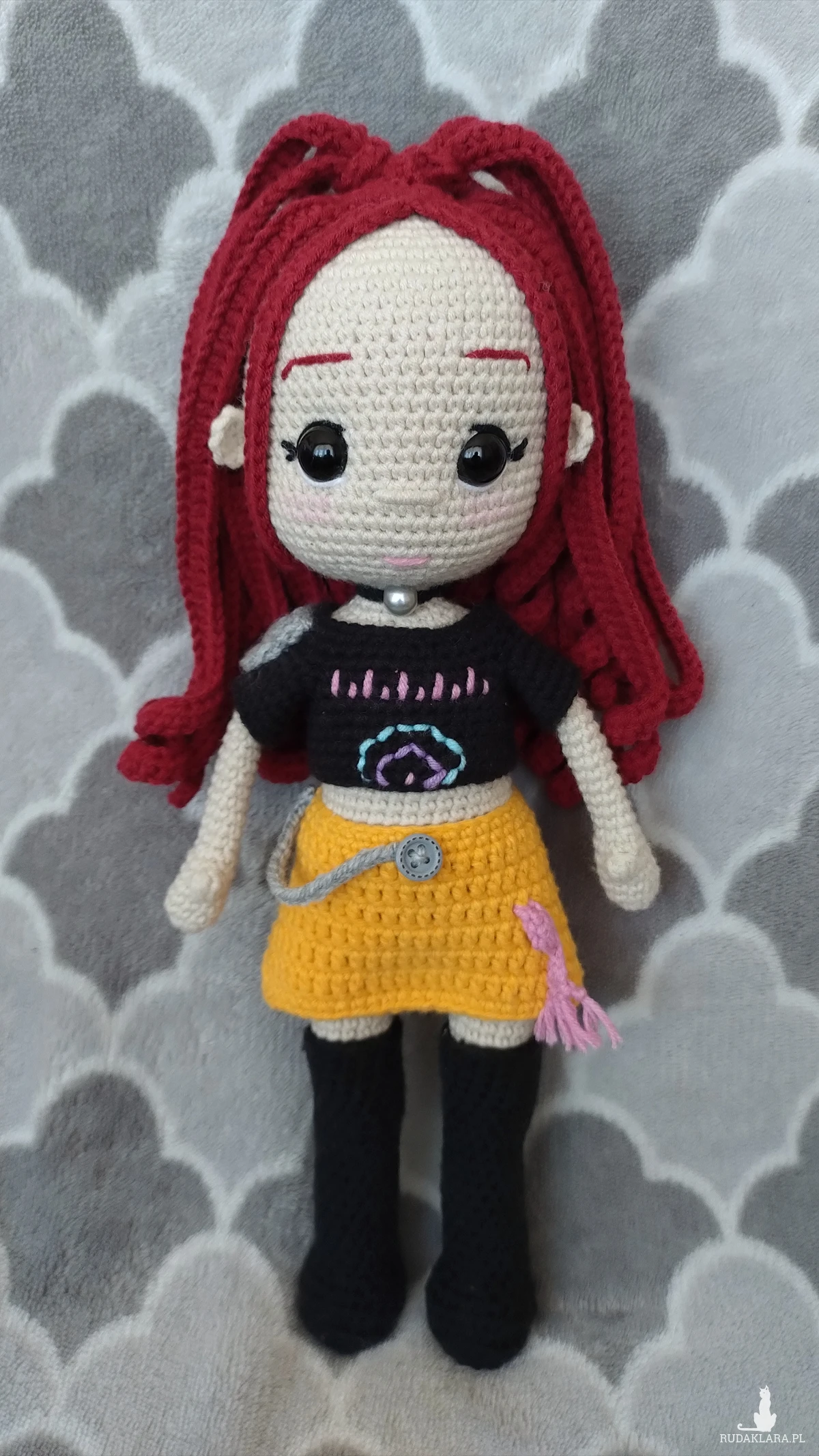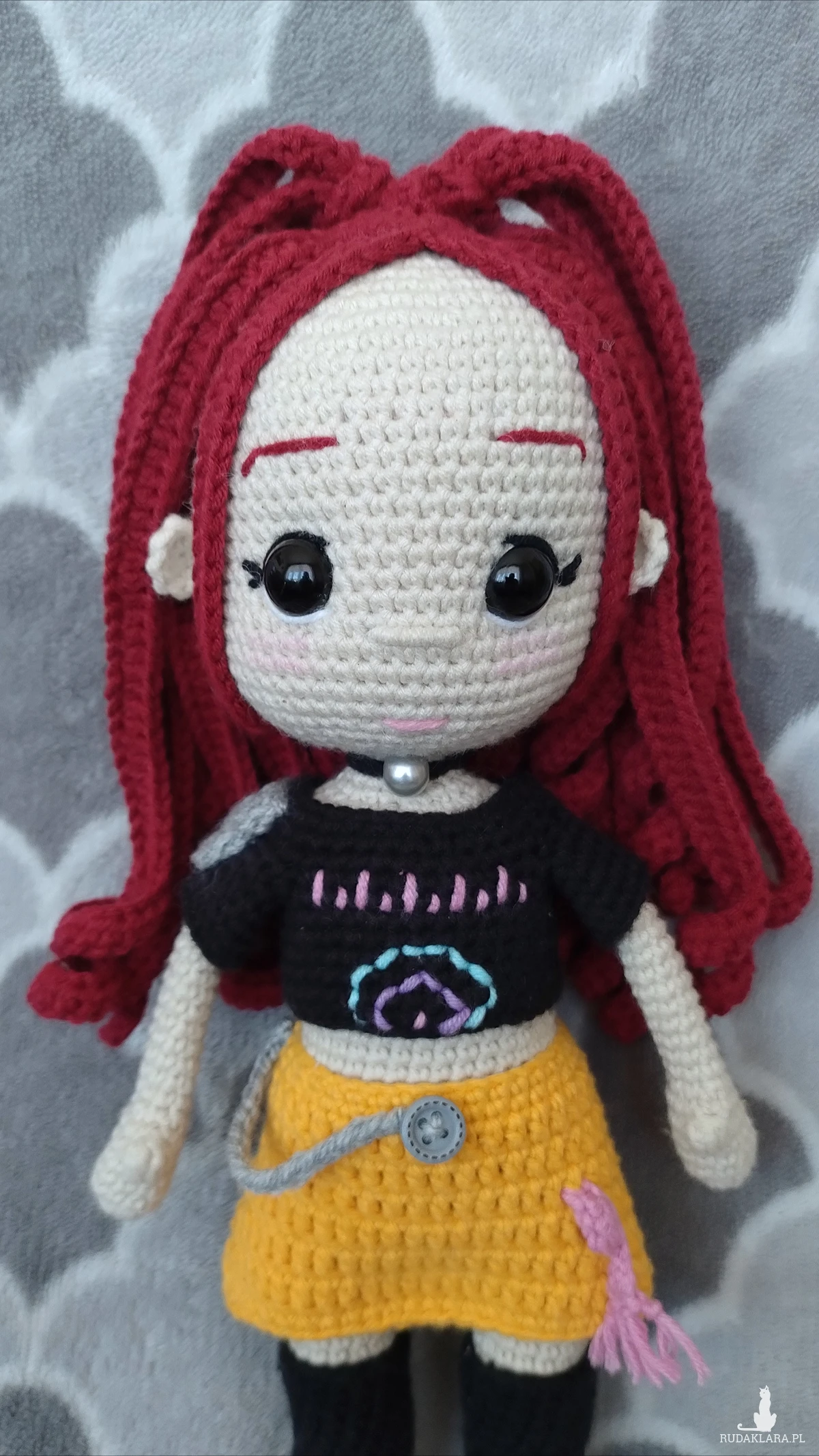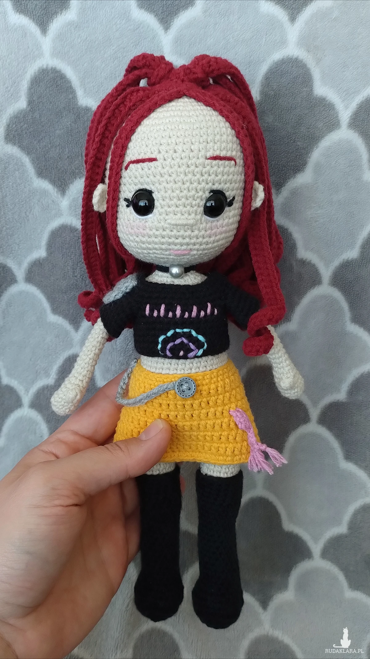 Lalka Mira (Kpop Demon Hunters) wykonana na szydełku z włóczki Yarn Art Jeans. Wysokość około 28 cm. Ubranka można zdejmować.