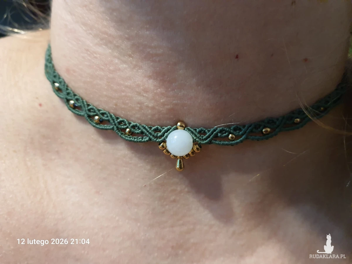 Pleciony choker z zielonego sznurka z Jadeitem, wykończony stalą nierdzewną z zapięciem makramowym. Rękodzieło