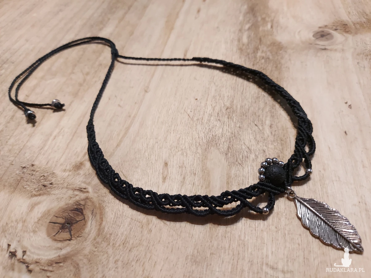 Choker pleciony metodą mikro makramy z czarnego woskowanego sznurka poliestrowego z Agatem Druzy w kolorze iskrzącego granatu, posiada regulowane zapięcie .