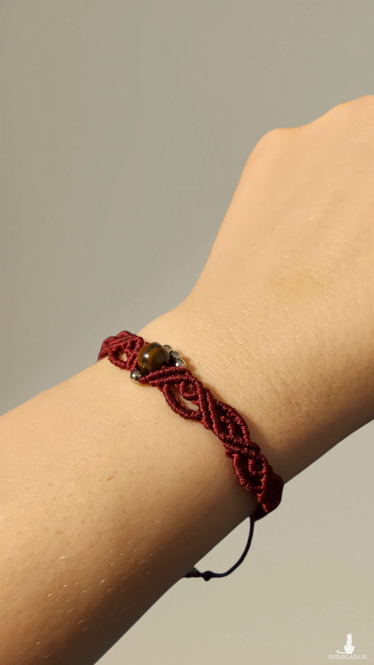 Bransoletka w kolorze burgundowym, wykonana techniką makramy z woskowanego poliestrowego sznurka z wplecionym kamieniem Tiger's Eye 8 mm średnicy, wykończona stalą nierdzewną z zapięciem regulowanym.