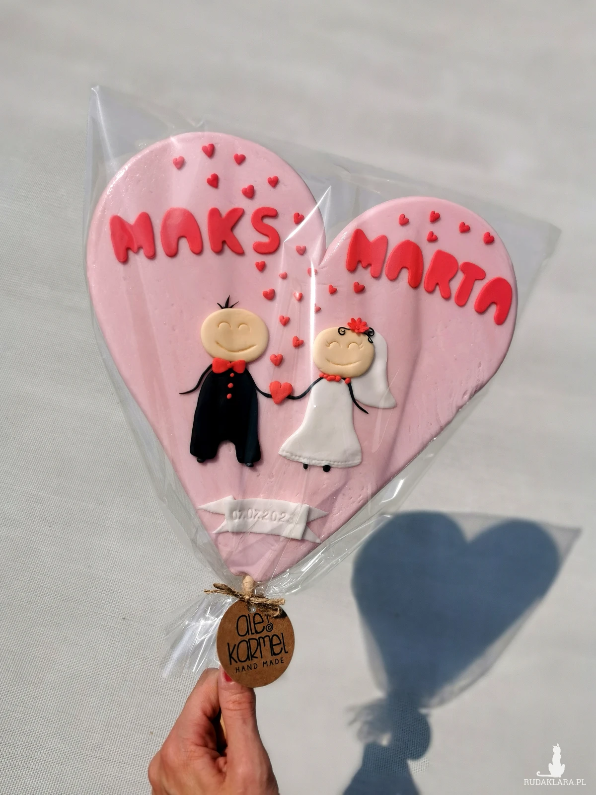 Na sercu znajduje się dekoracja przedstawiająca parę młodą – symbol miłości i wspólnej drogi, który nadaje lizakowi wyjątkowego, sentymentalnego charakteru. To nie tylko słodycz, ale również pamiątka pełna emocji.