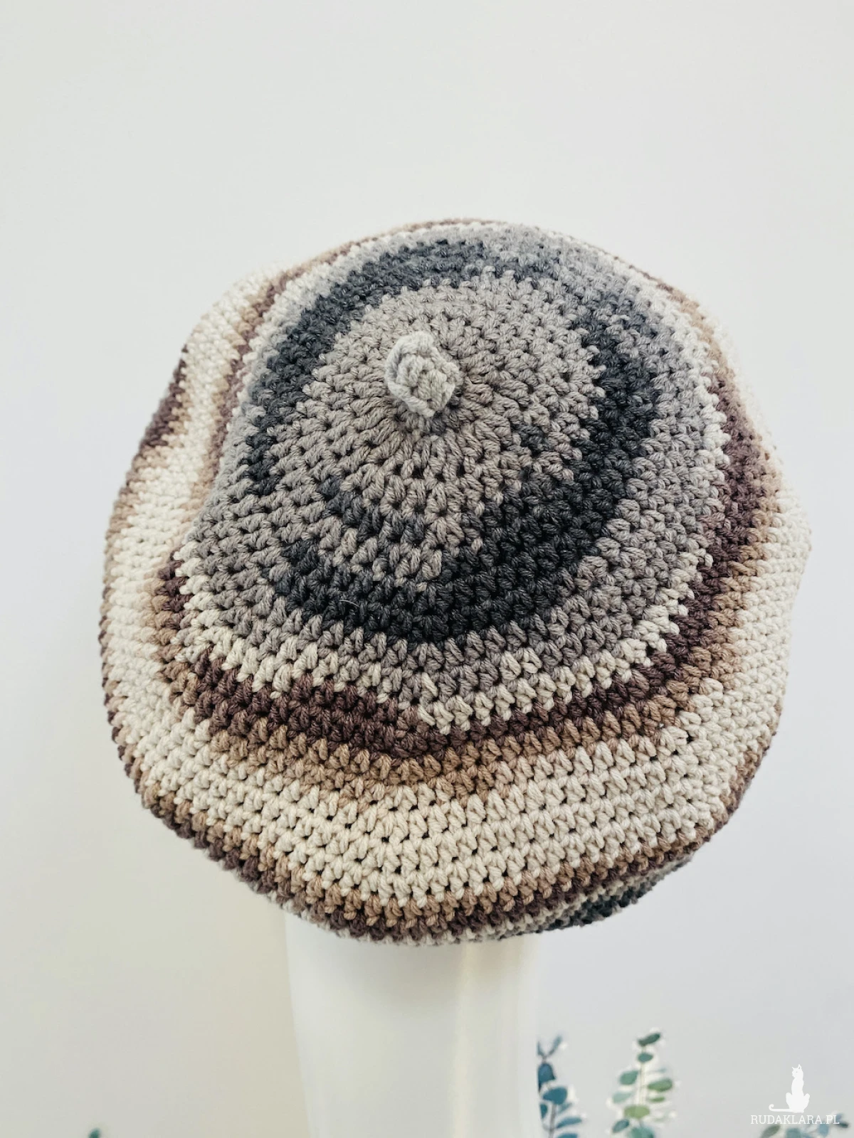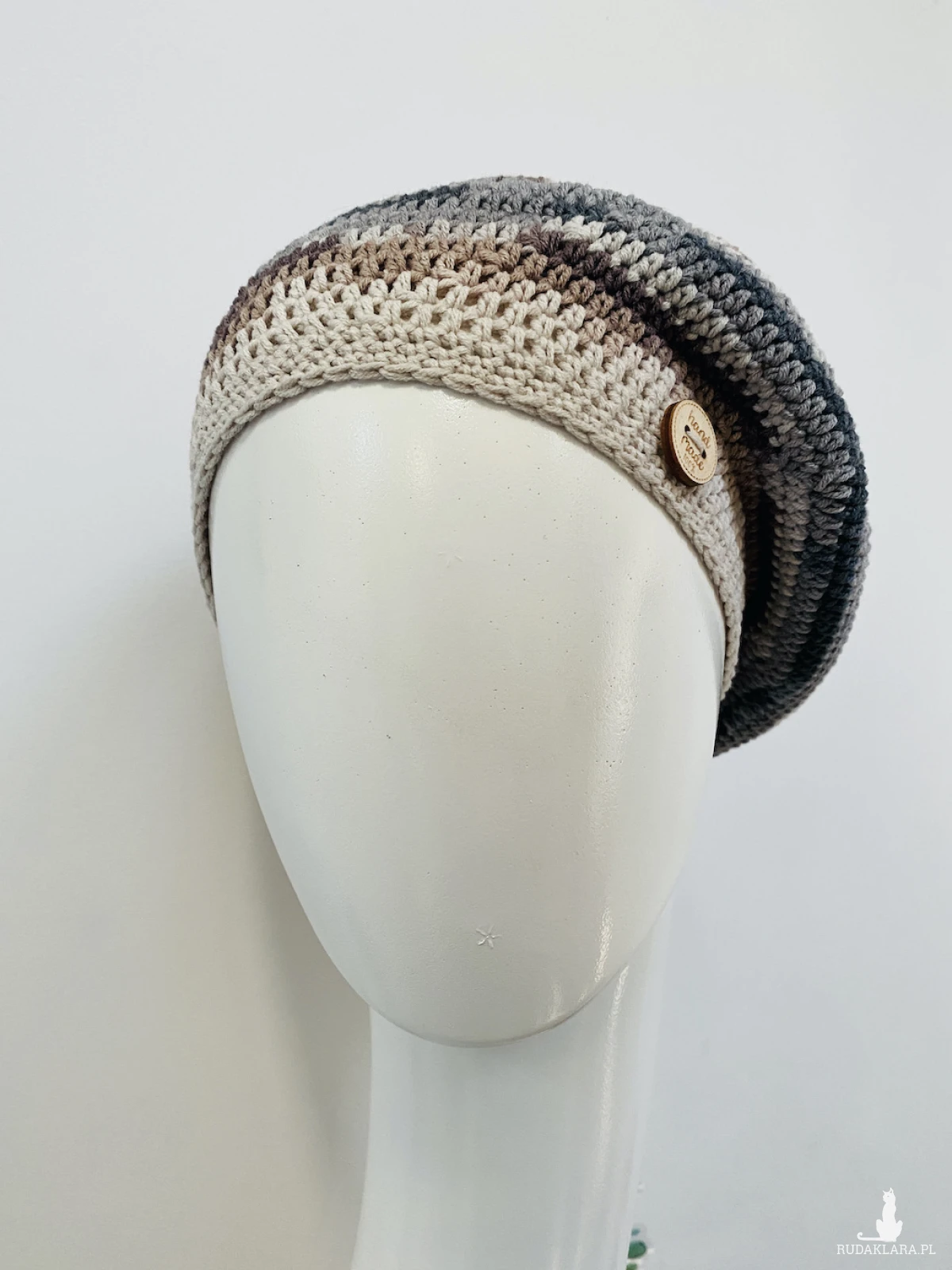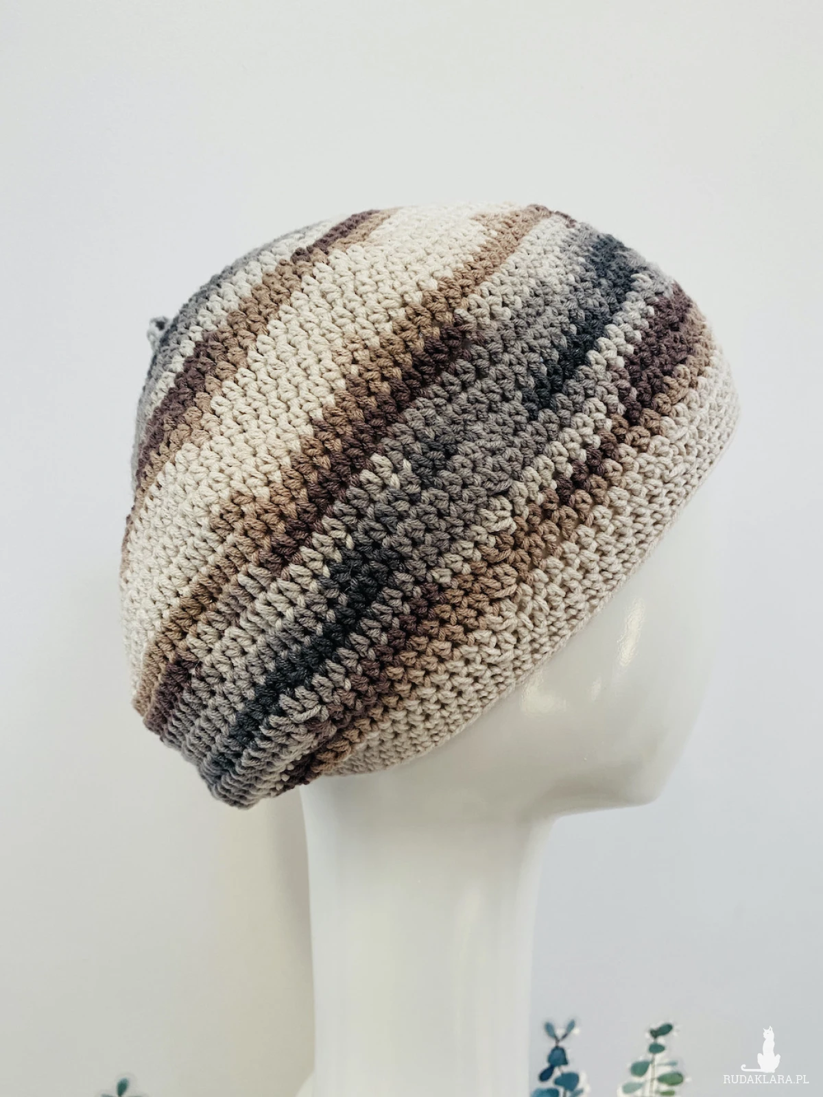 Lekki, wiosenny beret wykonałam ręcznie na szydełku z wysokiej jakości włóczki bawełniano-akrylowej, która zapewnia wygodę noszenia przez cały dzień. Certyfikat OEKO-TEX® Standard 100 potwierdza, że przędza jest bezpieczna dla zdrowia.