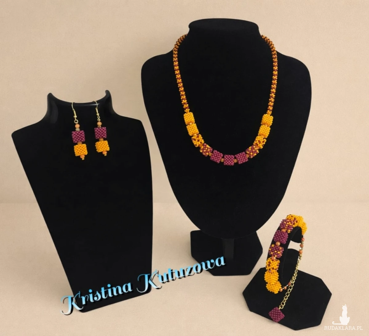 Ciepło bursztynu i głębia dojrzałej śliwki zamknięte w ręcznie plecionych kostkach. Naszyjnik miękko układa się na dekolcie, prowadząc wzrok od złotych tonów ku nasyconym akcentom bordo – jak zachód słońca nad mediną. Kolczyki powtarzają ten rytm w lekkiej, geometrycznej formie, a bransoletka z delikatnym łańcuszkiem i zawieszką dopełnia całości. Każdy element jest starannie wykończony, przyjemny w dotyku i wystarczająco lekki, by nosić go od porannej kawy po wieczorne wyjście. To nie tylko dodatek – to mały talizman koloru, który rozświetla stylizację i dodaje pewności siebie. „Słońce Marrakeszu” – dla kobiet, które lubią ciepło, charakter i rękodzieło z duszą.