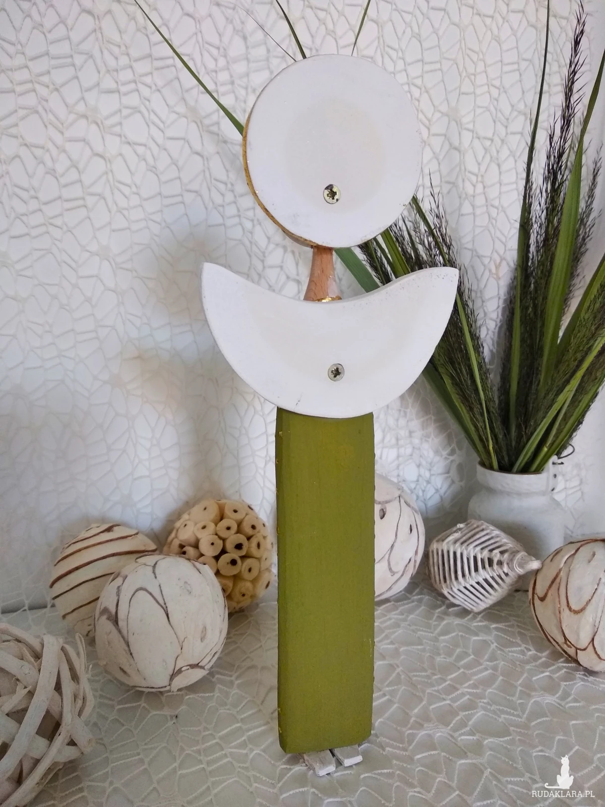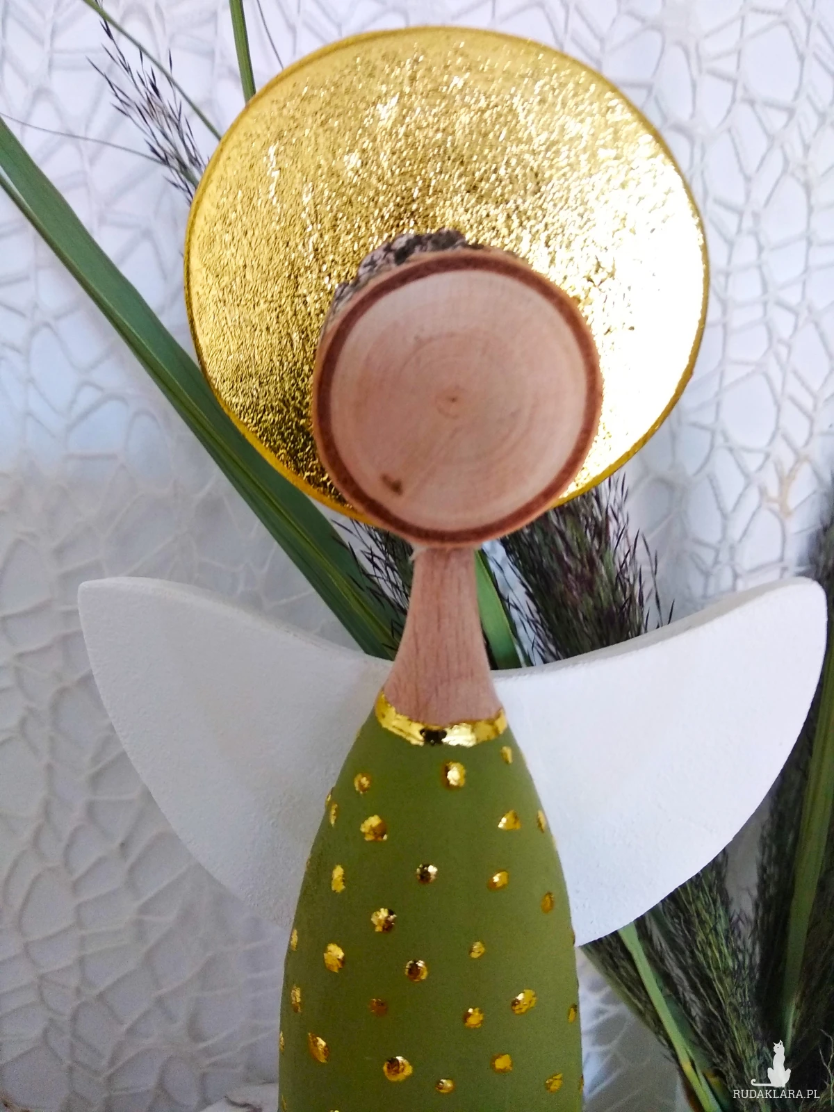 Ręcznie wykonany anioł z drewna bukowego, z sukienką malowaną akrylową farbą w odcieniu zieleni. Złota aureola oraz delikatne, nieregularne kropeczki nadają całości elegancki, lekko rozświetlony charakter.