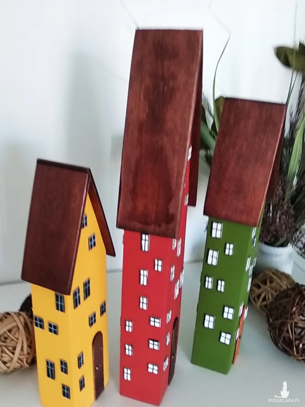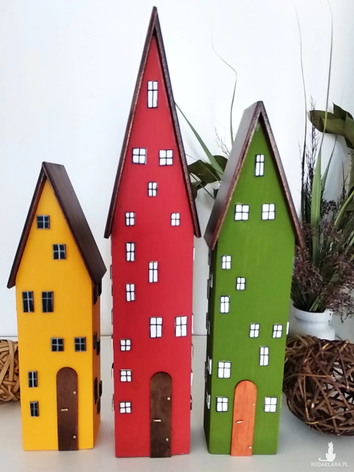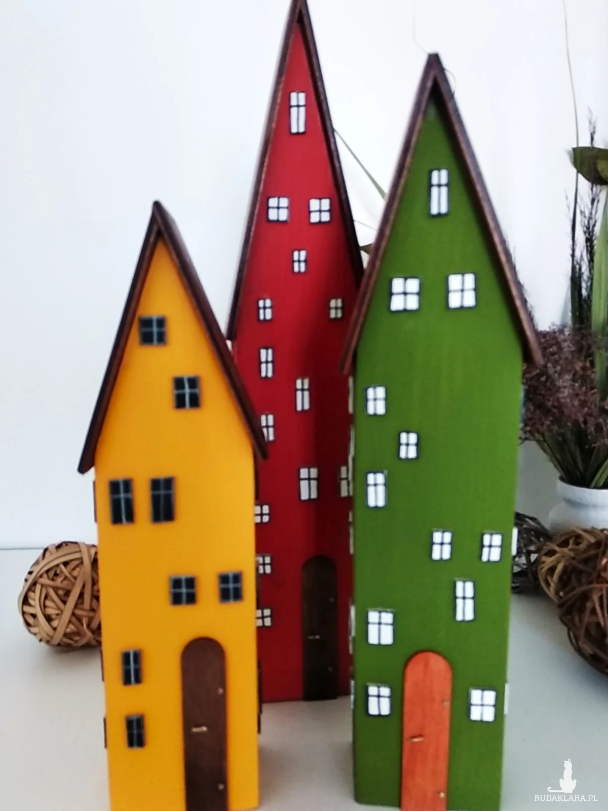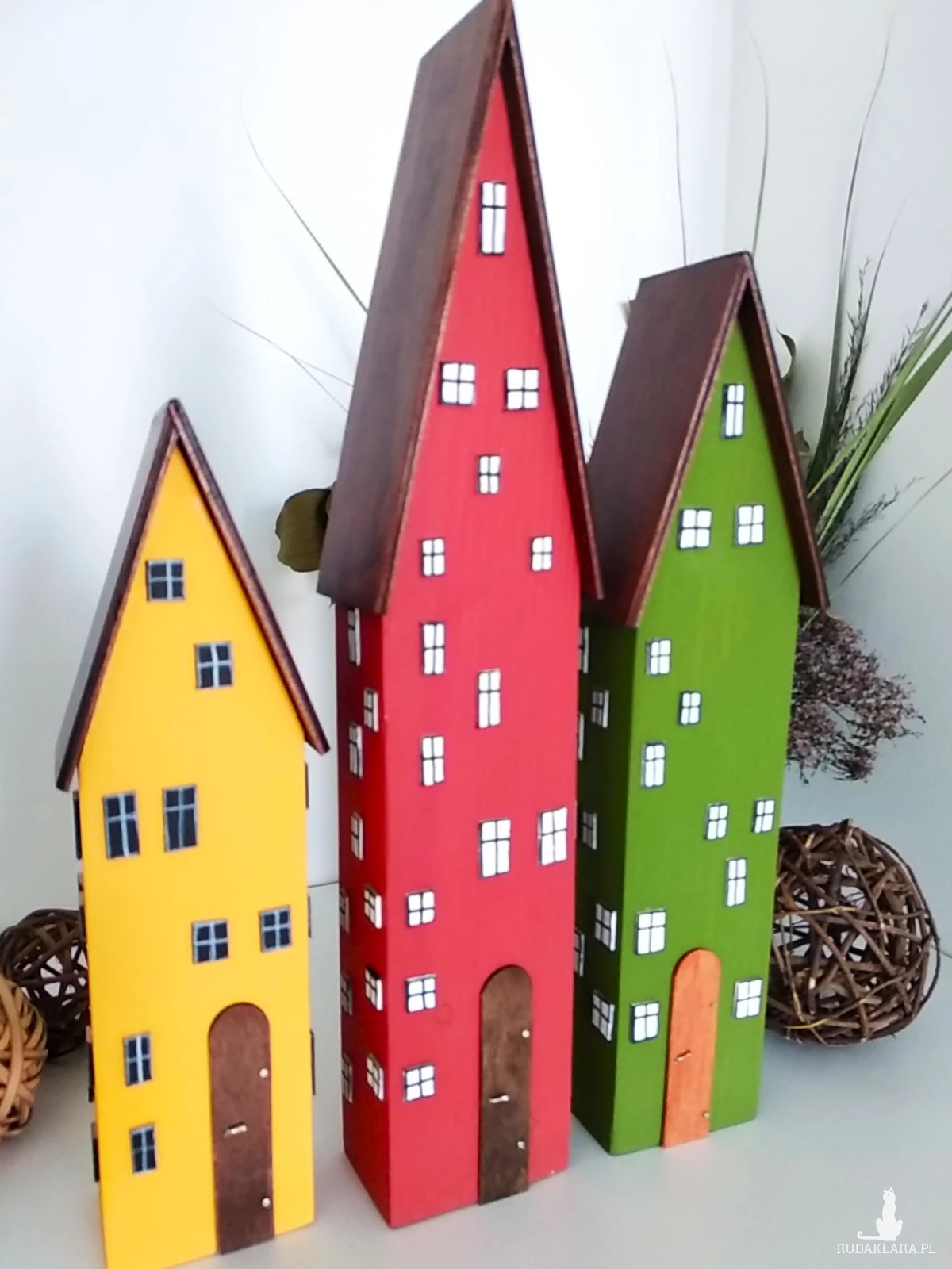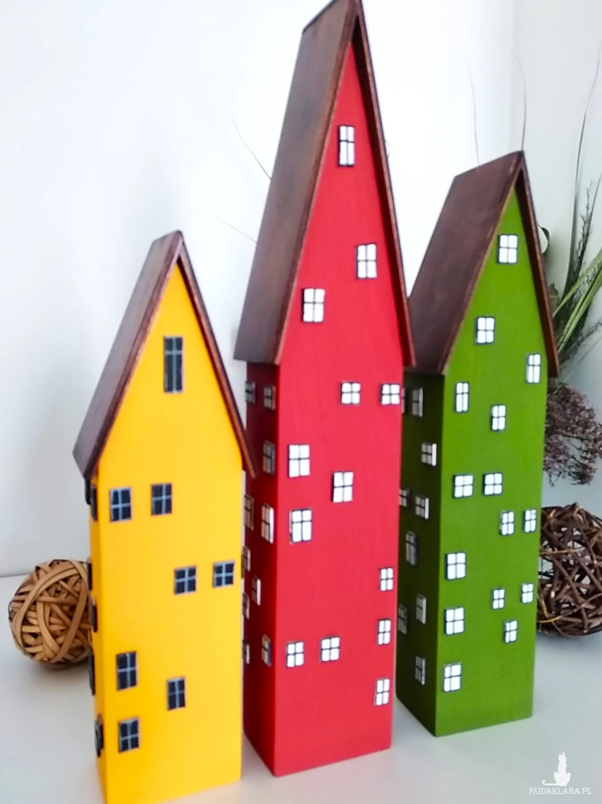 Zestaw smukłych, ręcznie wykonanych domków o wyrazistych kolorach, malowanych farbą akrylową. Charakterystyczne, wysokie dachy nadają im lekkości i przyciągają wzrok, a liczne okienka z każdej strony budują spójną, dopracowaną formę.