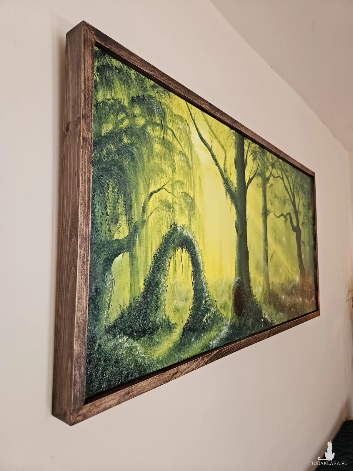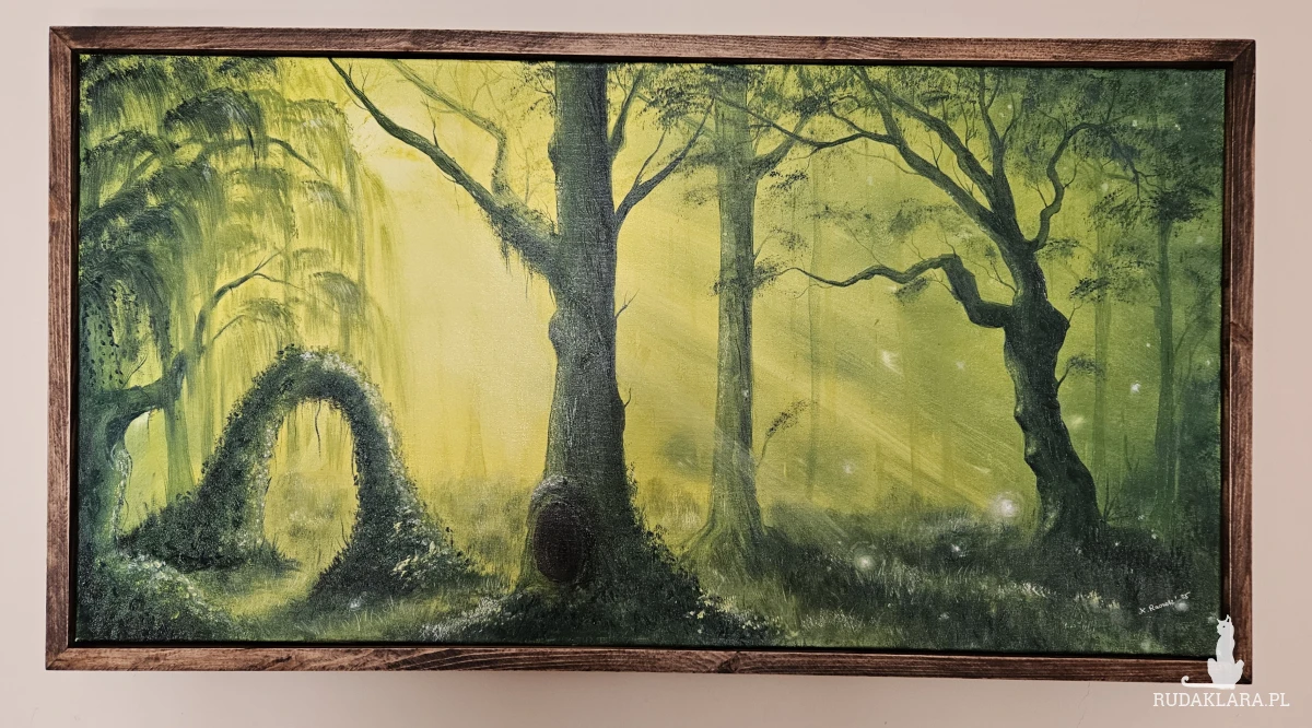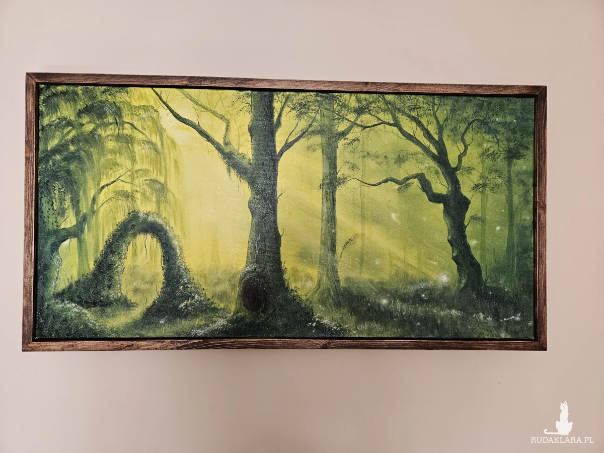 Zielony tajemniczy las w drewnianej elwganckiej oprawie. Mistyczny las pasuje do dekoracji dla osob kochajacych naturę, ciszę. Obraz doda do wnętrza ciepło i przybliży nas dk natury. Wieczorem przy ciepłym świetlw wygląda jak prawdziwa magia. Małe iskierki wyglądają jak prawdziwe.