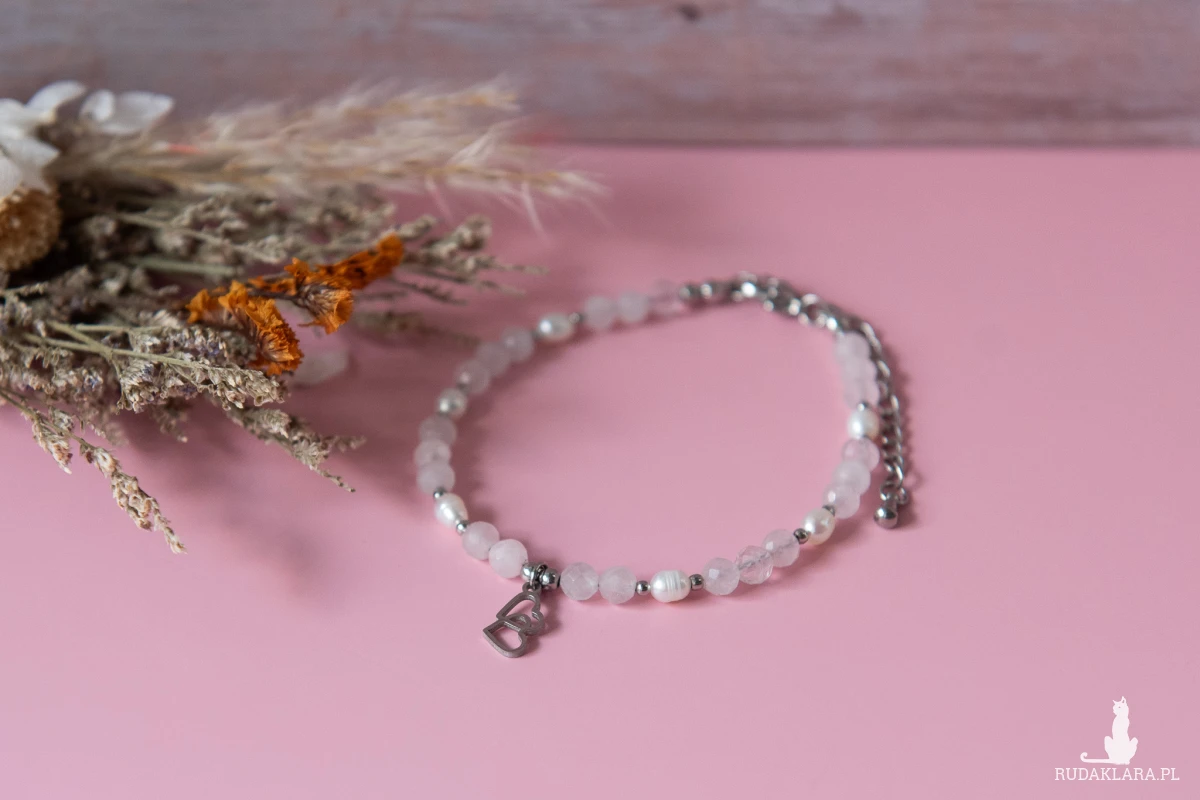 Bransoletka HEARTS z kamieni - kwarc różowy (4 mm), perły słodkowodnej (3-4 mm) oraz z elementów ze stali nierdzewnej.