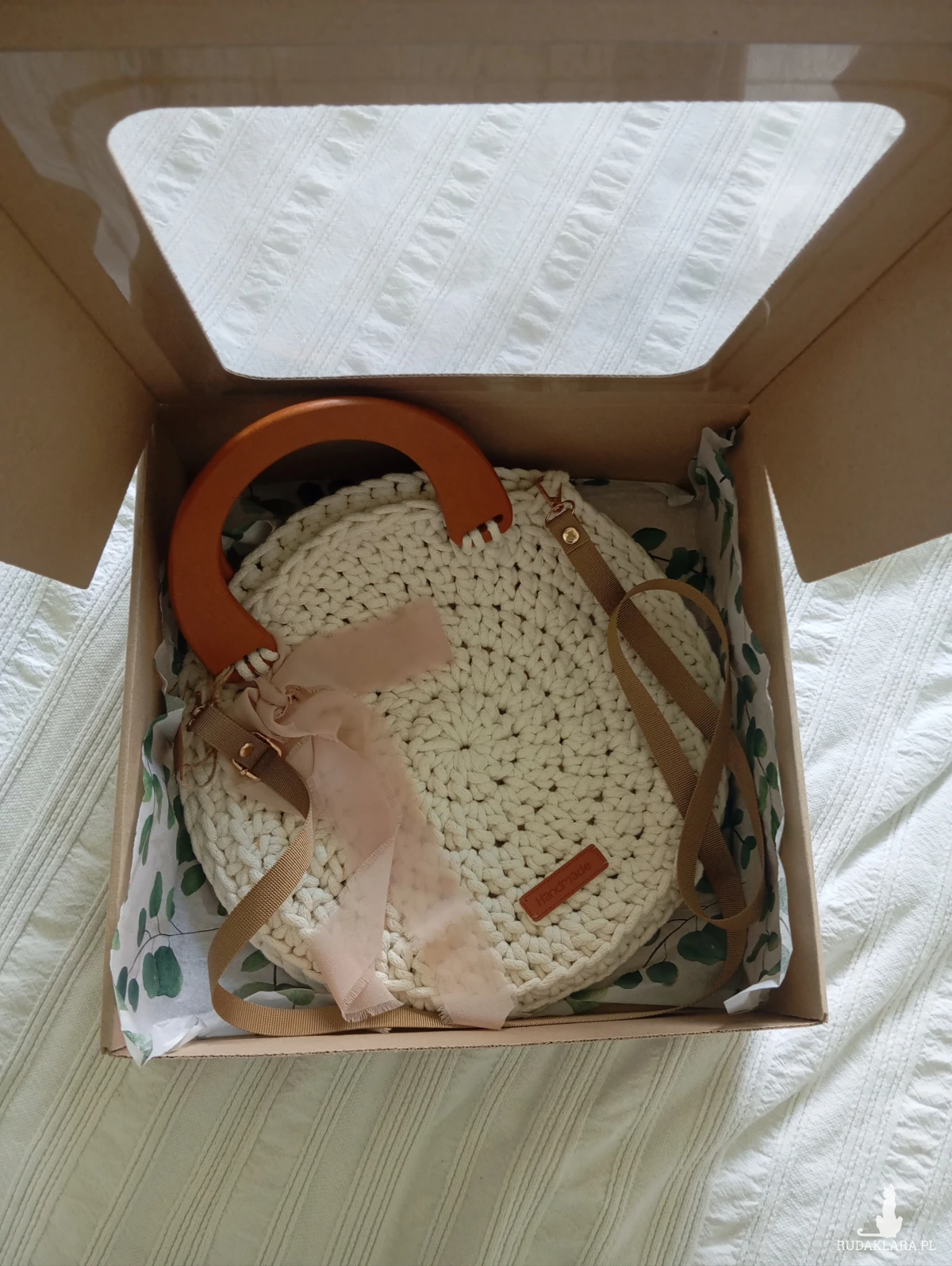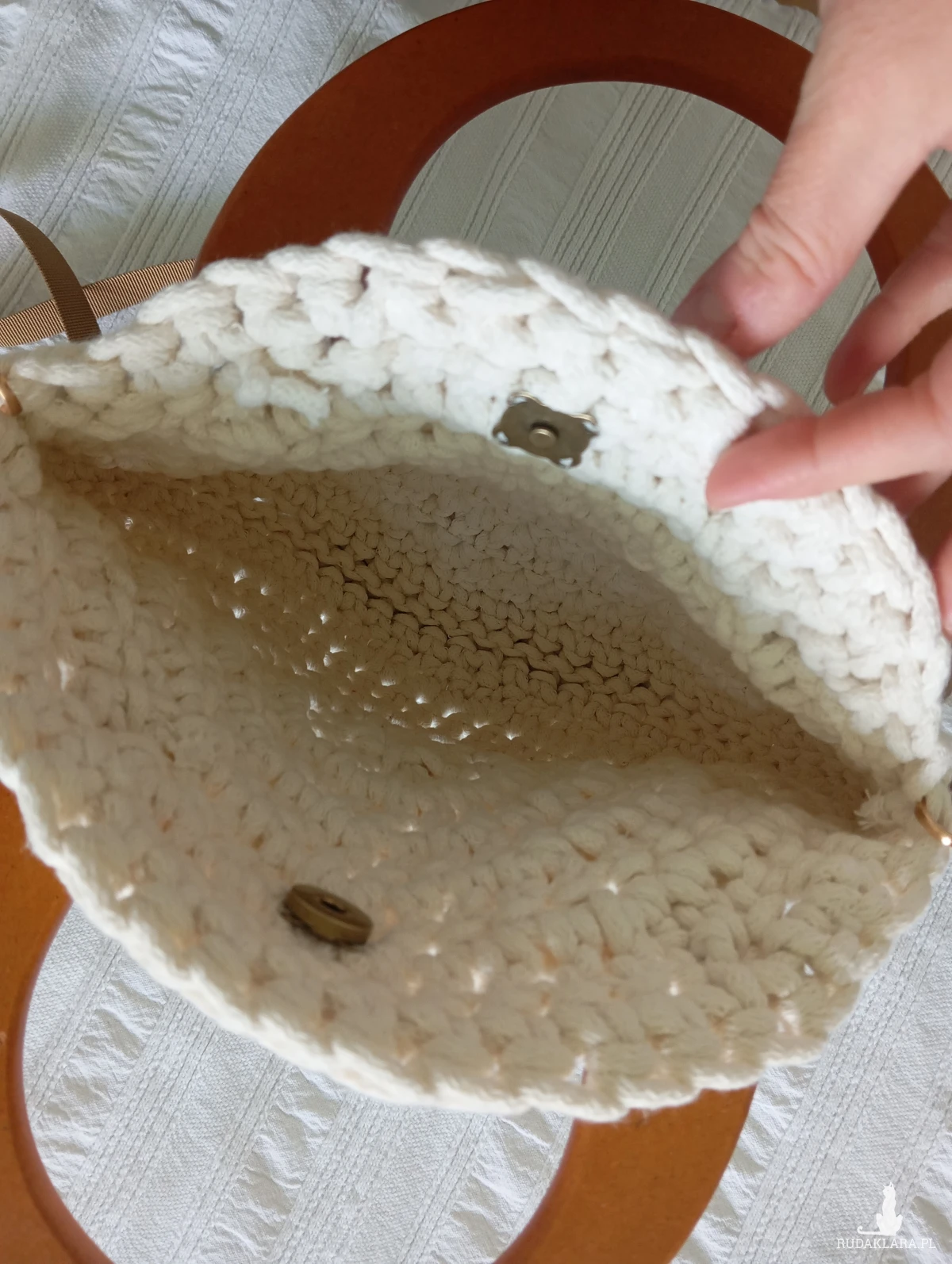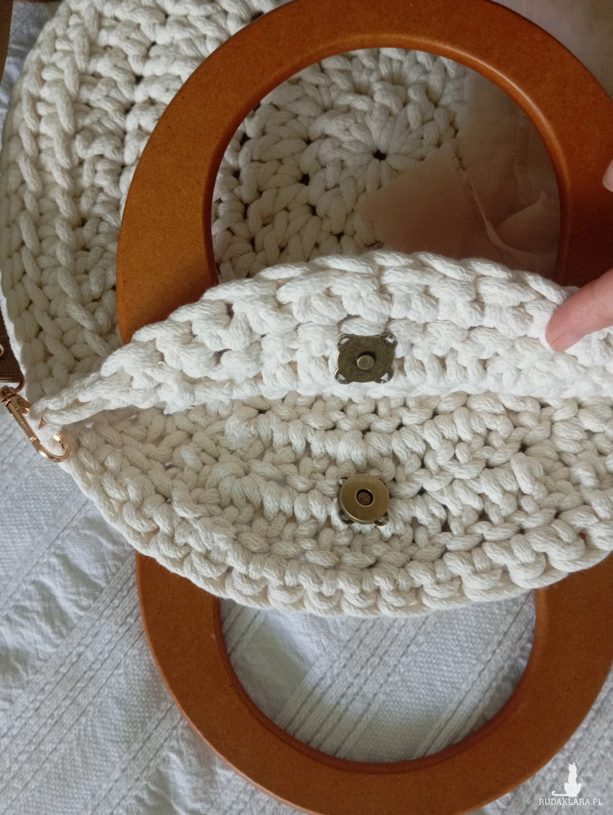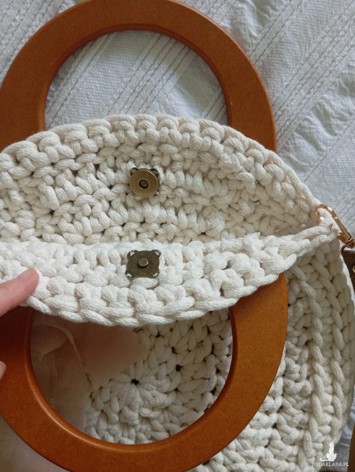 Piękna torebka w stylu Boho wykonana handmade z bawełnianego sznurka z drewnianymi uchwytami i doczepianym paskiem.