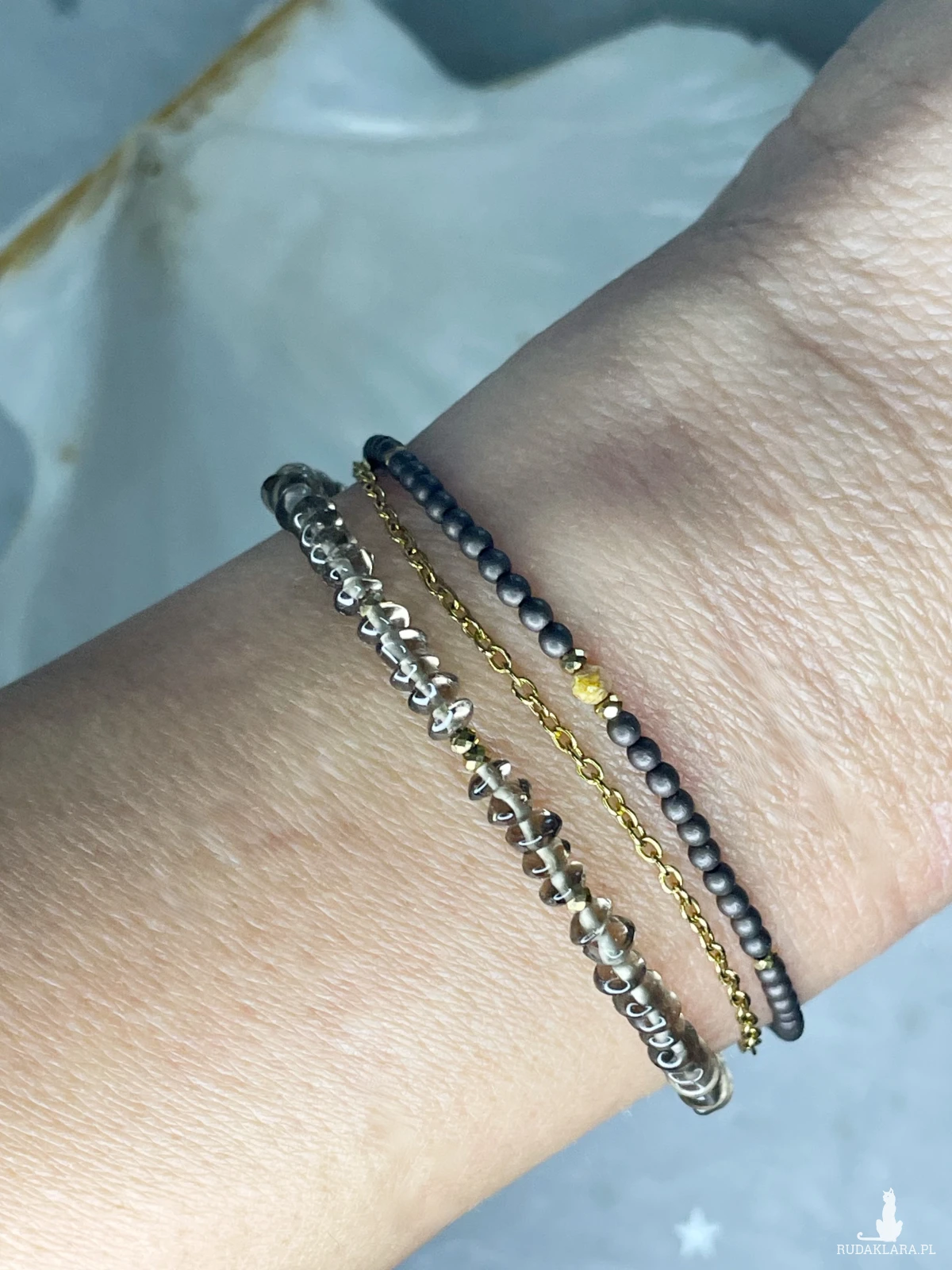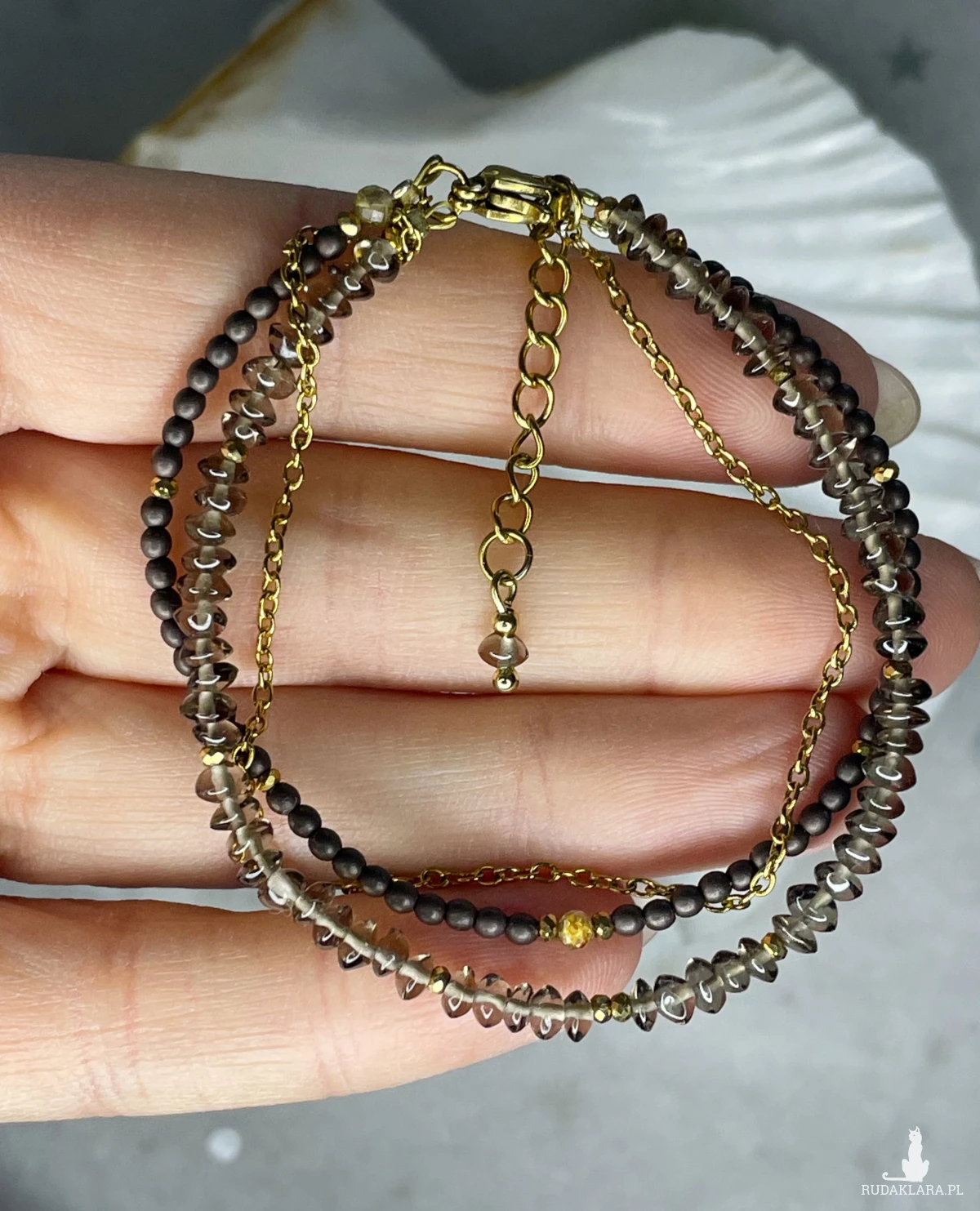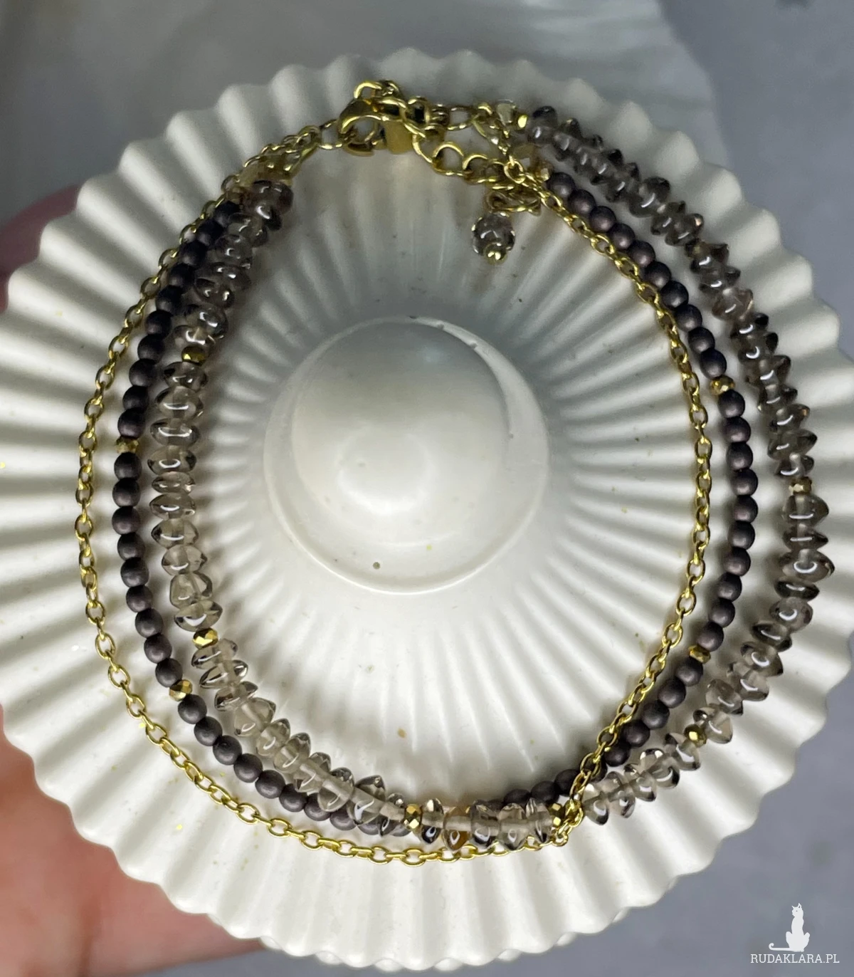 Wykonana ręcznie potrójna bransoletka z kamieni naturalnych hematytu, kwarcu dymnego i łańcuszka ze stali szlachetnej. Całość wykończona przedłużką z możliwością regulacji z ręcznie wykonaną zawieszką z kwarcu dymnego.