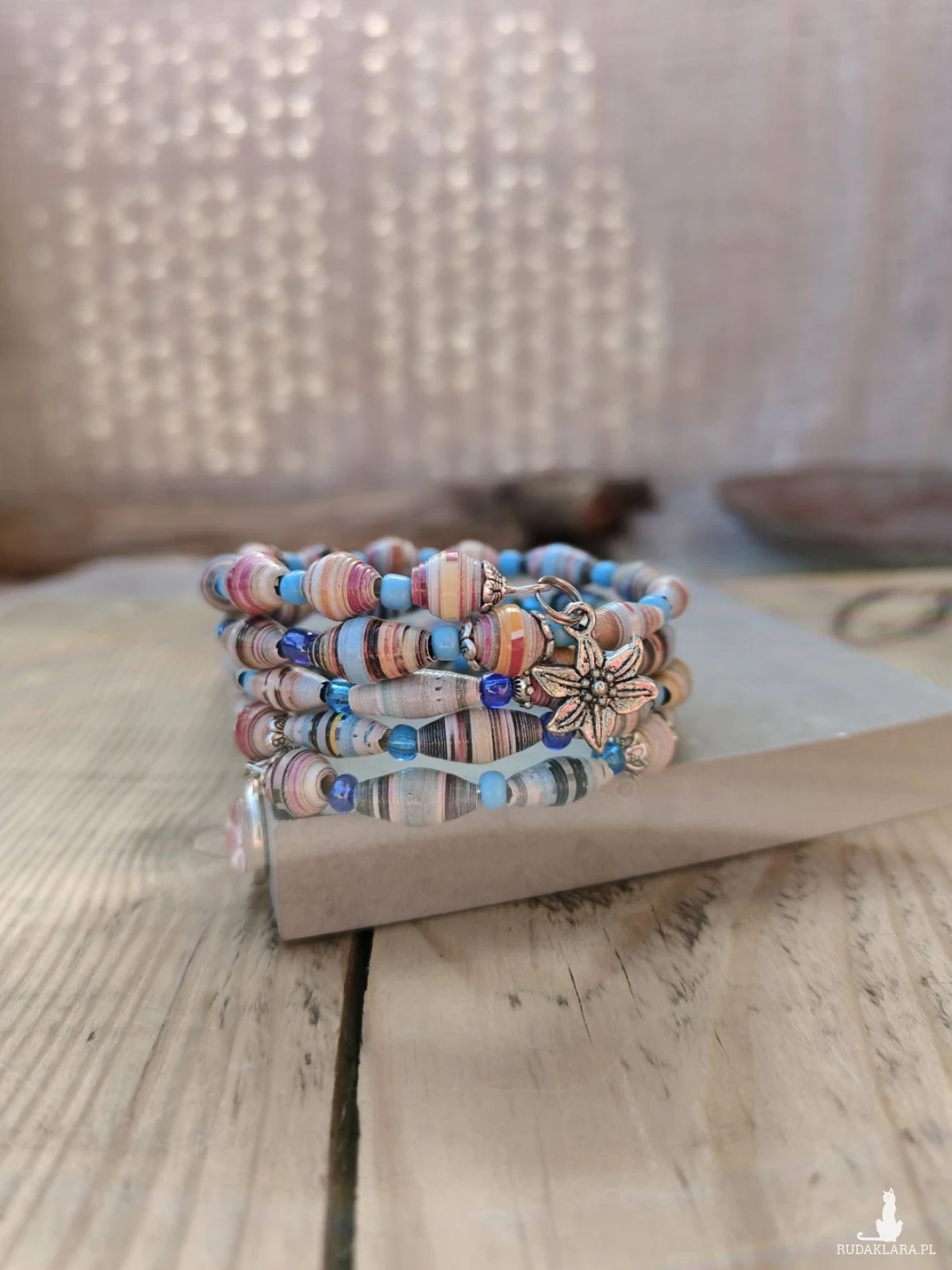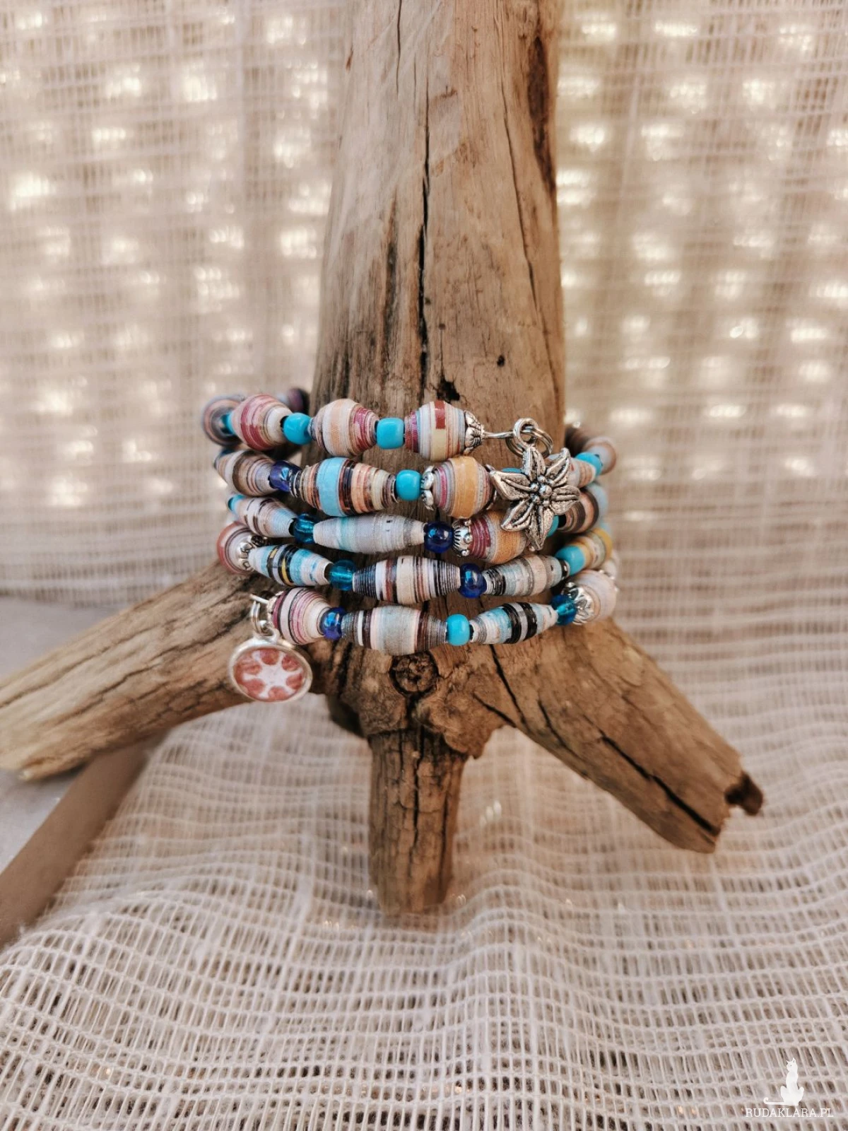 Ręcznie wykonana bransoletka w stylu boho, stworzona z unikalnych koralików z papieru, zachwyca lekkością i artystycznym charakterem. Każdy koralik ma niepowtarzalny wzór, co sprawia, że każda sztuka jest jedyna w swoim rodzaju. Subtelne odcienie turkusu, beżu i różu przywołują skojarzenia z morską bryzą i letnim relaksem. Elastyczna forma sprawia, że bransoletka pięknie układa się na nadgarstku, a delikatna zawieszka dodaje jej wyjątkowego uroku.