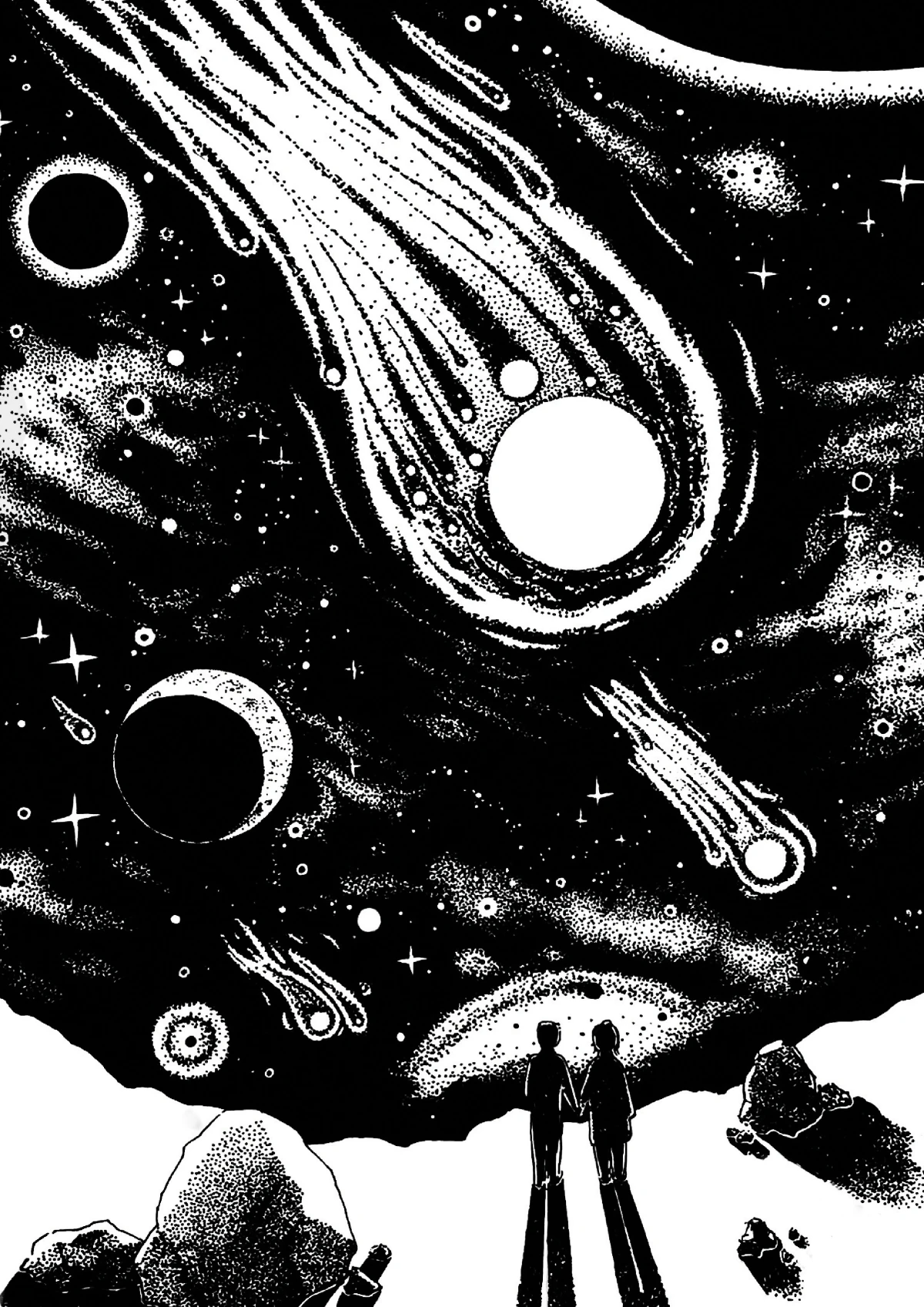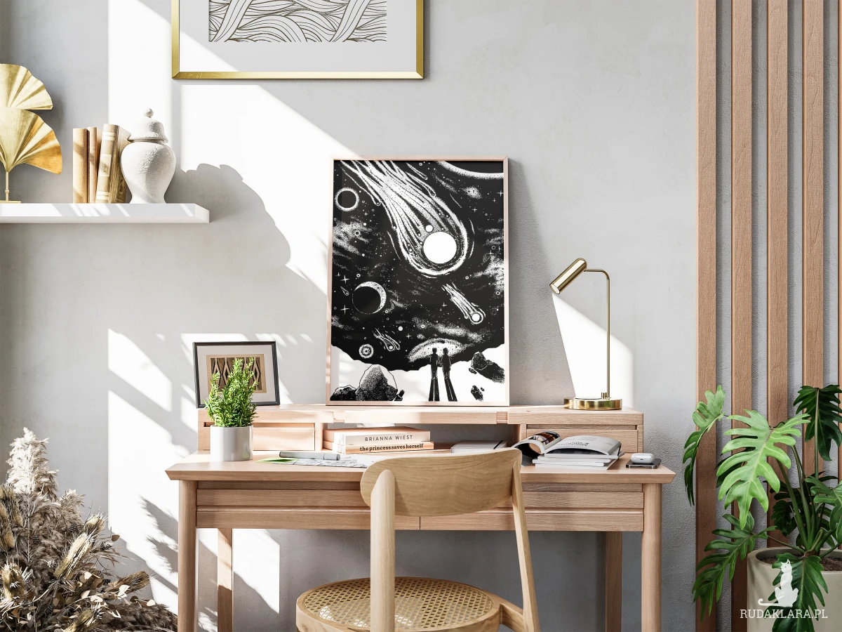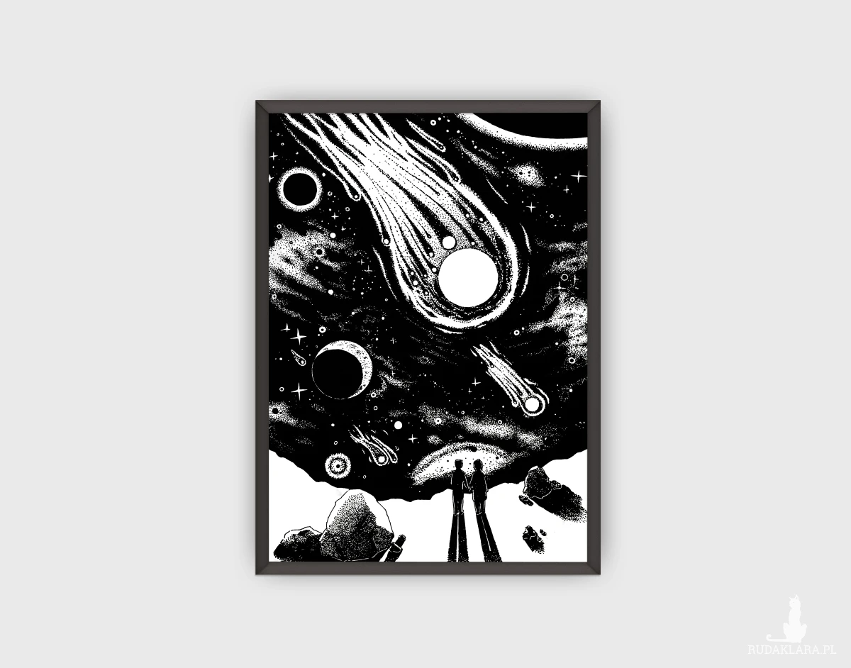 Duży ten Kosmos, co? Cyfrowa reprodukcja ilustracji narysowanej cienkopisami.