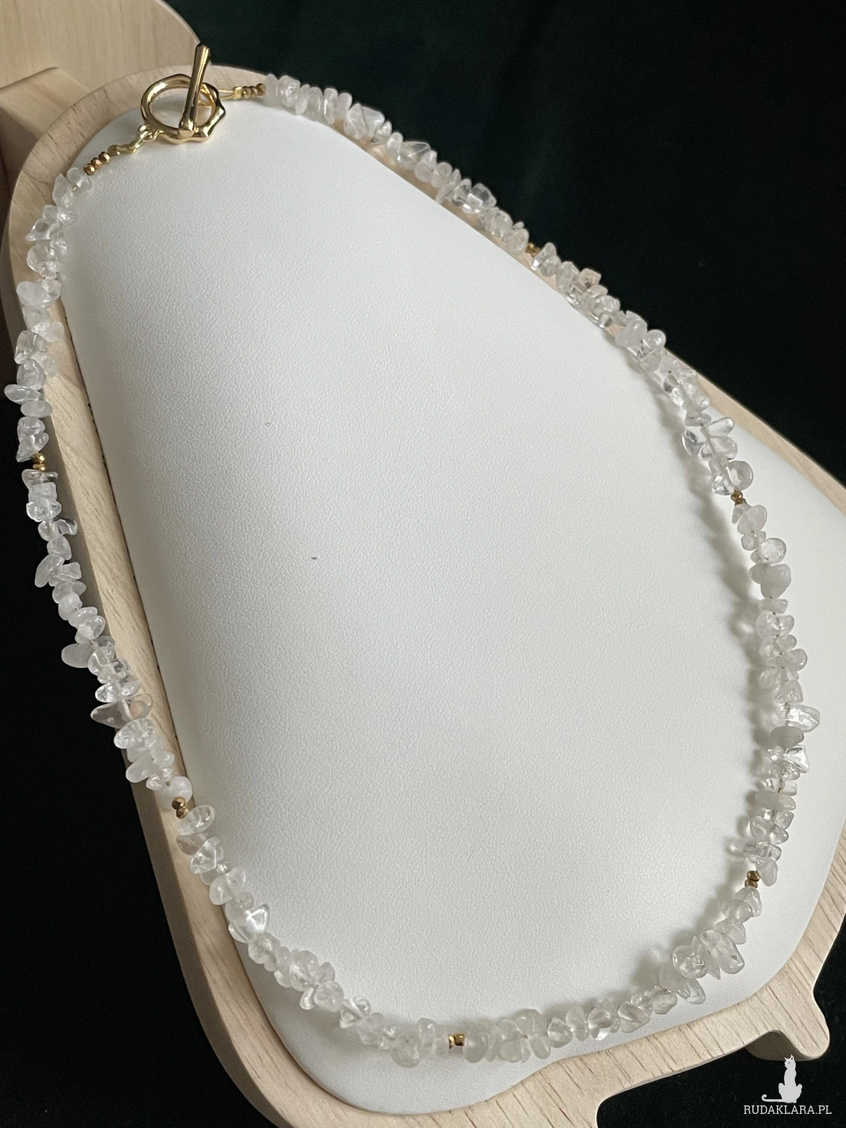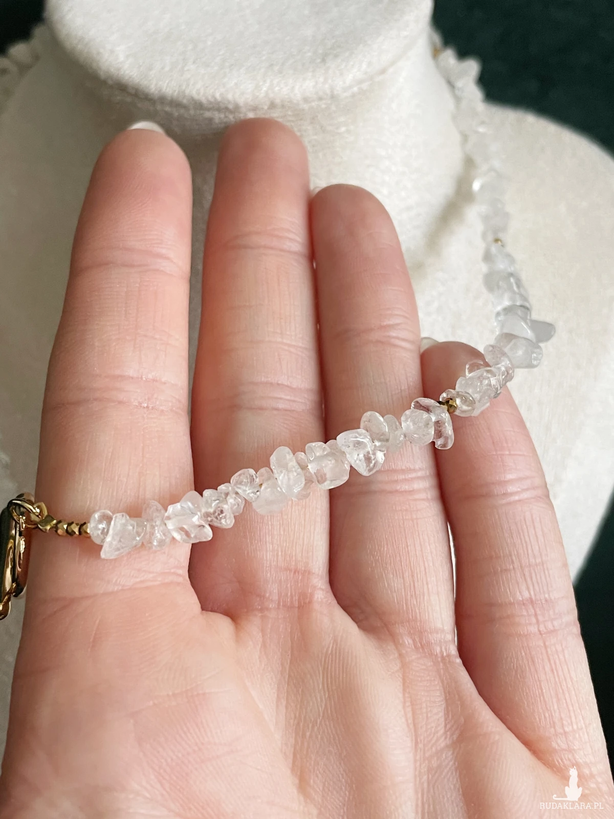 Ręcznie wykonany z kamieni naturalnych Kryształu górskiego i hematytu złotego.