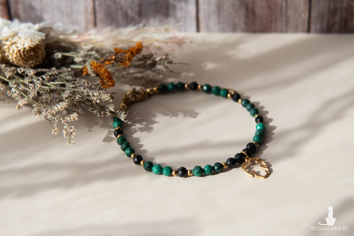 Bransoletka MONSTERA DARK z kamieni - malachit i turmalin czarny (4 mm) oraz z elementów ze stali nierdzewnej. Ten zestaw kamieni jest szczególnie polecany osobom spod znaku Byka, Koziorożca i Skorpiona.