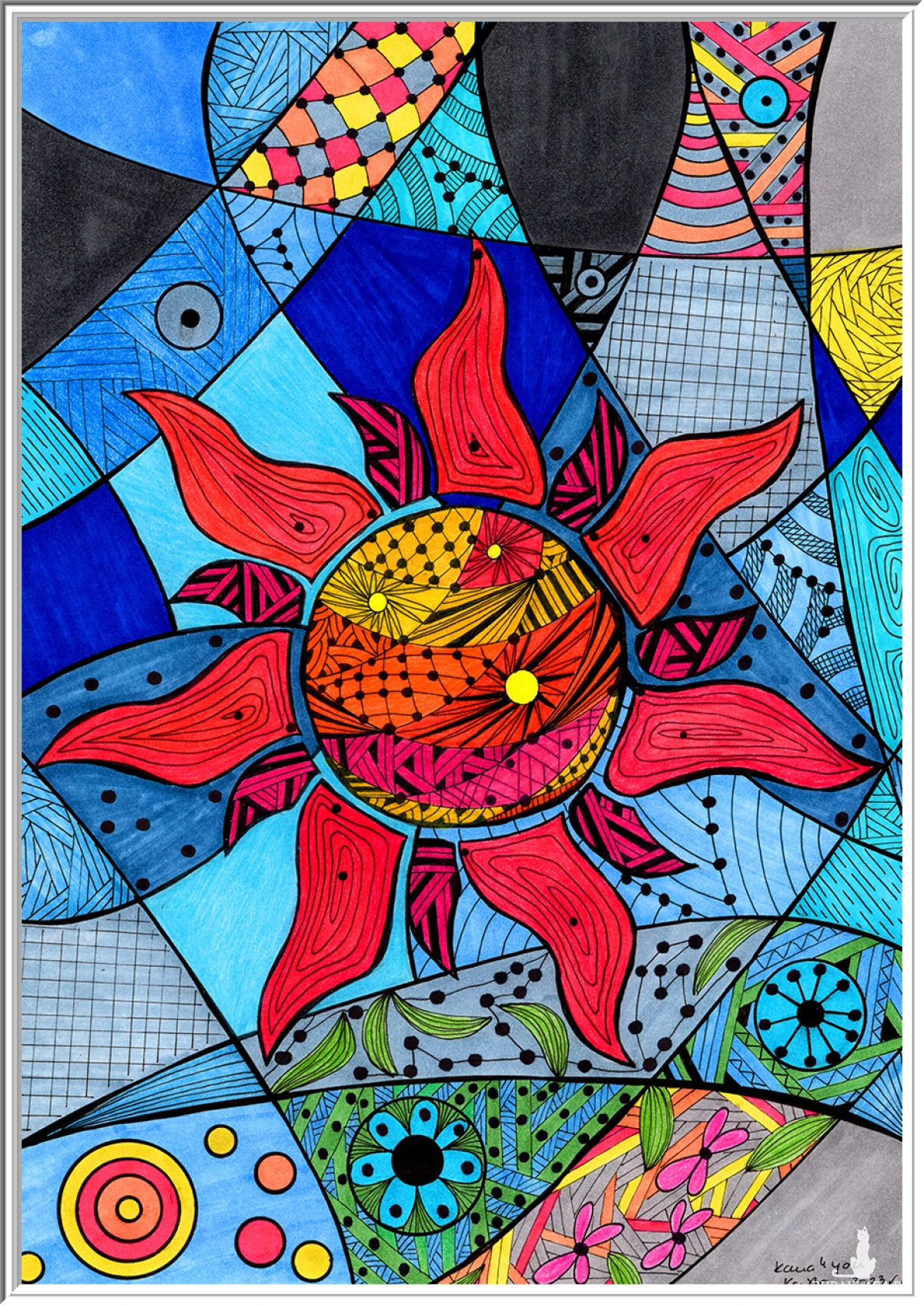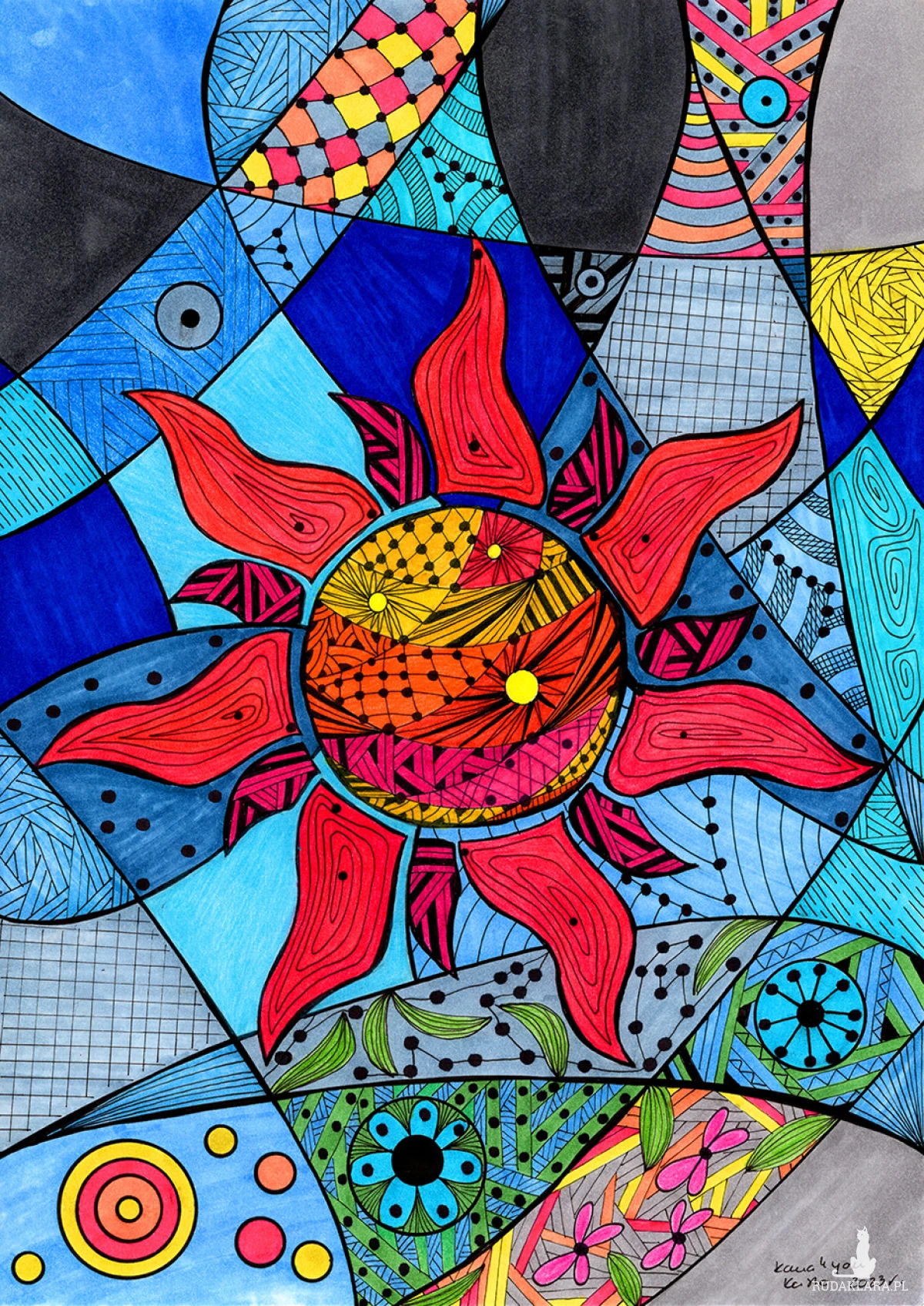 Ekspresyjna, geometryczna ilustracja z dominującym, płonącym słońcem o intensywnie czerwonych i pomarańczowych promieniach. Słońce otoczone jest chaosem abstrakcyjnych, ostrych kształtów  w odcieniach chłodnego błękitu i szarości, co podkreśla kontrast termiczny. Słońce i tło wypełnione są skomplikowanymi wzorami liniowymi, tworząc wrażenie gorąca, wibracji i dramatycznego napięcia między palącym żywiołem a otaczającym go światem.