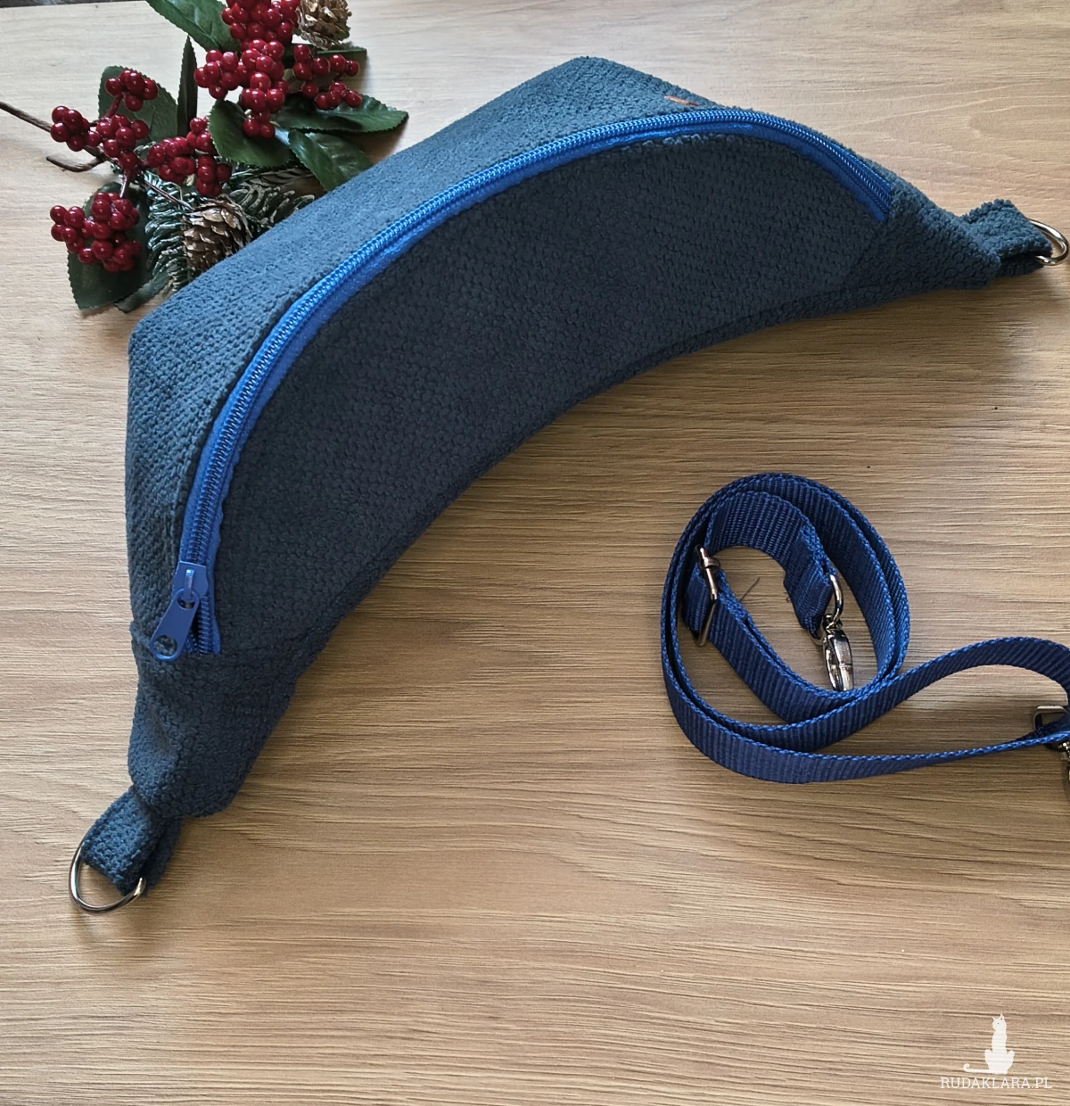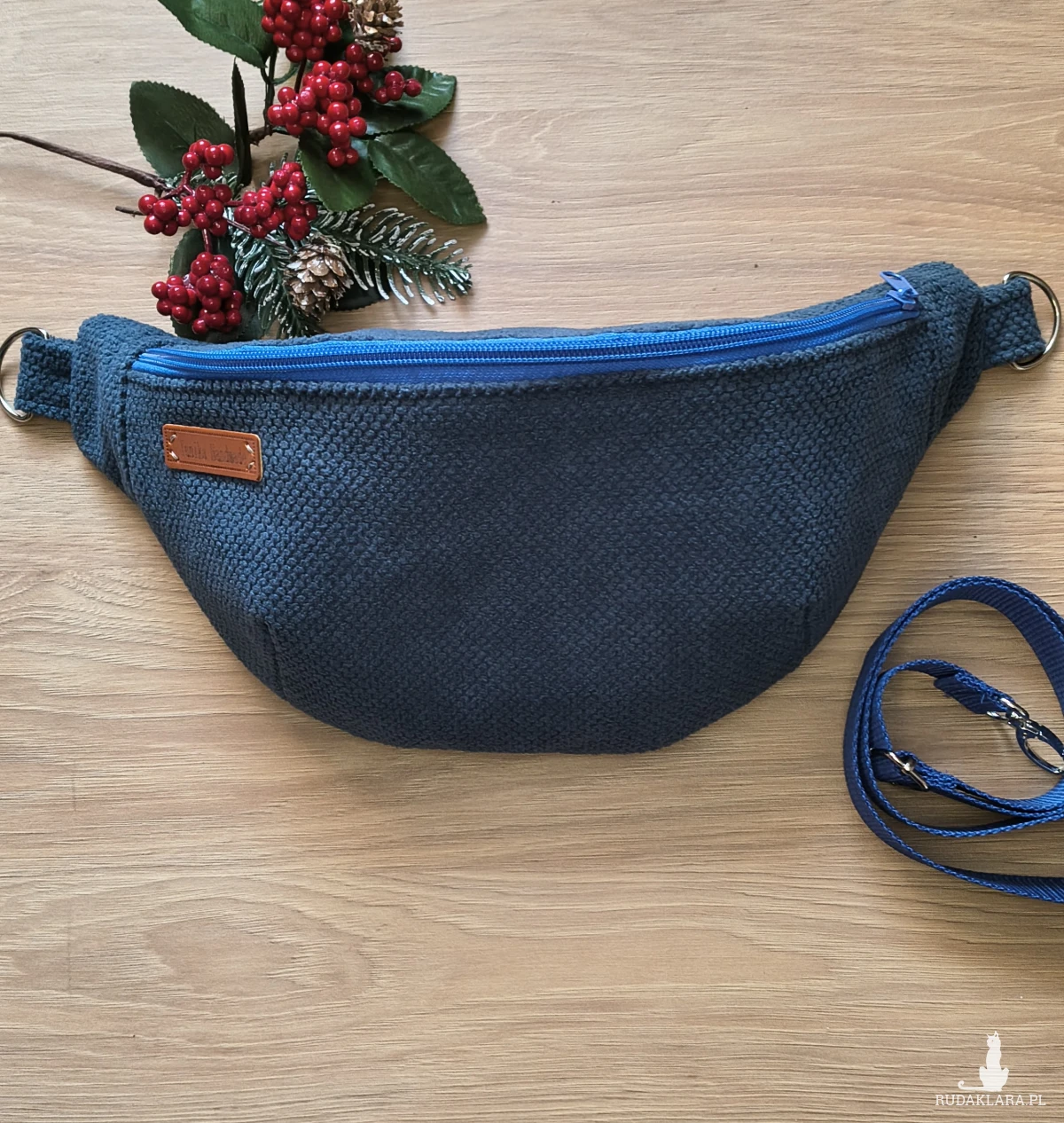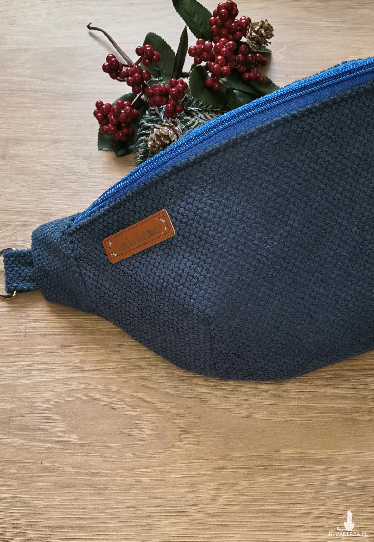 Klasyczna granatowa nerka o pięknym, eleganckim wykończeniu. Uszyta z trwałej, miękkiej w dotyku tkaniny tapicerskiej o wyraźnej strukturze, która dodaje jej charakteru i sprawia, że świetnie prezentuje się w każdej stylizacji – zarówno codziennej, jak i bardziej eleganckiej.