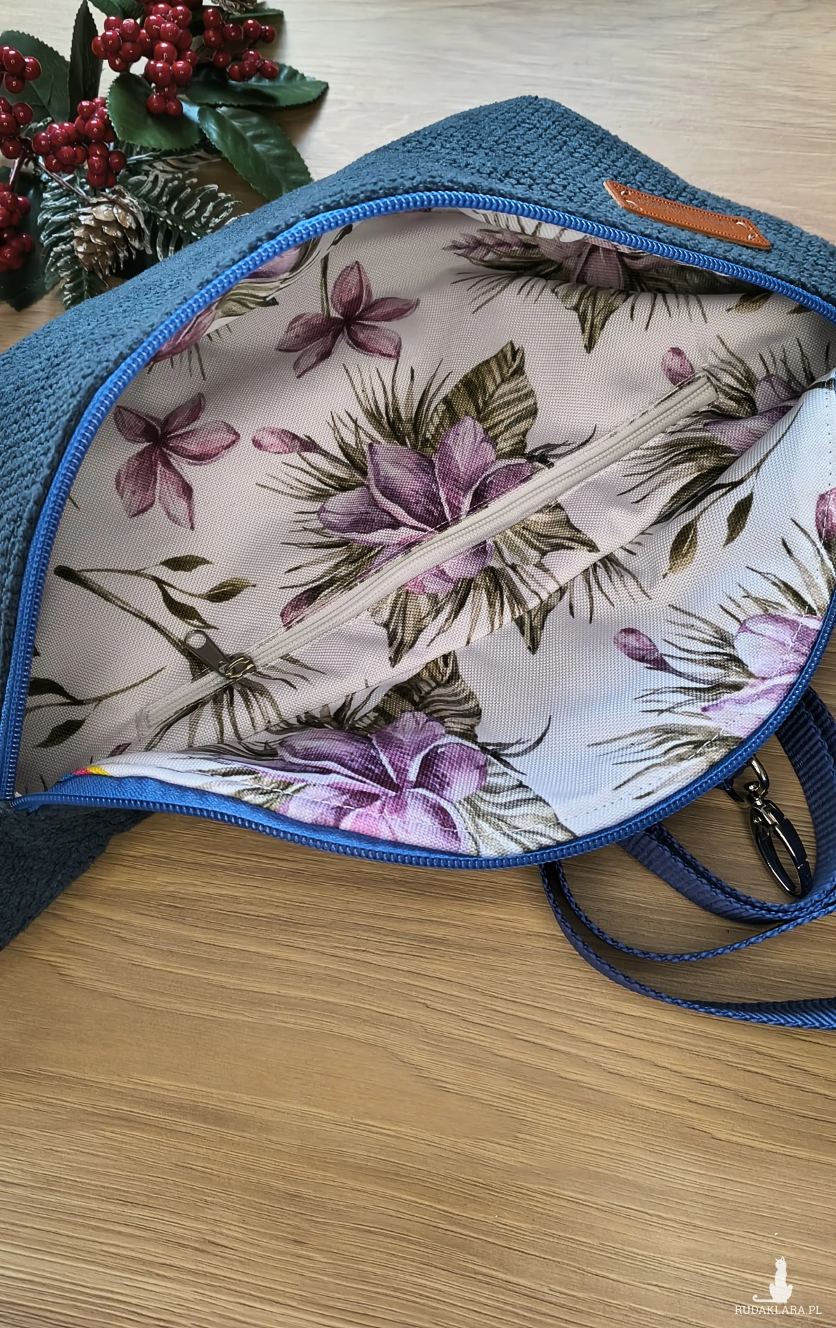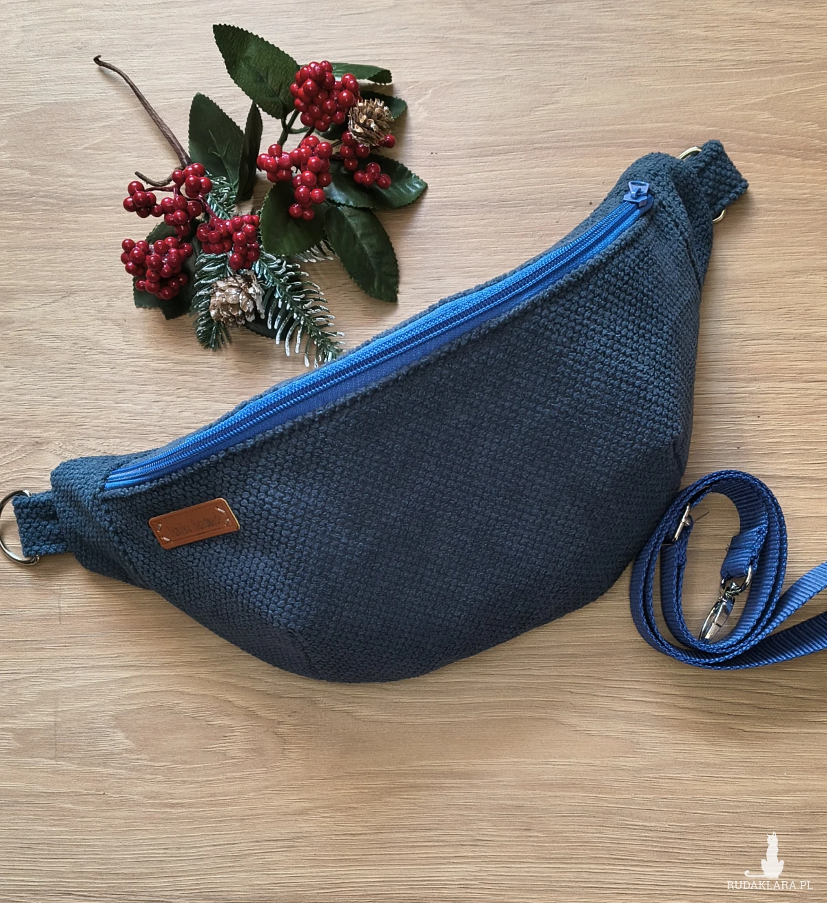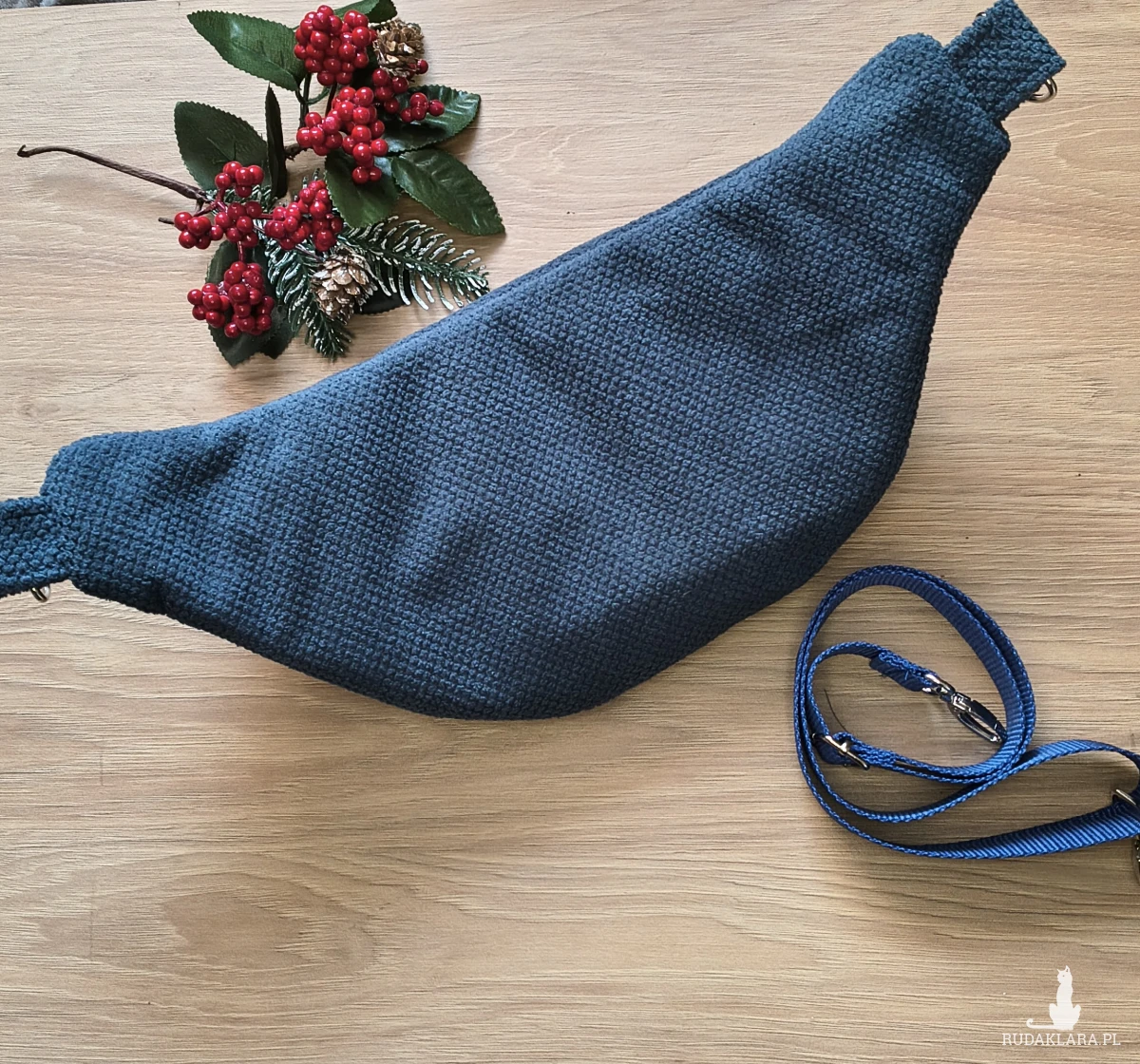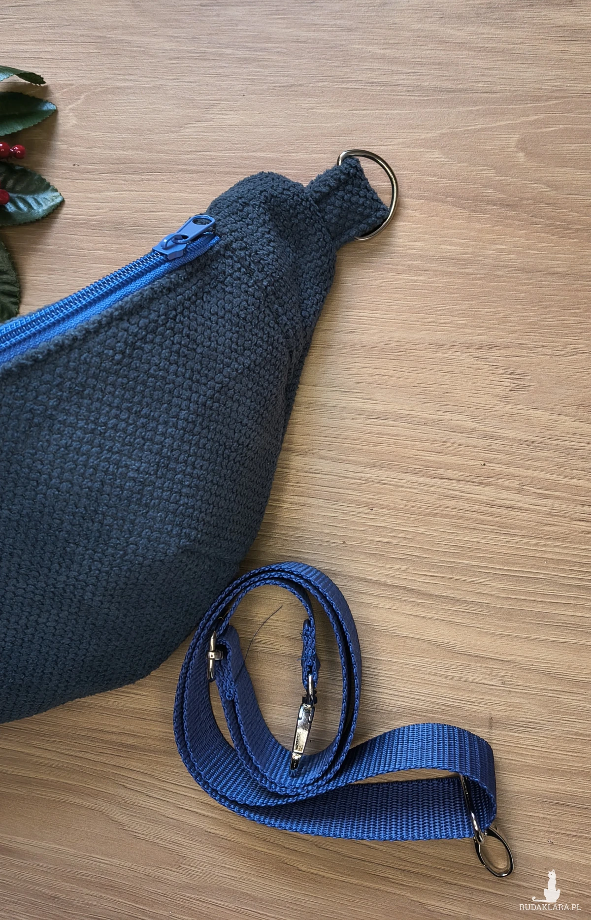 Klasyczna granatowa nerka o pięknym, eleganckim wykończeniu. Uszyta z trwałej, miękkiej w dotyku tkaniny tapicerskiej o wyraźnej strukturze, która dodaje jej charakteru i sprawia, że świetnie prezentuje się w każdej stylizacji – zarówno codziennej, jak i bardziej eleganckiej.
