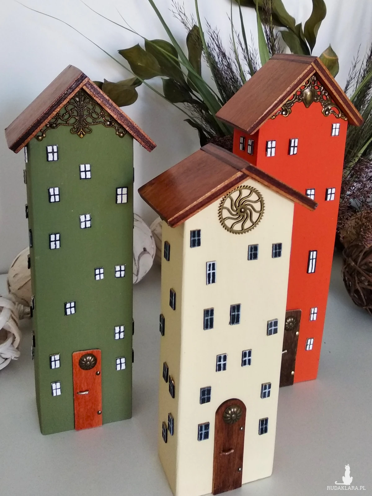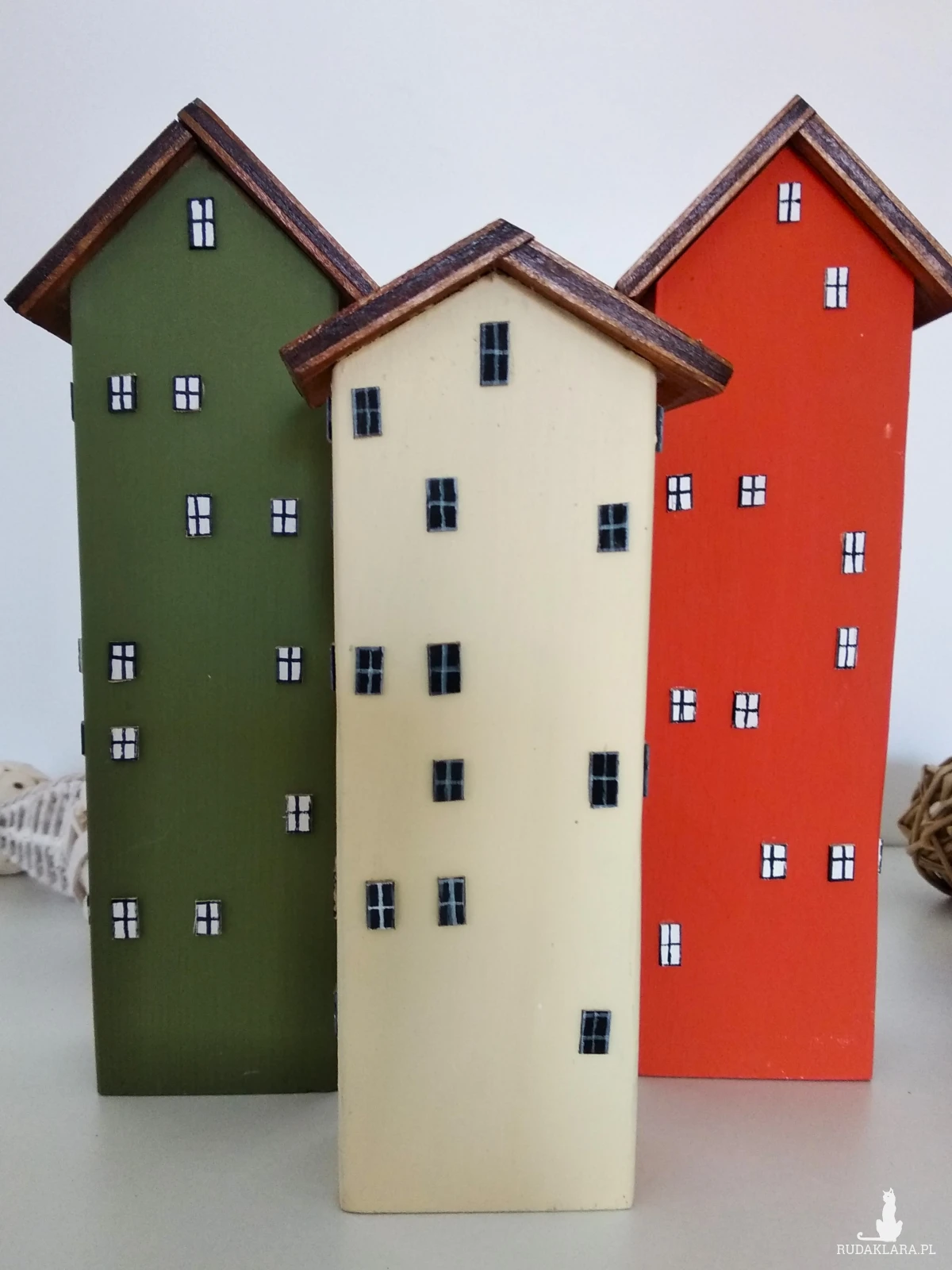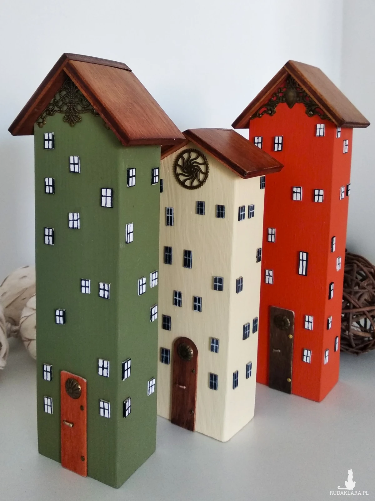 Zestaw ręcznie wykonanych domków z drewna sosnowego, malowanych farbą akrylową. Naturalna baza materiału w połączeniu z wyrazistymi kolorami nadaje im lekkości, a bejcowane i lakierowane daszki podkreślają strukturę drewna. Całość uzupełniają metalowe oraz dekoracyjne elementy, które dodają charakteru i subtelnej elegancji.