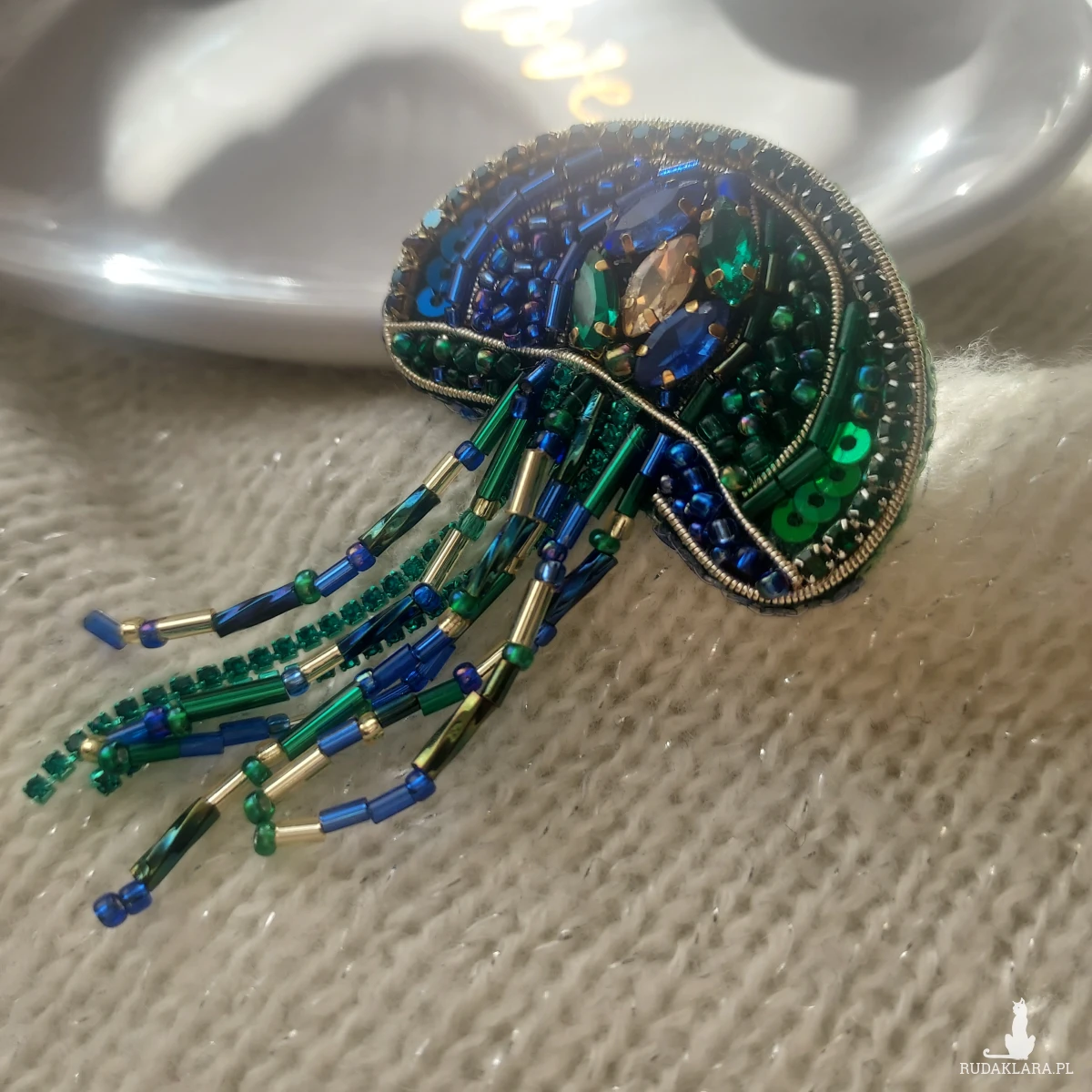 Zanurz się w świat morskich głębin z wyjątkową, cudowną broszką MEDUZĄ w pięknym kolorze kobaltu oraz głębokiej zieleni w odcieniu szmaragdu.