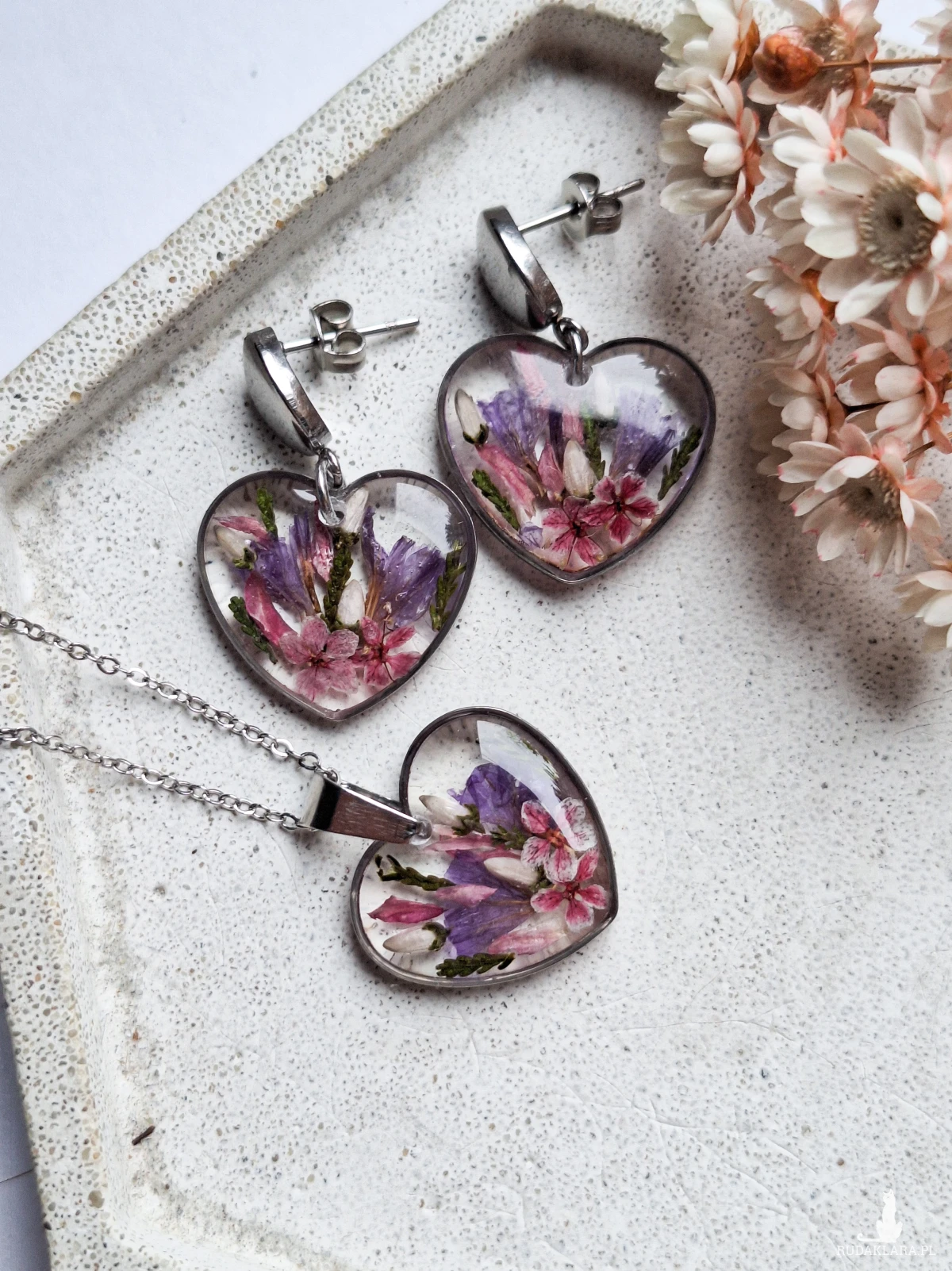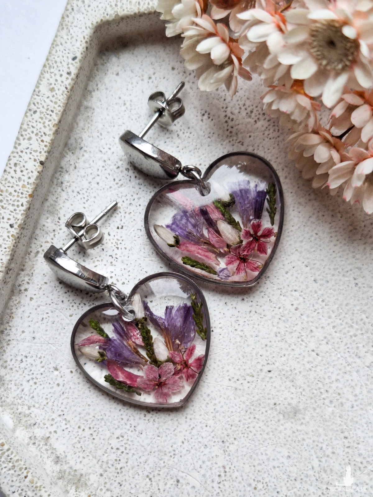Urocze kolczyki w kształcie serca z zatopionymi kwiatami. Wykonane z wysokiej klasy żywicy, która nie zmienia koloru pod wpływem promieniowania UV oraz wysokiej jakości stali chirurgicznej.