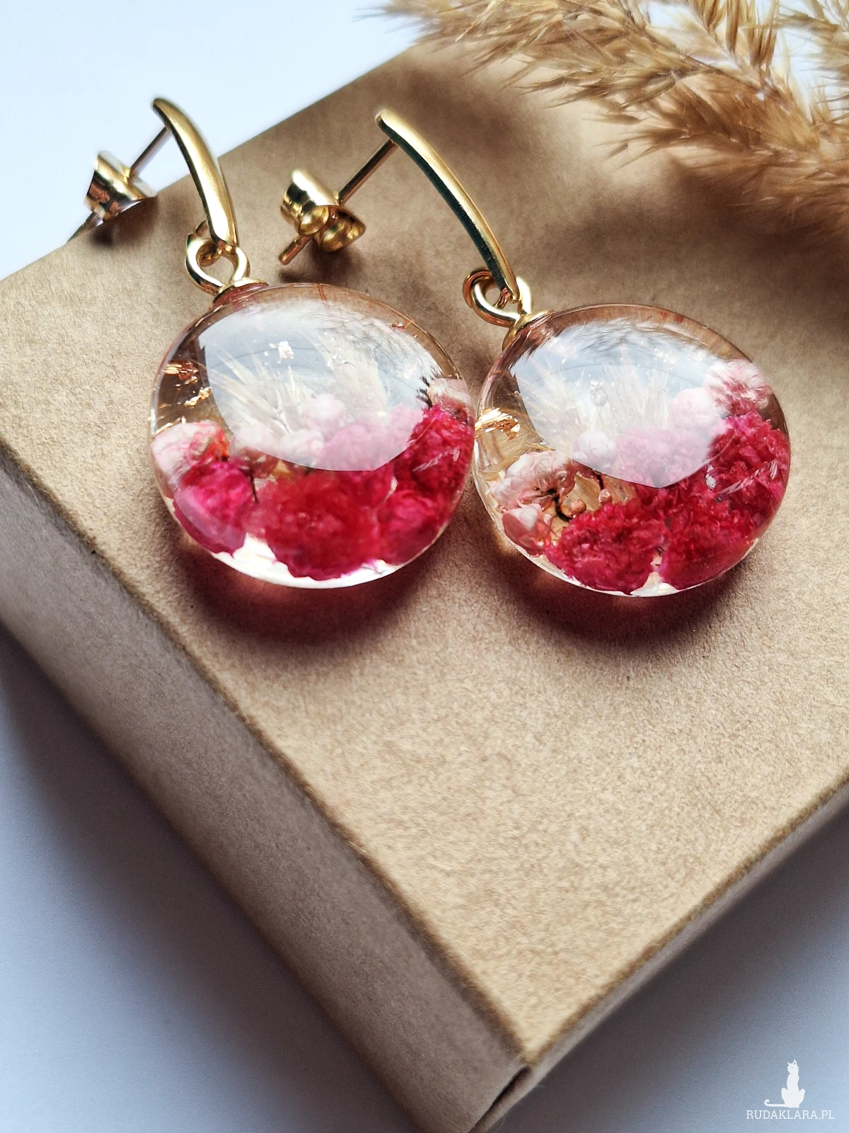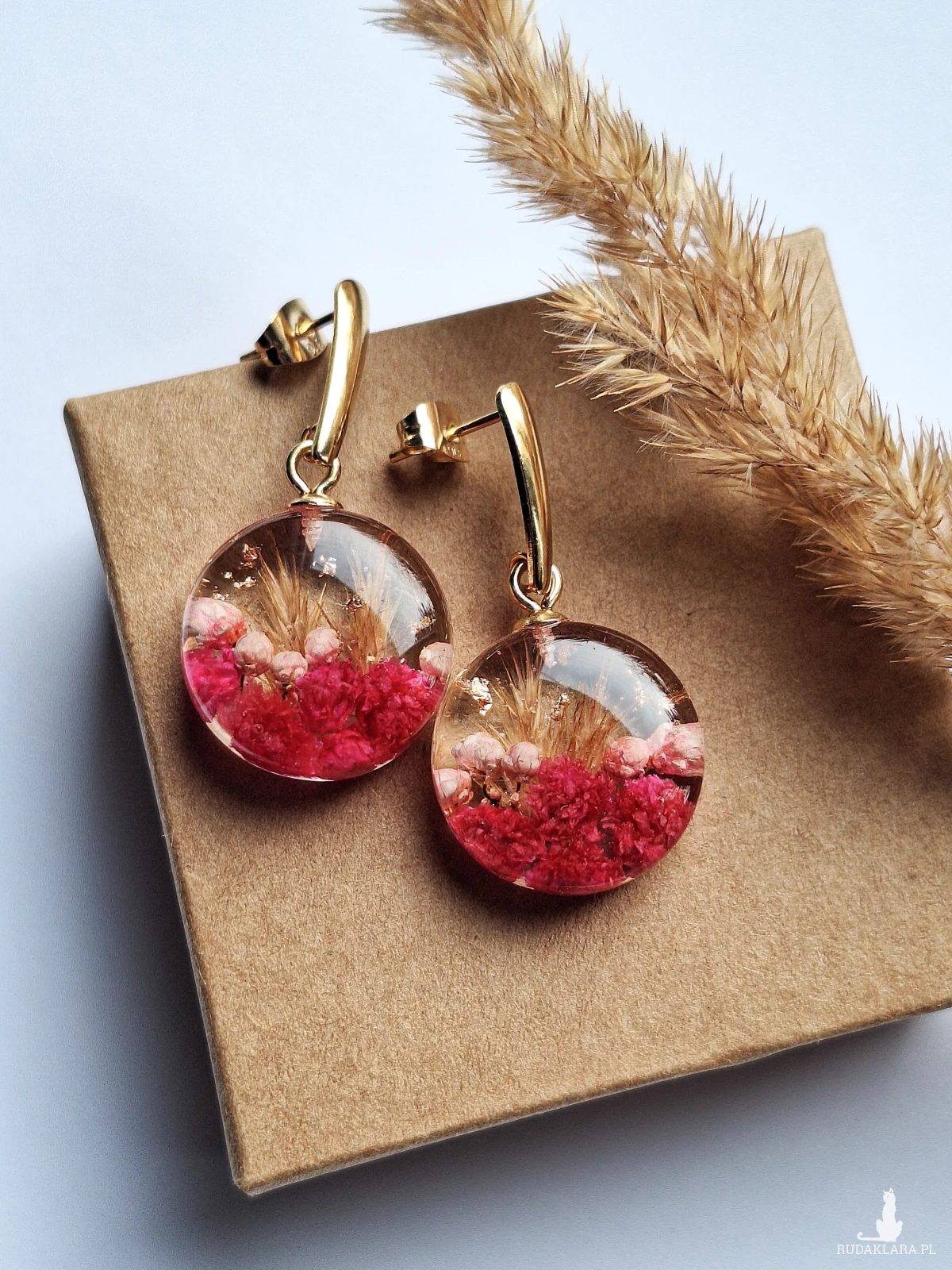 Urocze kolczyki z zatopionymi kwiatami gipsówki w kolorze fuksji, różowym ozothumnusem, trawą i płatkami złota. Wykonane z wysokiej klasy żywicy, która nie zmienia koloru pod wpływem promieniowania UV oraz wysokiej jakości stali chirurgicznej.