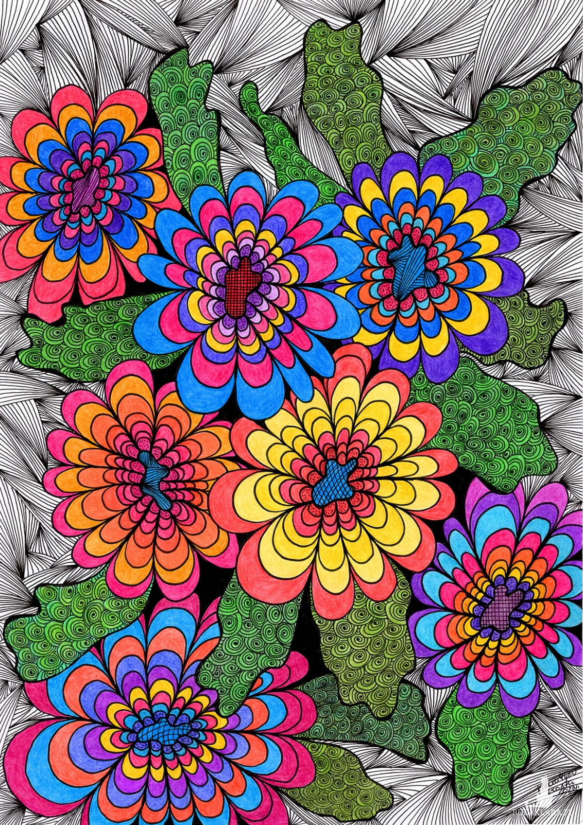 Intensywna, psychodeliczna ilustracja przedstawiająca grupę siedmiu stylizowanych kwiatów, ułożonych ciasno na pierwszym planie. Każdy kwiat charakteryzuje się kontrastowymi, nasyconymi kolorami (błękit, żółć, pomarańcz, purpura, róż), co tworzy efekt wibrującej optycznie feerii barw. Kwiaty otoczone są zielonymi liśćmi wypełnionymi organicznymi spiralnymi wzorami. Całość osadzona jest na gęstym, czarno-białym tle z promieniście rozchodzącymi się liniami, co potęguje wrażenie eksplozji, dynamiki i czystej, nieokiełznanej radości.