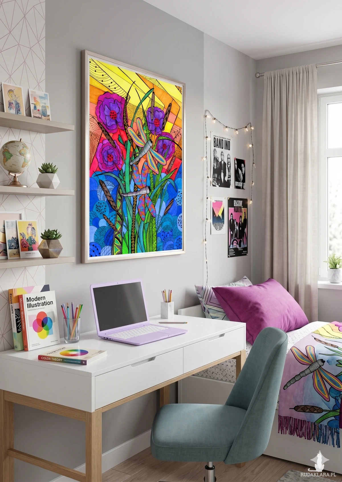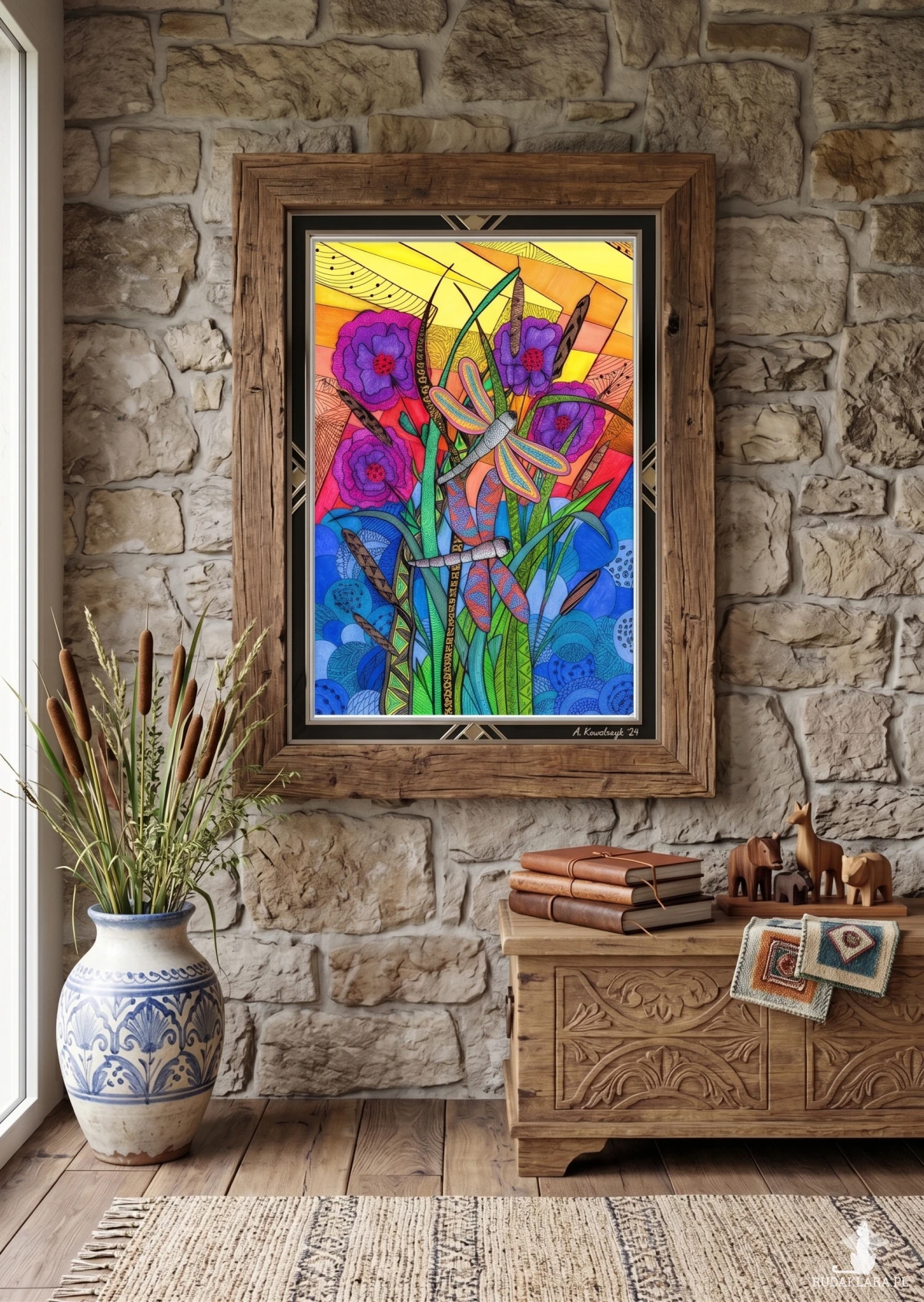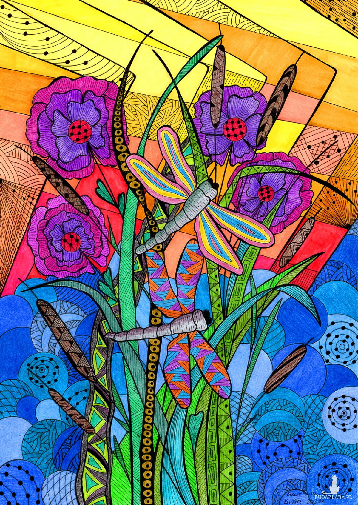 Intensywna, barwna ilustracja przedstawiająca scenę nad wodą. Kompozycja zdominowana jest przez bujne, stylizowane trzciny (pałki wodne), kwiaty o purpurowych płatkach oraz dwie geometrycznie stylizowane ważki o jaskrawo ubarwionych ciałach. Woda i niebo (tło) są wypełnione gęstymi, hipnotycznymi wzorami liniowymi (spirale, linie, zygzaki) w odcieniach błękitu, żółci i czerwieni, co nadaje całości wibrujący, psychodeliczny charakter, symbolizujący dynamiczne, eteryczne życie.