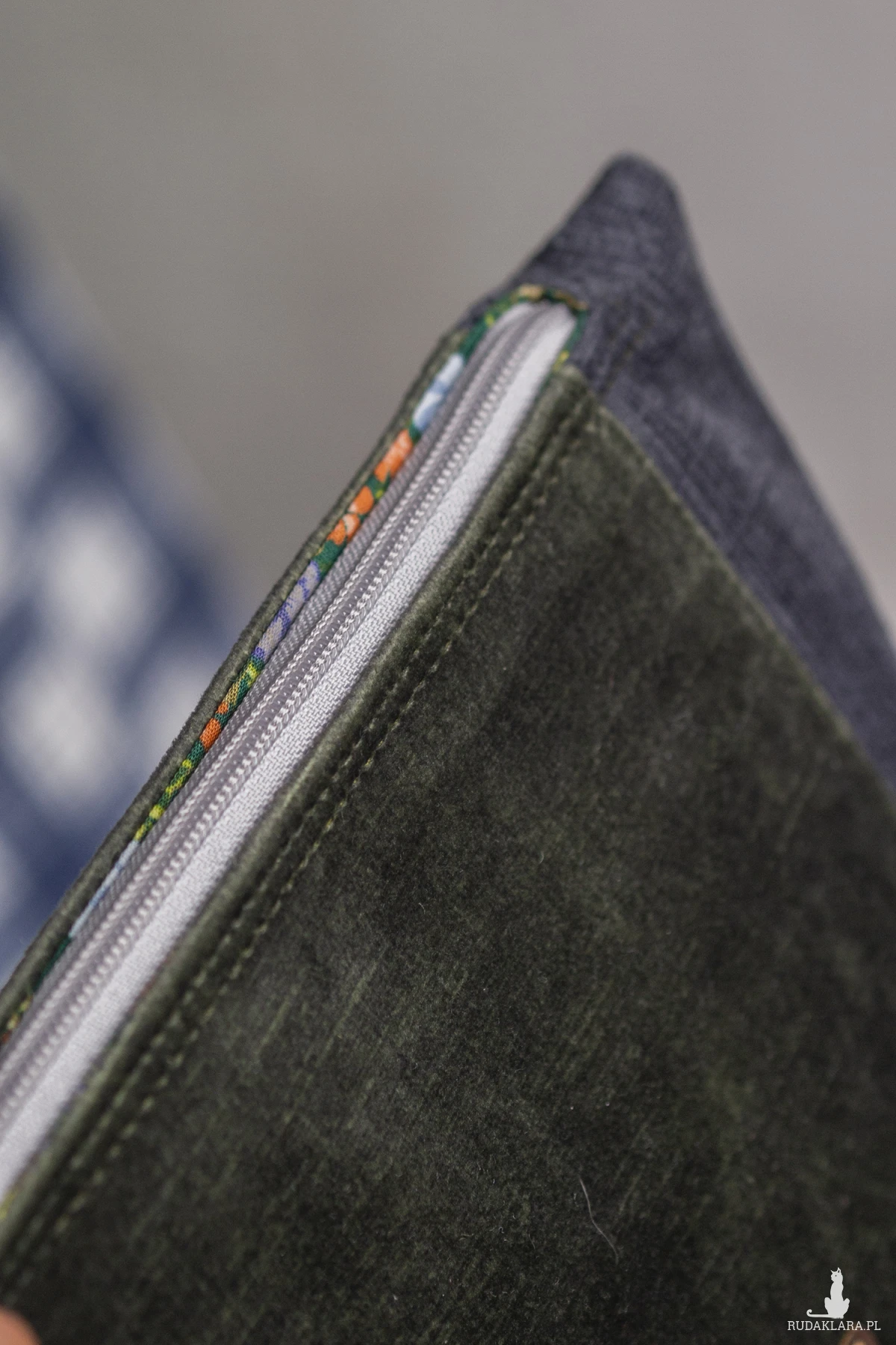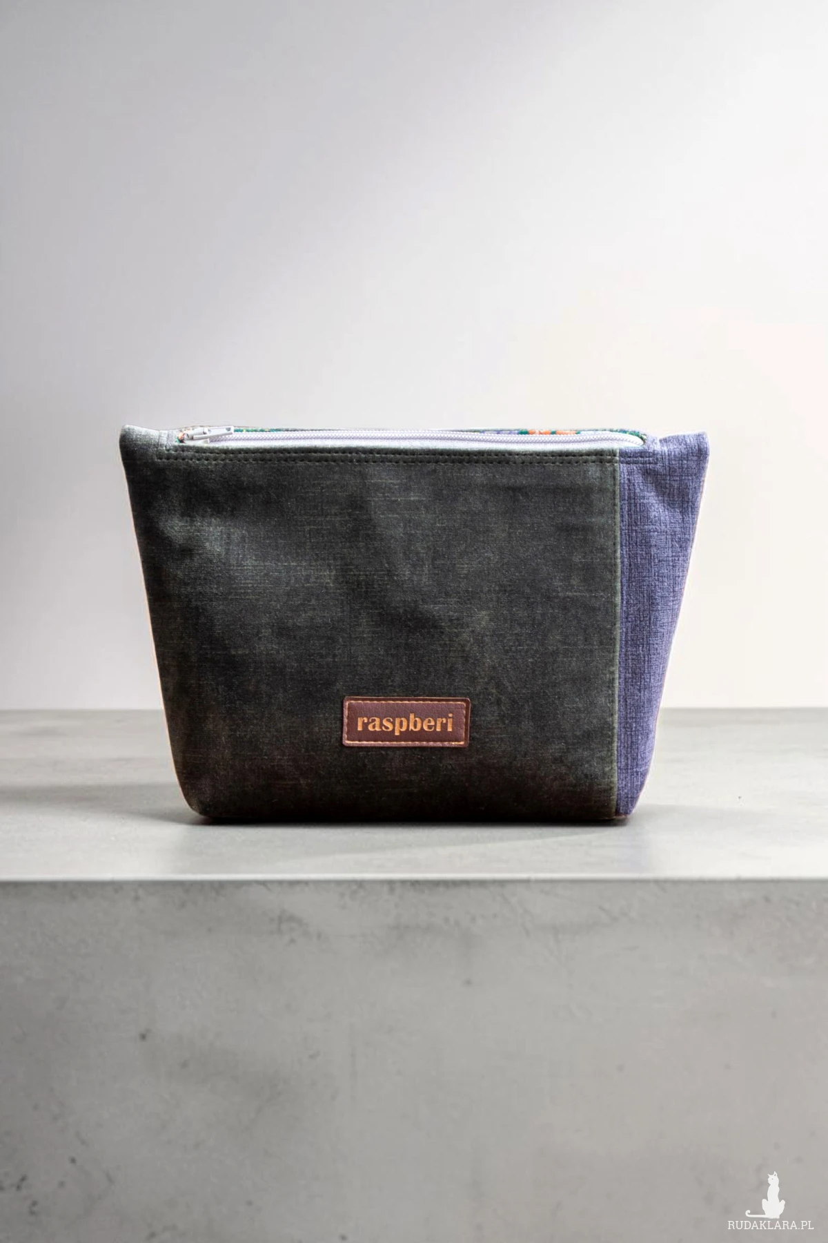 Duża kosmetyczka w kolorze zielono-szarym. Stworzona w duchu no waste.