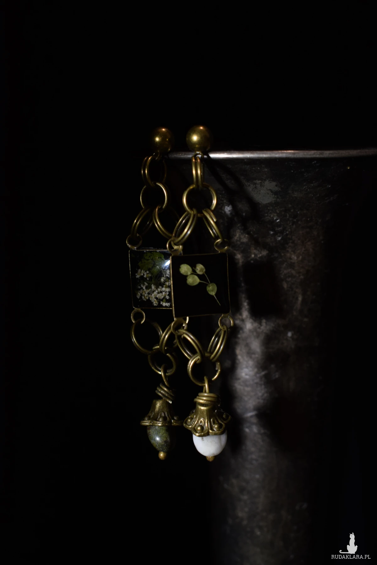 Kolczyki w kolorze antycznego złota z zatopionymi w żywicy roślinami w tym kwiatem dzikiej marchewki. Dodatkiem są kamienie naturalne zielony jaspis i biały howlit.