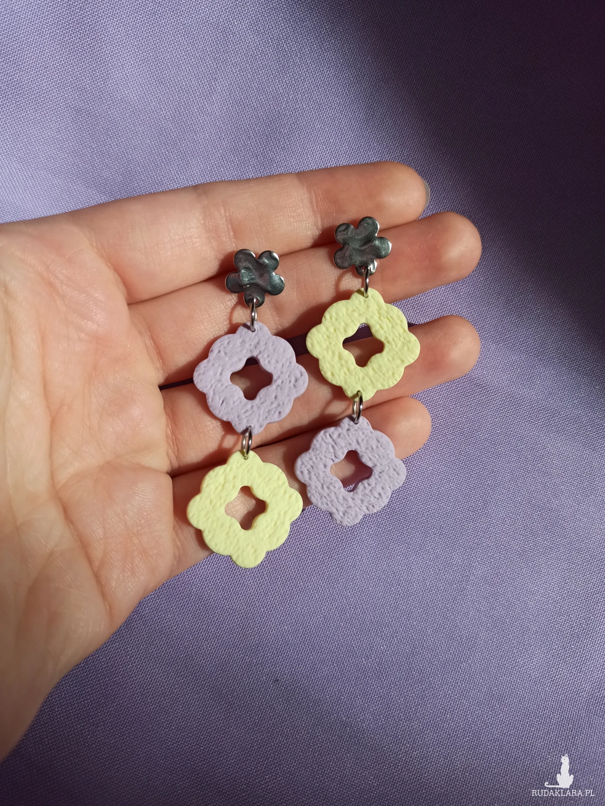 Kolczyki w kształcie asymetrycznych kwadratów w kolorach pastelowo fioletowym i żółtym z ozdobnym sztyftem w kształcie kwiatka.