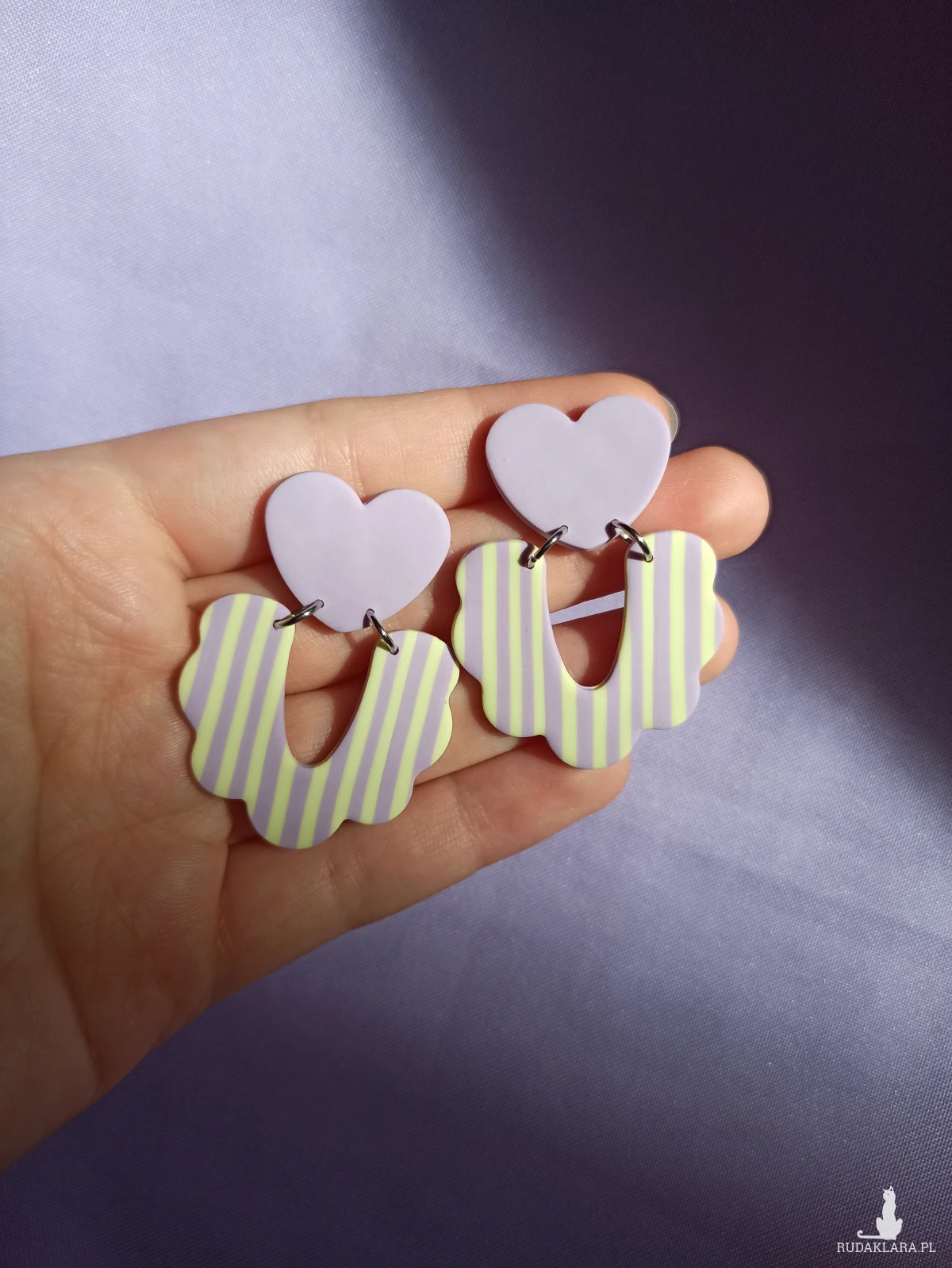 Kolczyki duże sztyfty fioletowe serca połączone z łukiem w pastelowo fioletowe i żółte paski.