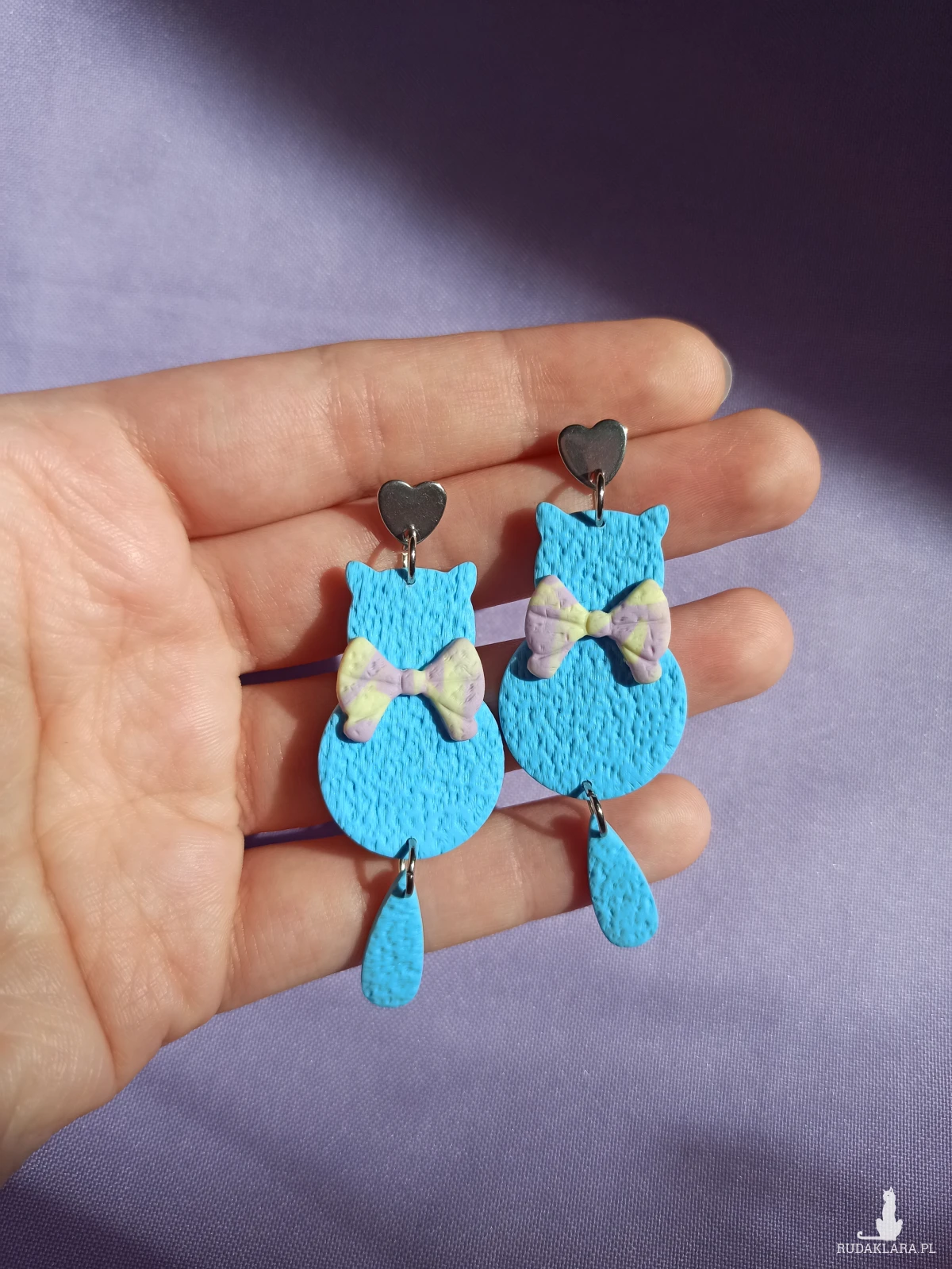 Kolczyki wiszące w kształcie niebieskich kotków z kokardkami w pastelowo fioletowe i żółte ciapki. Całość na ozdobnym sztyfcie w kształcie serca.