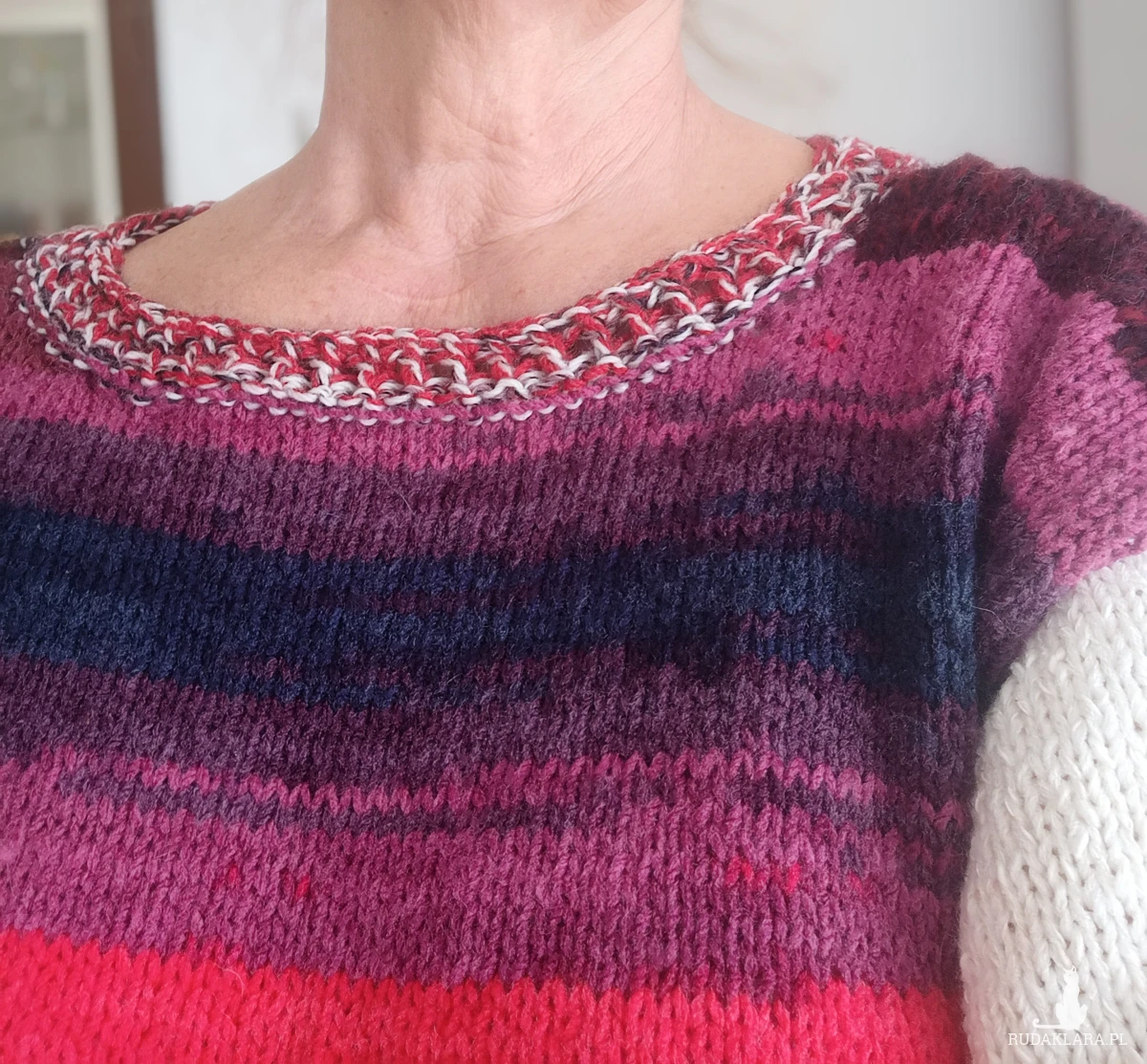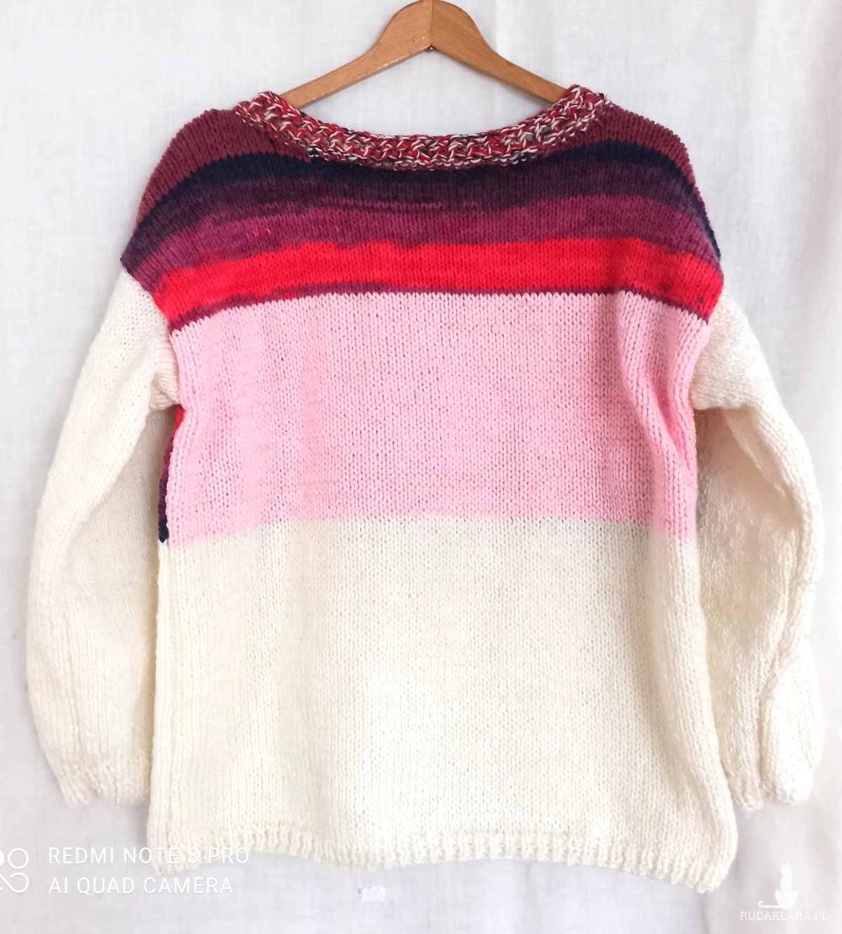 Sweter w łódeczkę kolorowy oversize z długimi rękawami. Rękawy i części przodu i tyłu biało-ecru. Średniej grub0ści, wykonany ręcznie na drutach. Wykonany z przyjemnej w dotyku włóczki wełniano-akrylowej. Zastosowane kolory /oprócz biało-ecru/ to różowy oraz cieniowana nić merino w czerwieni, burgund, buraczkowy, granat i brąz. Kolory te świetnie współgrają z jasnym. Pliska ozdobna jakby plecionka swobodnie otacza szyję. Ściągacze u dołu sweterka i przy rękawach wykonane oczko lewe, oczko prawe. Całość wykonana oczkami prawymi. Nie drapie. Opadające ramiona przedłużają długość rękawa. Wspaniały look do spódnicy i spodni, stanowi elegancką kompozycję w połączeniu z nimi. Pranie wyłącznie ręczne w kąpieli do 30 stopni.