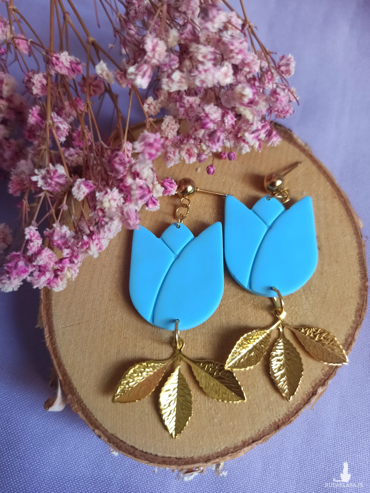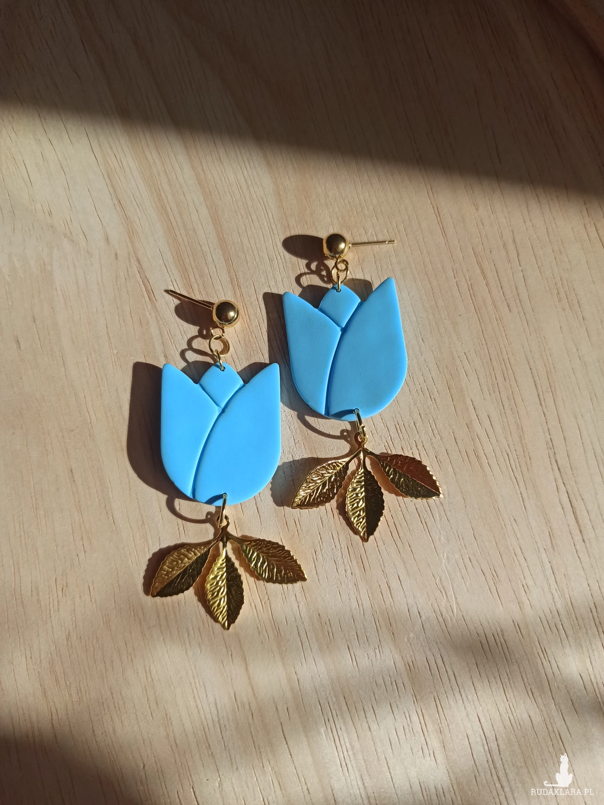 Kolczyki w kształcie tulipanów w kolorze błękitnym z ozdobnymi złotymi listkami.