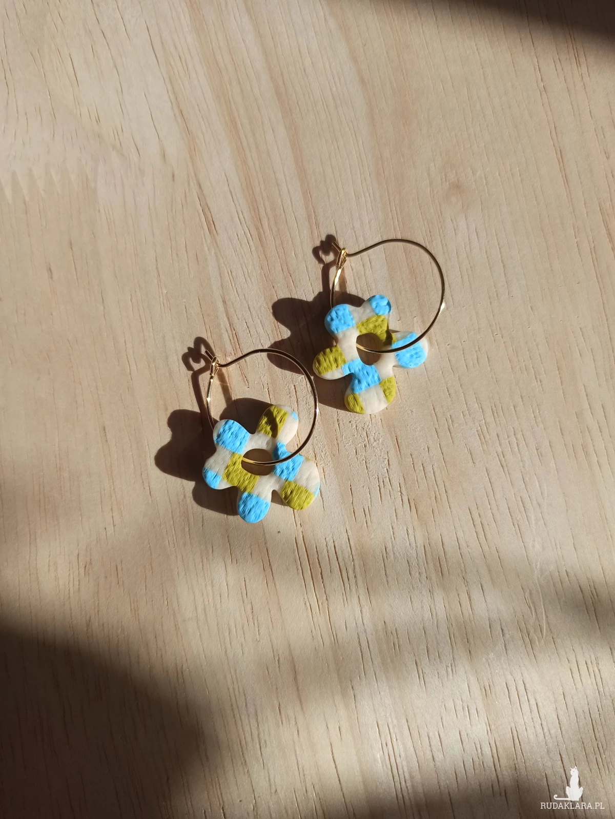 Kolczyki w kształcie organicznych kwiatków na kole w kolorową kratkę. Oliwkowy błękitny i ecru.