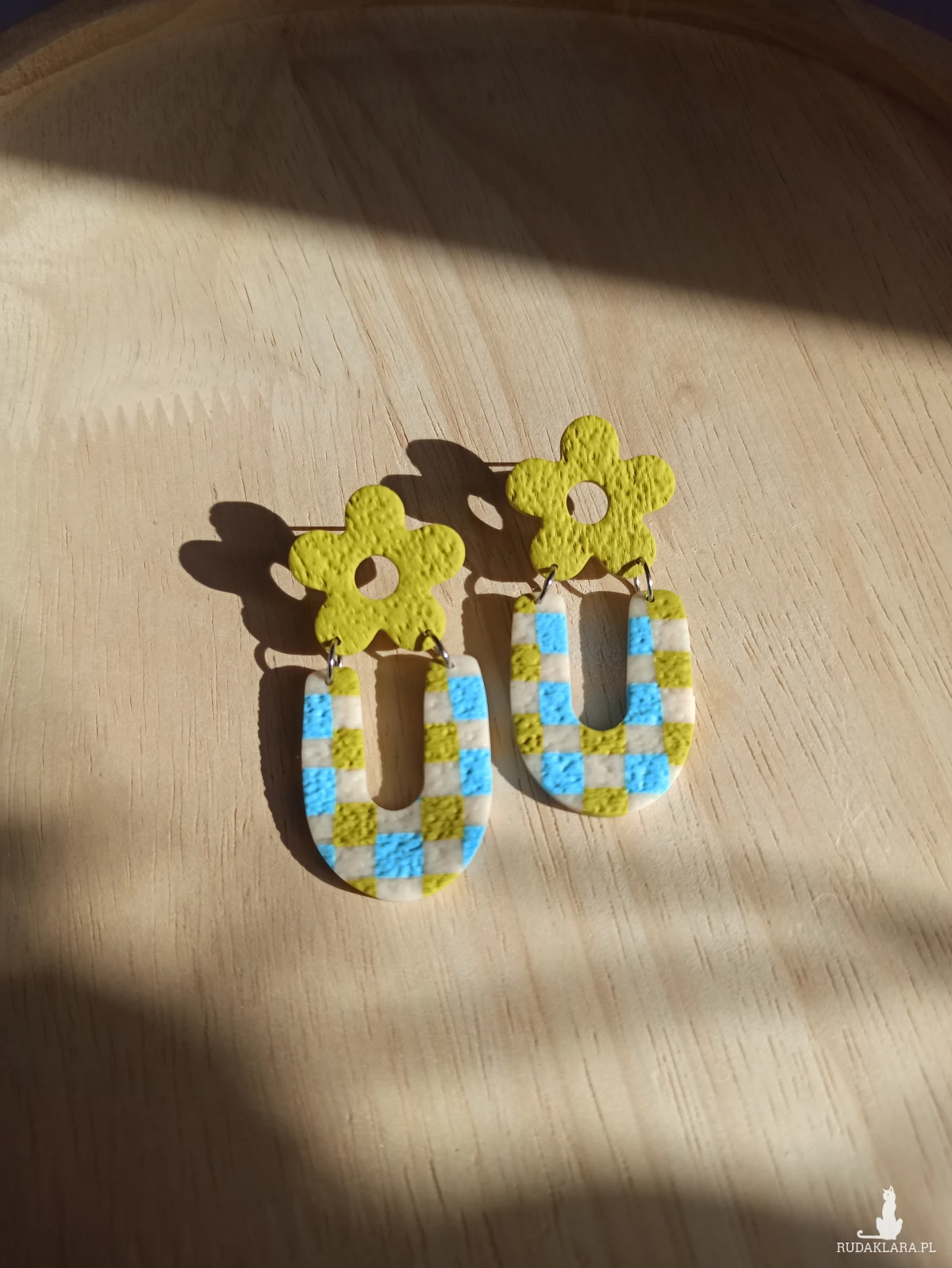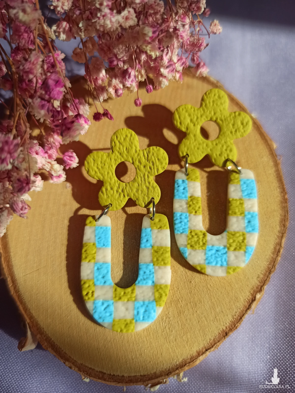 Kolczyki w kształcie oliwkowych kwiatów i łuków w kolorową kratkę. Oliwkowy błękitny i ecru.