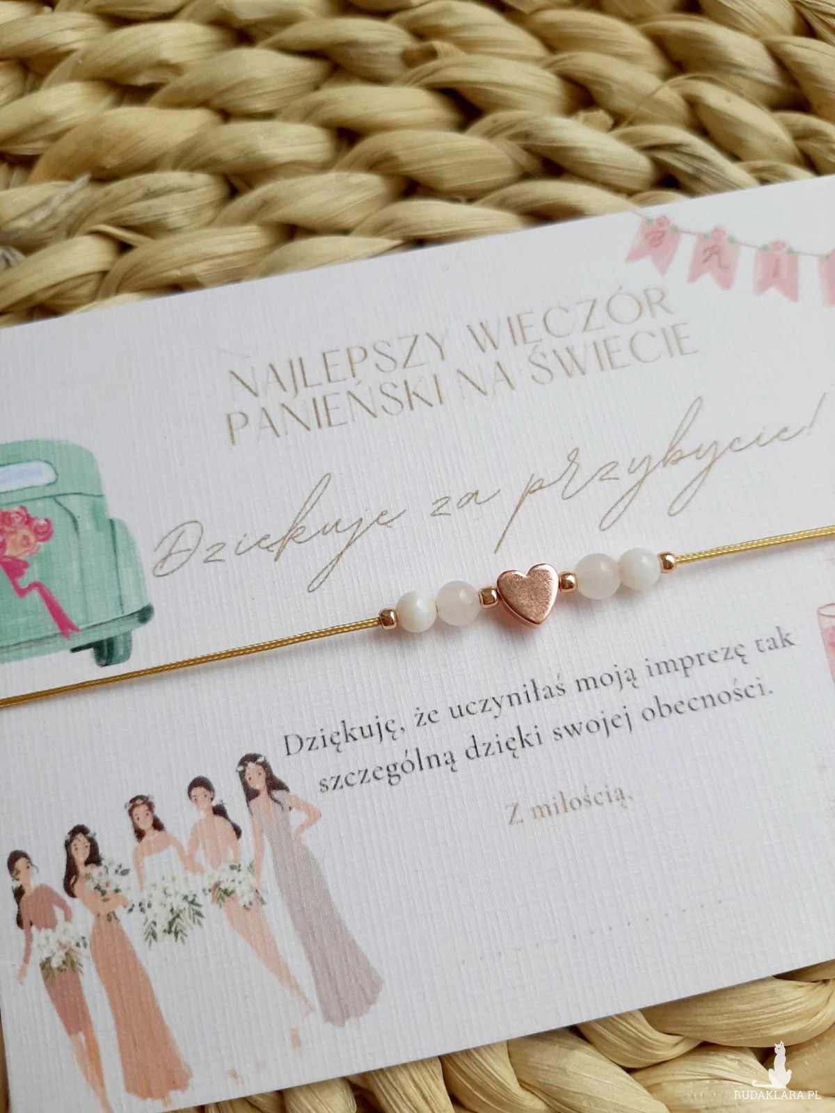 Do każdej bransoletki dołączona jest ozdobna wkładka (np. podziękowanie za przybycie na wieczór panieński).