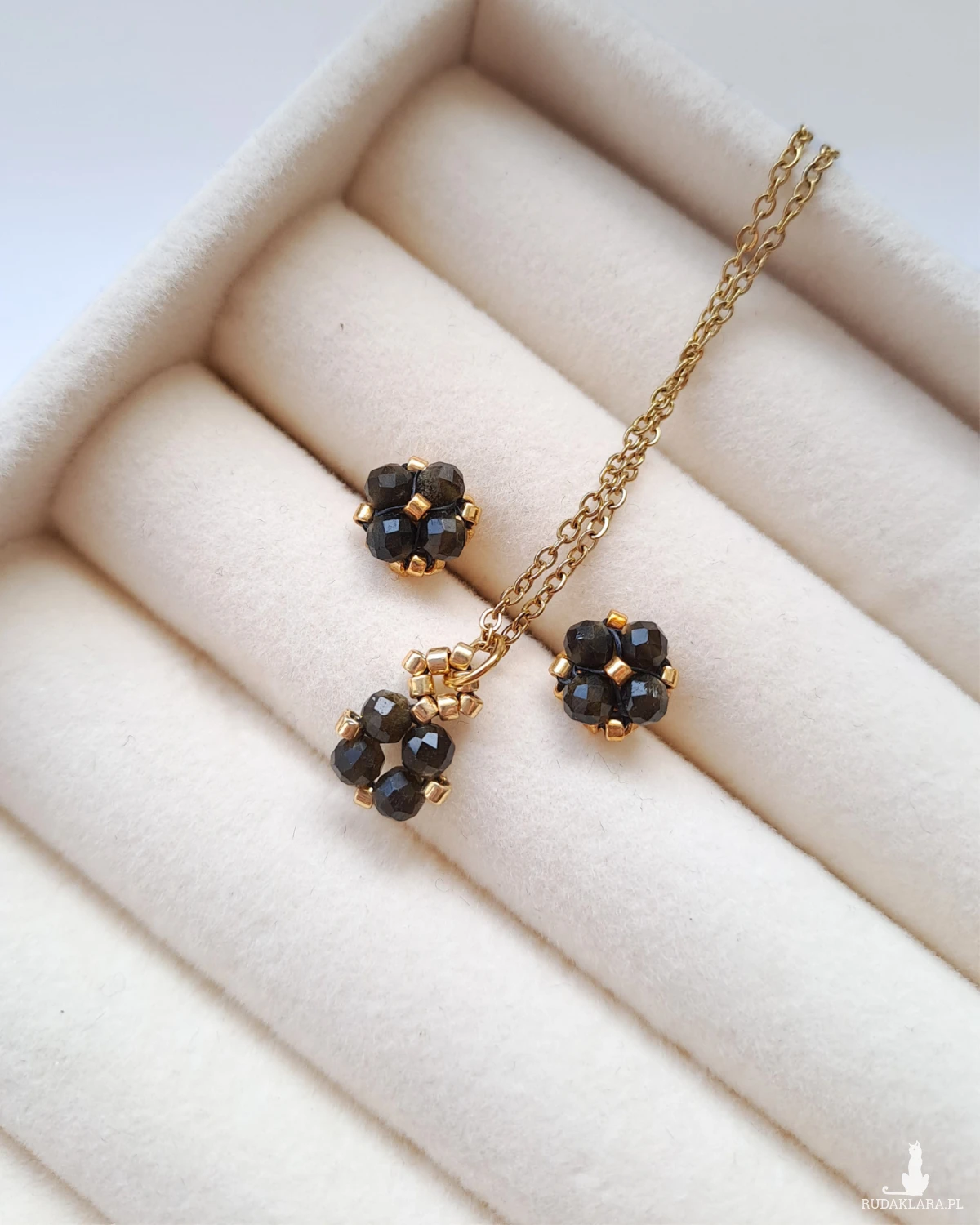 Komplet Biżuterii Obsydian Złocisty - Kolczyki Sztyfty i Naszyjnik